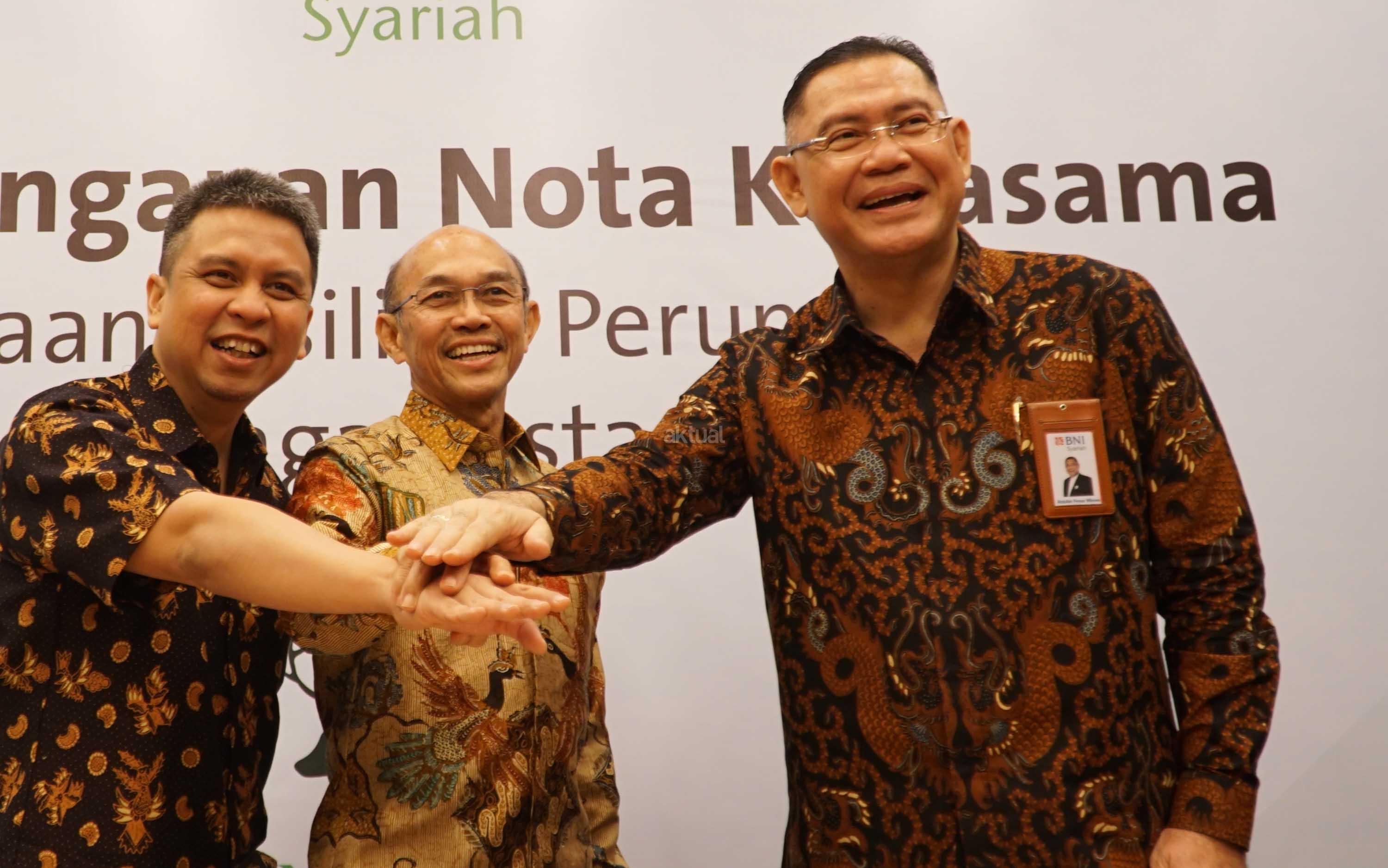(Ki-Ka ) Ridzki Kramadibrata, Managing Director PT Grab Indonesia, Suhendro Prabowo, Wakil Presiden Direktur & COO PT Intiland Development Tbk, Abdullah Firman Wibowo, Direktur Utama PT Bank BNI Syariah bertumpu tangan usai melakukan penandatangan penyediaan fasilitas perumahan di Jakarta, Rabu (8/8). Perusahaan pengembang properti PT Intiland Development Tbk bersama PT Grab Indonesia dan PT Bank BNI Syariah menjalin sinergi kerjasama strategis berupa penyediaan fasilitas perumahan dan pembiayaan bagi para Mitra Grab Indonesia di Kawasan perumahan Talaga Bestari,Tangerang. Talaga Bestari merupakan salah satu pengembangan proyek kawasan hunian terpadu yang modern seluas 308 hektar yang dikembangkan Intiland. AKTUAL/Eko S Hilman