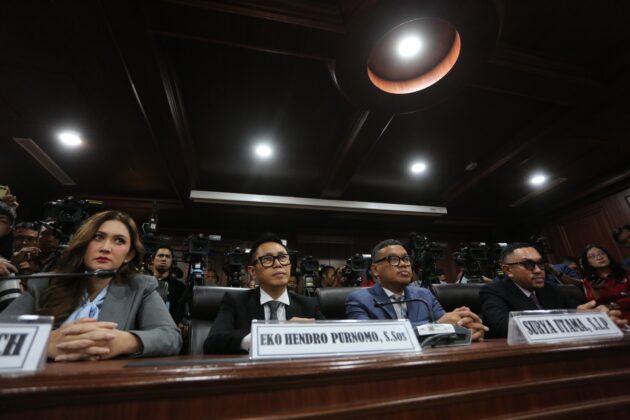 (Kiri ke kanan) Anggota DPR nonaktif Nafa Urbach, Eko Hendro Purnomo, Surya Utama alias Uya Kuya, Ahmad Sahroni dan Adies Kadir saat hadir dalam sidang putusan kasus dugaan pelanggaran kode etik anggota DPR nonaktif di Mahkamah Kehormatan Dewan (MKD) DPR, Kompleks Parlemen, Senayan, Jakarta, Rabu (5/11/2025). Mahkamah Kehormatan Dewan (MKD) DPR memutuskan untuk mengaktifkan kembali Adies Kadir dan Surya Utama alias Uya Kuya sebagai anggota DPR sedangkan untuk anggota DPR nonakatif Ahmad Sahroni, Nafa Urbach, dan Eko Hendro Purnomo terbukti melanggar kode etik dan menjatuhkan hukuman tambahan dengan memperpanjang masa nonaktif sebagai anggota DPR. Aktual/TINO OKTAVIANO