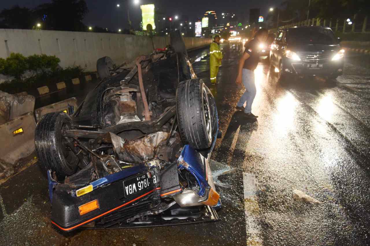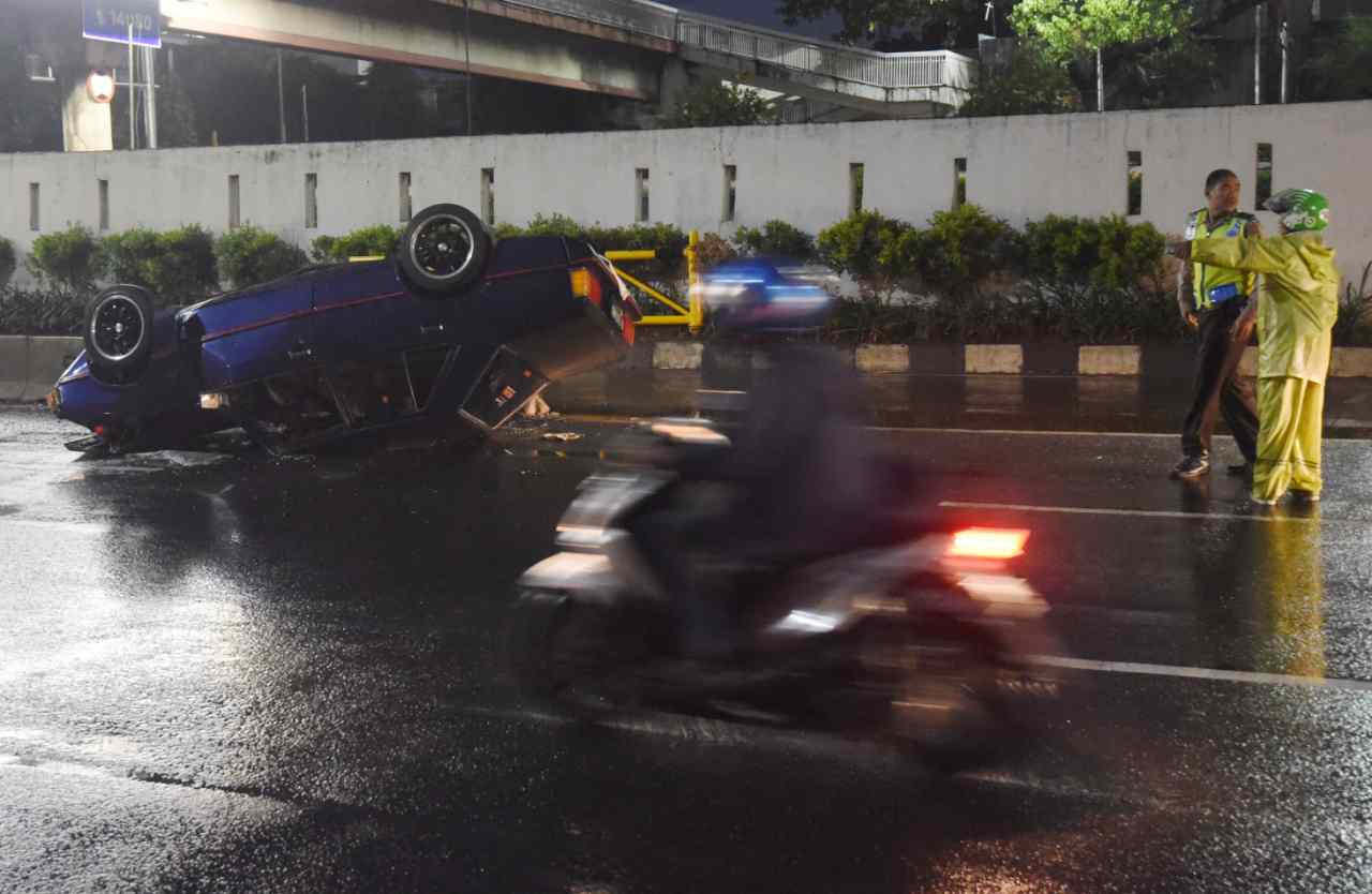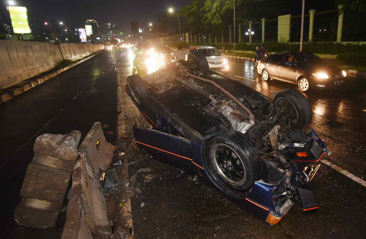 Anggota kepolisian berjaga di lokasi kecelakaan mobil yang terbalik di Jalan Gatot Subroto, Jakarta, Selasa (5/7). Kecelakaan itu diduga akibat supir mengantuk dan menabrak separator busway sehingga mengakibatkan mobil terbalik. ANTARA FOTO/Akbar Nugroho Gumay/aww/16