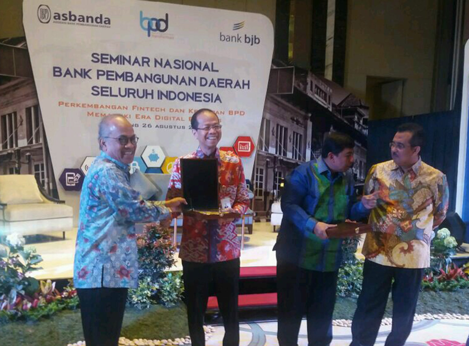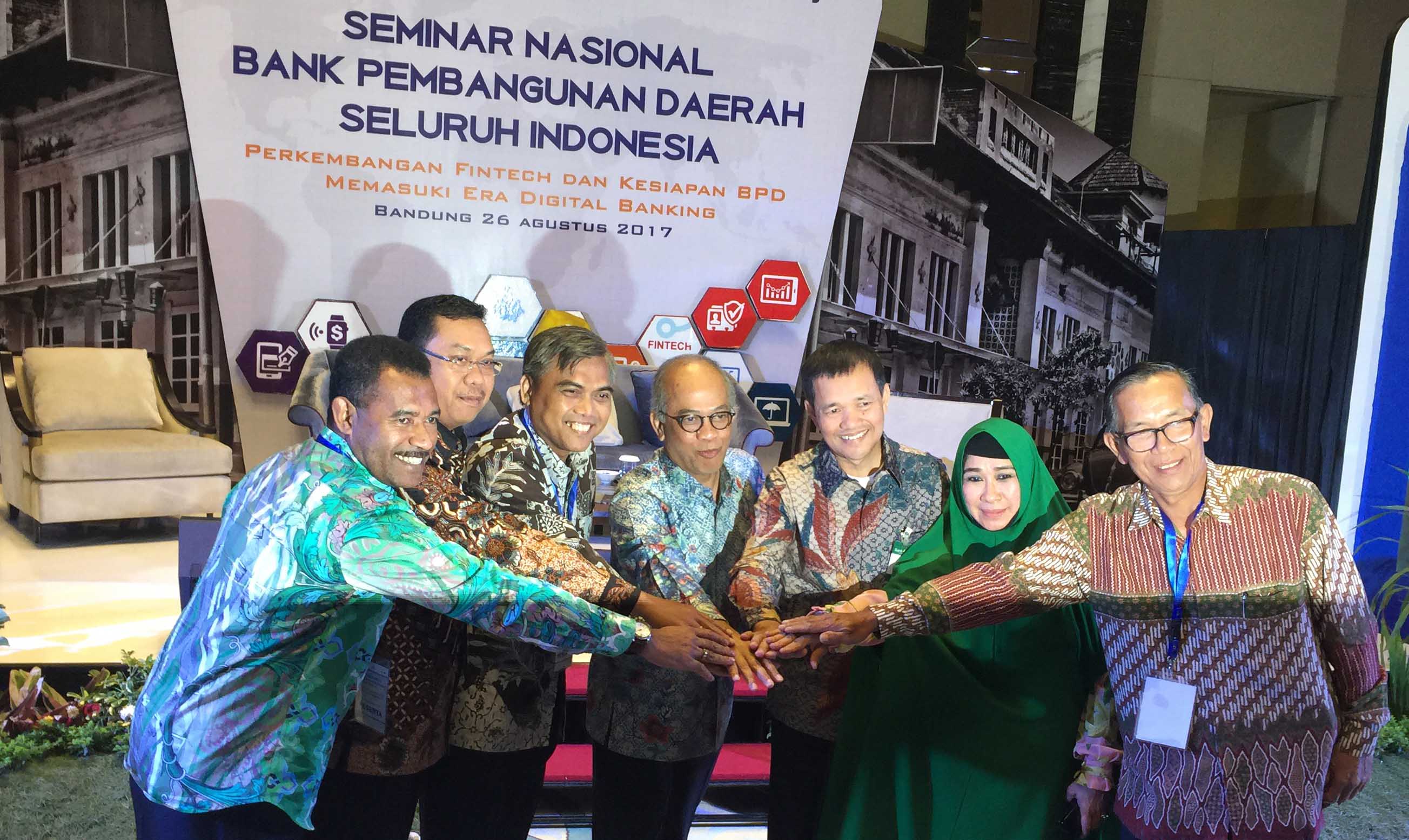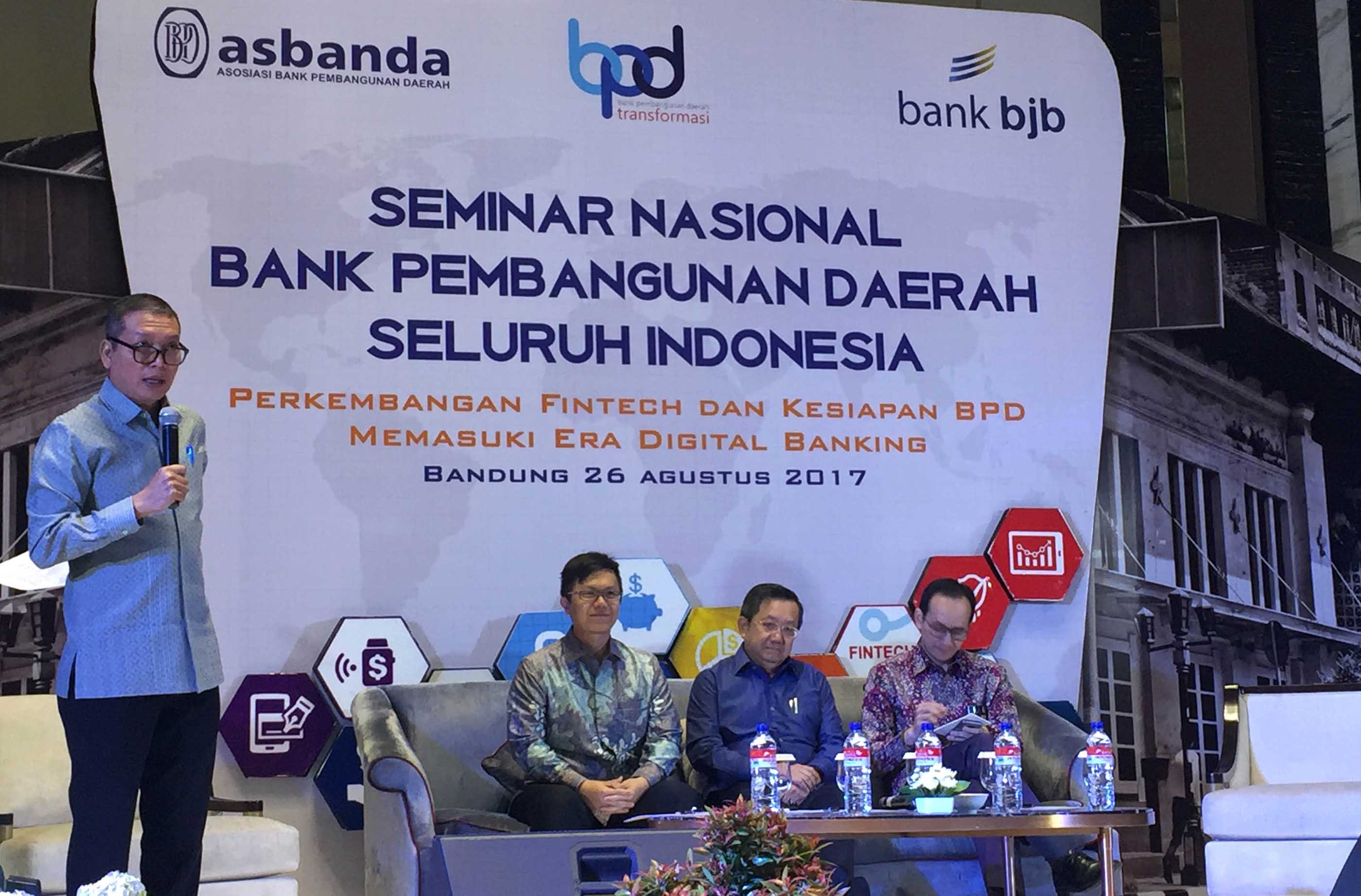 Head Of Marketplace Tokopedia Aldo Tjahjadi (kedua kiri), Dirut Bank Sinar Mas Freenyan Liwang (kedua kanan), dan Assisten Direktur Fintech Office Bank Indonesia Yosamartha (kanan) saat mengikuti seminar Nasional Asbanda dengan tema “Perkembangan Fintech dan Kesiapan BPD menghadapi Era Digital di Bandung, Jawa Barat, Sabtu (26/8). AKTUAL/HO