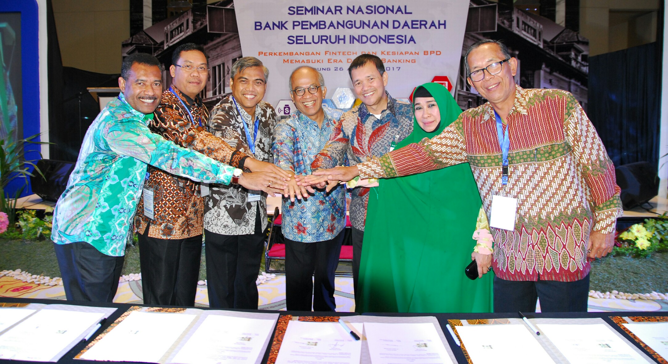 Dirut Bank DKI Kresno Sediarsi (tengah) bersama Direktur Bank Papua Isak Wopari (paling kiri), Dirut Bank Kalteng Yosapatasi (kedua kiri), Direktur Bank Jateng Hanawijaya (ketiga kiri), Direktur Bank Nagari Muhammad Irsyad (ketiga kanan), Direktur Bank Sulawesi Tenggara Hayati hasan (kedua kanan), Pjs. Dirut Bank Lampung Muhammad Syachroni (kanan) melakukan jabat tangan bersama usai melakukan penandatanganan nota kesepahaman tentang implementasi transaksi non tunai di lingkup pemerintah provinsi, kabupaten dan kota di 7 provinsi di Bandung, Jawa Barat, Sabtu (26/8). Kedepannya, Bank DKI akan mendukung 7 BPD tersebut dalam menerapkan implementasi sistem non tunai pada pembayaran atau penerimaan di pemerintah daerah masing-masing. AKTUAL/HO
