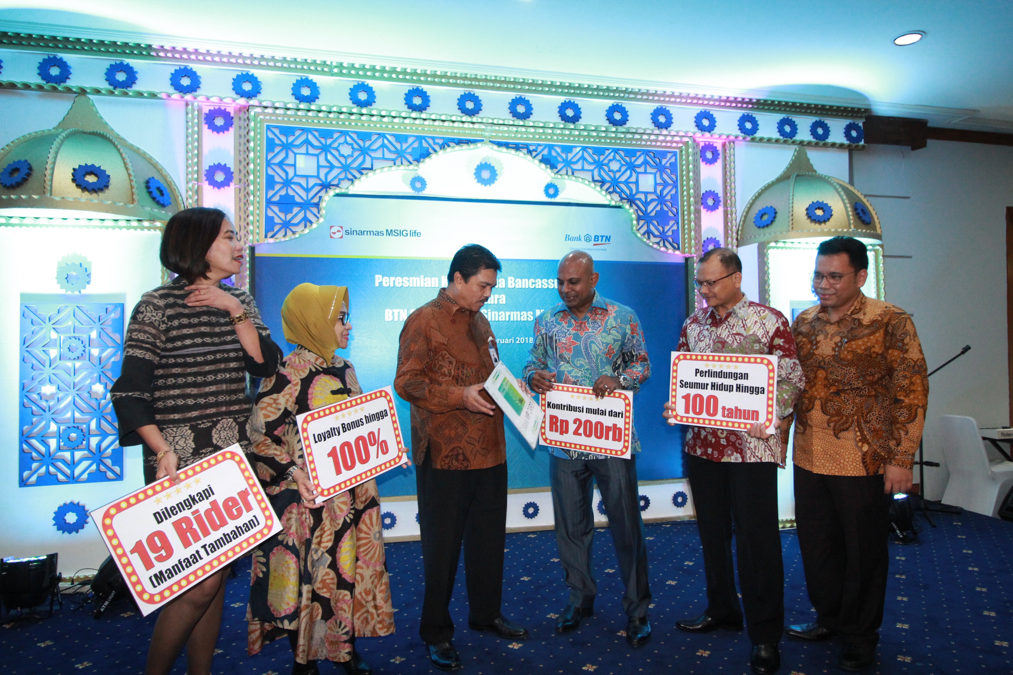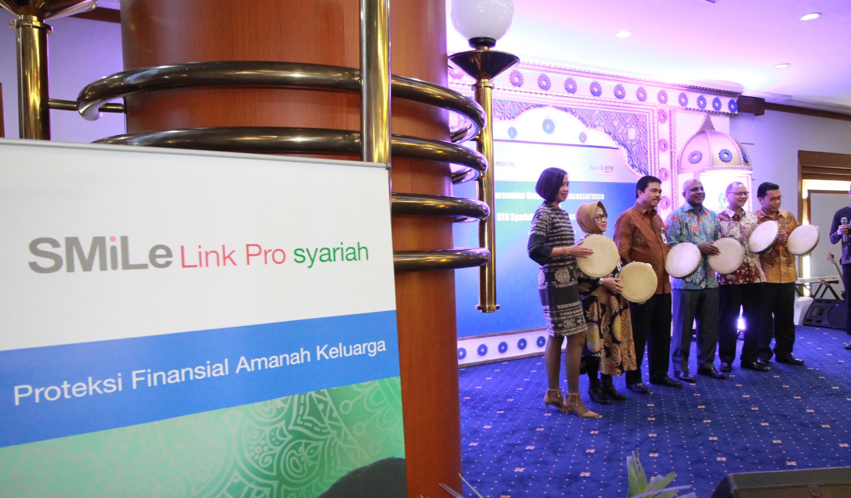 Dari kiri ke kenan, Kepala Divisi Wealth Management Bank BTN Sri Redjeki Murni Sudarsari, Kepala Divisi Syariah Bank BTN Marisa Gemiralda, Managing Director Consumer Banking Bank BTN Budi Satria, Presiden Direktur Sinarmas MSIG Life Premraj Thuraisingam, Direktur Sinarmas MSIG Life Hamid Hamzah dan Division Head Bancassurance Sinarmas MSIG Life Benhard Meliala, meresmikan kerja sama perdana bancassurance syariah antara Sinarmas MSIG Life dan Unit Usaha Syariah Bank BTN (UUS Bank BTN), sekaligus peluncuran produk SMiLe Link Pro Syariah melalui tabuh rebana di Jakarta, Rabu (14/2). Jalur distribusi bancassurance Sinarmas MSIG Life tumbuh 40% pada tahun 2017 dan ditargetkan memberikan kontribusi sekitar 61% terhadap perolehan premi perusahaan selama 2018 dengan adanya optimisme pasar yang akan berkembang di tahun ini. AKTUAL/Tino Oktaviano