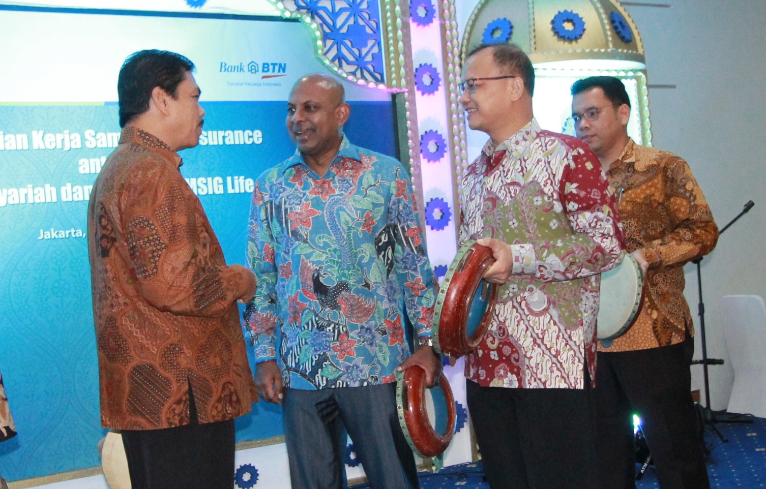 Dari kiri ke kenan, Managing Director Consumer Banking Bank BTN Budi Satria, Presiden Direktur Sinarmas MSIG Life Premraj Thuraisingam, Direktur Sinarmas MSIG Life Hamid Hamzah dan Division Head Bancassurance Sinarmas MSIG Life Benhard Meliala, meresmikan kerja sama perdana bancassurance syariah antara Sinarmas MSIG Life dan Unit Usaha Syariah Bank BTN (UUS Bank BTN), sekaligus peluncuran produk SMiLe Link Pro Syariah melalui tabuh rebana di Jakarta, Rabu (14/2). Jalur distribusi bancassurance Sinarmas MSIG Life tumbuh 40% pada tahun 2017 dan ditargetkan memberikan kontribusi sekitar 61% terhadap perolehan premi perusahaan selama 2018 dengan adanya optimisme pasar yang akan berkembang di tahun ini. AKTUAL/Tino Oktaviano