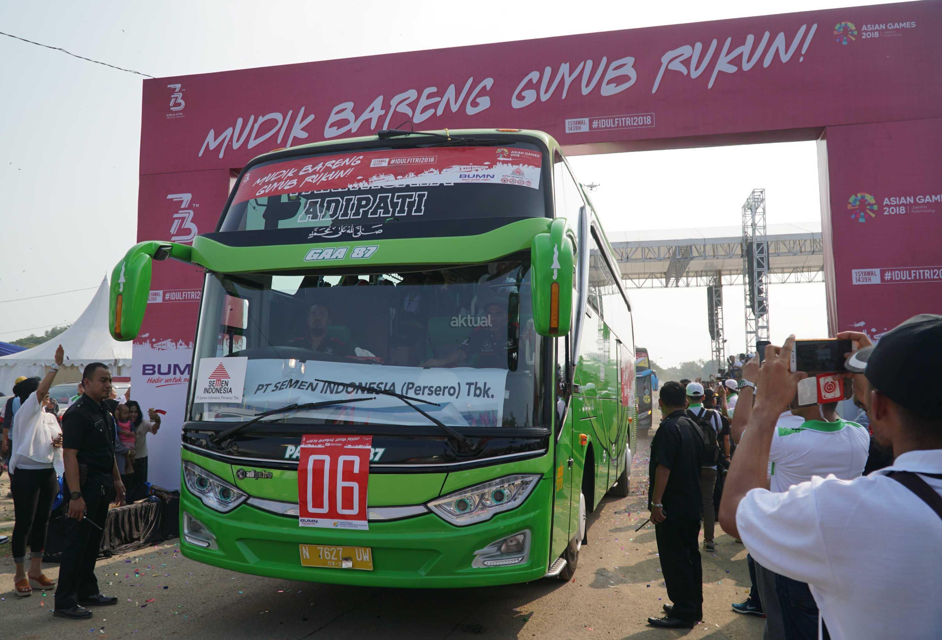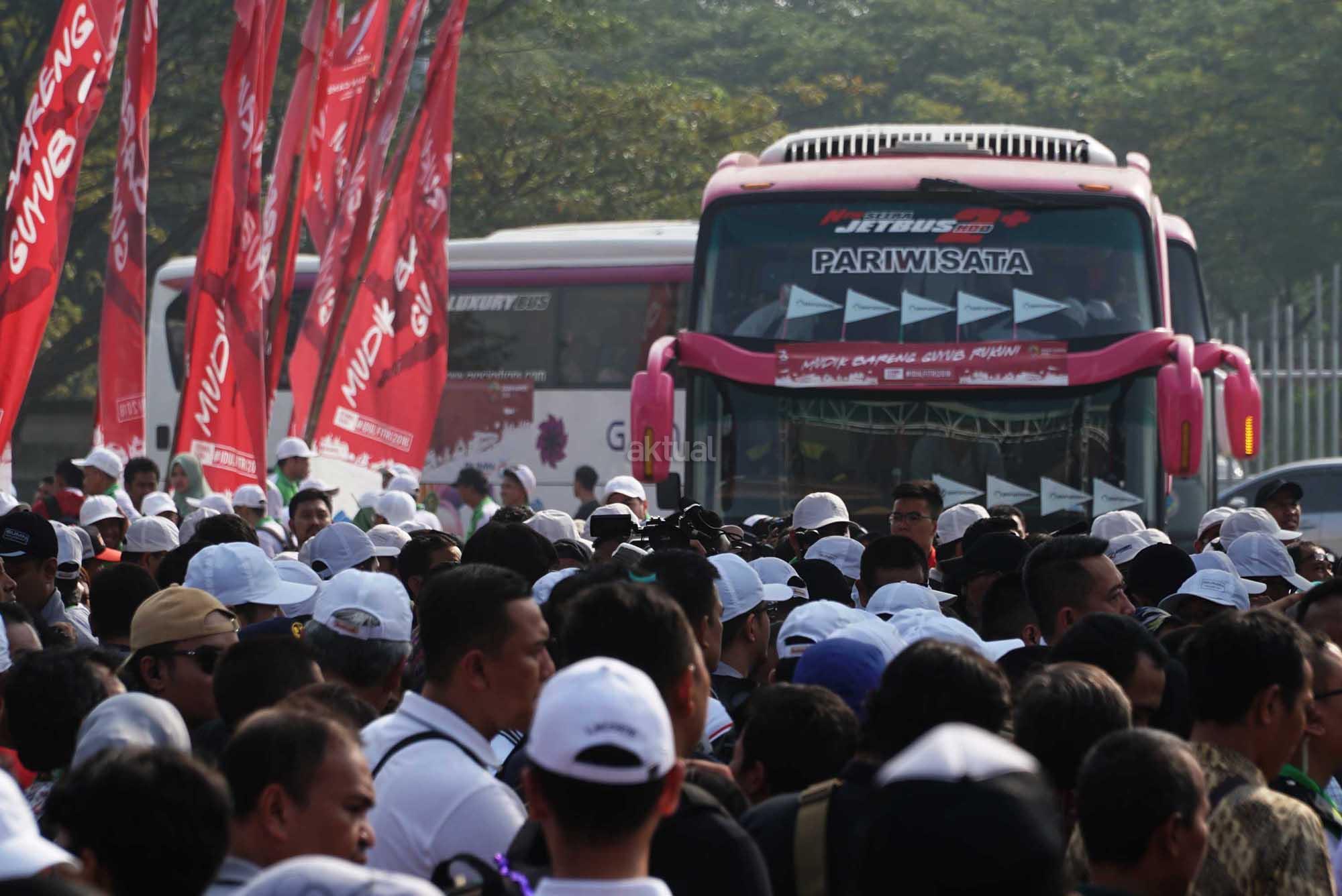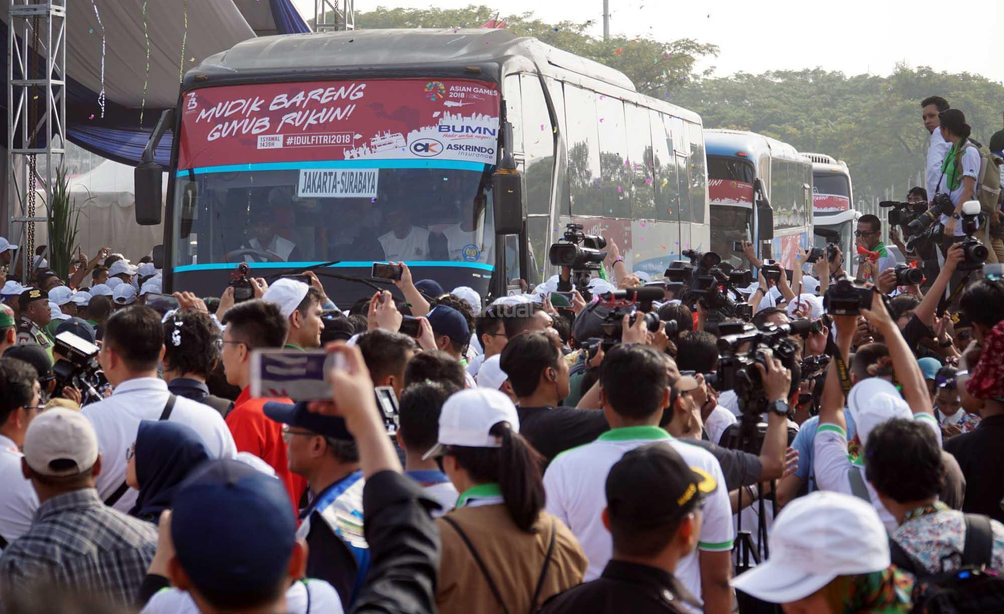 Bus rombongan peserta mudik bareng Guyub Rukun usai dilepas pemberangkatannya oleh Menteri BUMN di Pantai Karnaval,Jakarta,Sabtu (9/6).Mudik bareng tahun ini diikuti 62 BUMN dengan menggunakan moda transportasi darat, laut dan udara ke 177 kota tujuan di tanah air.75 kota di pulau jawa dan 102 kota diluar pulau Jawa. AKTUAL/Eko S Hilman