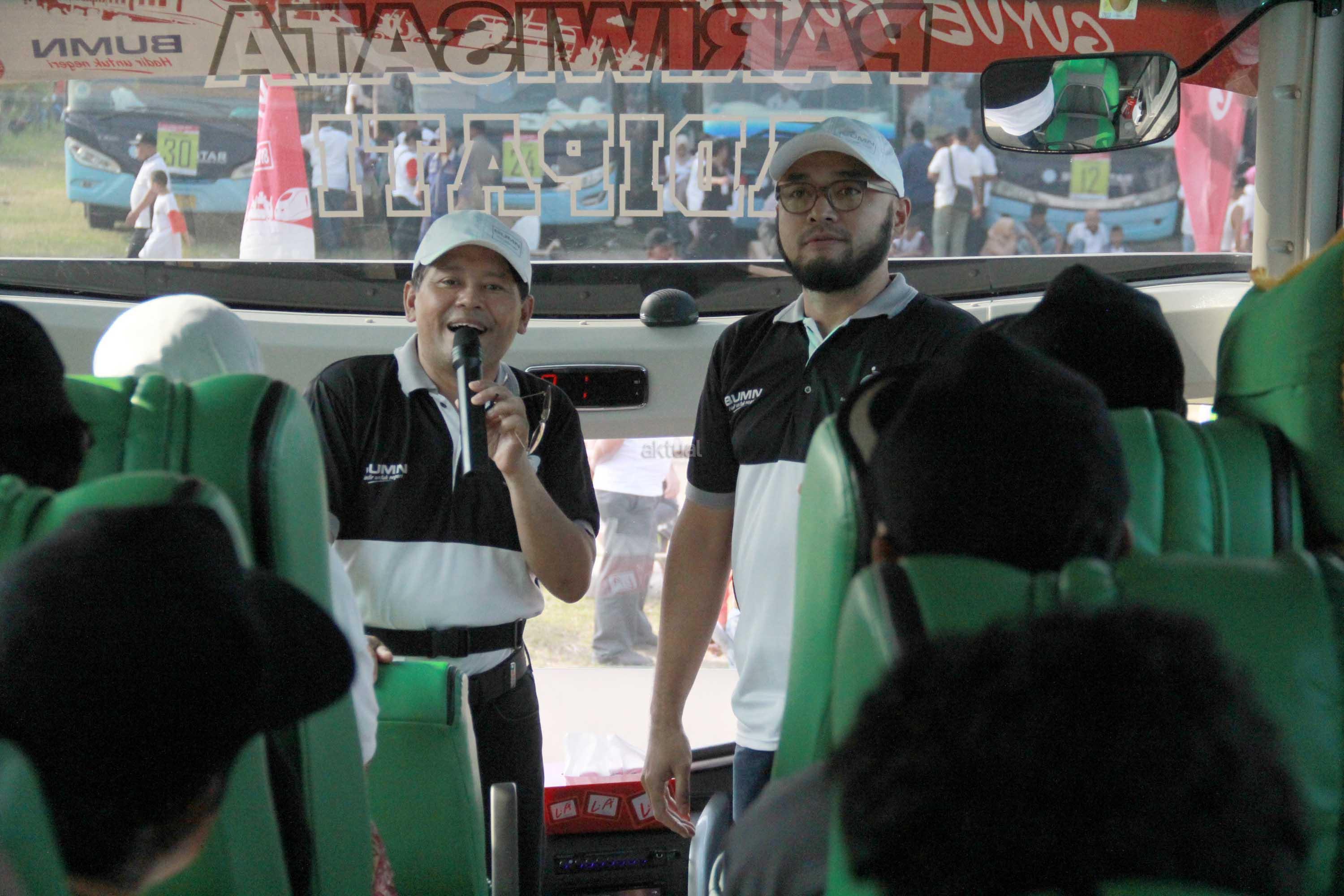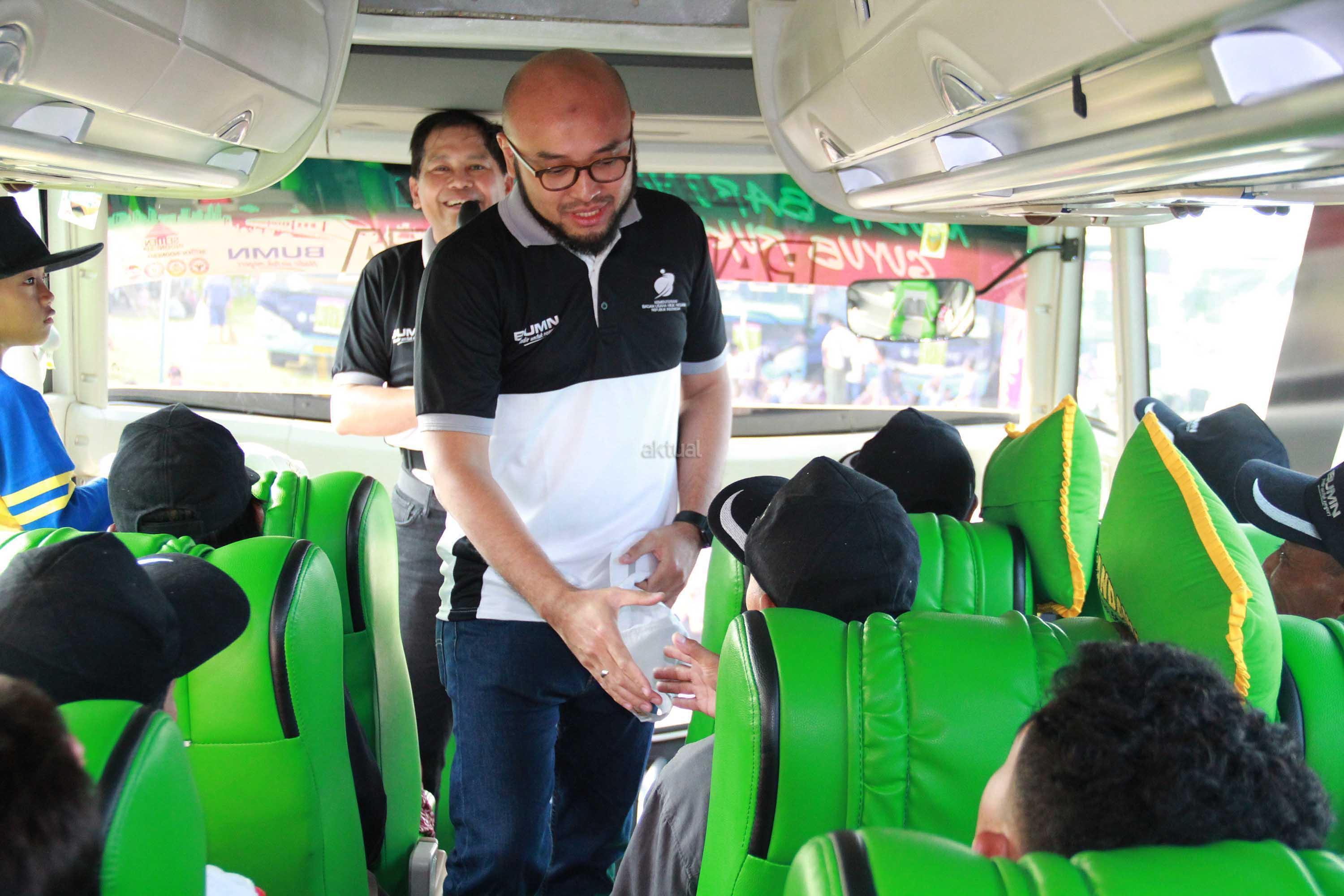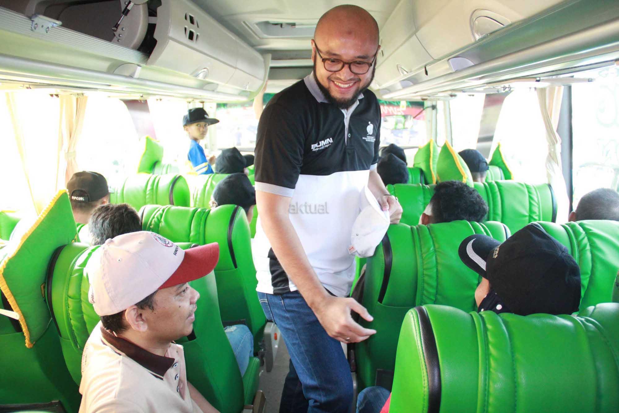 Bus rombongan peserta mudik bareng Guyub Rukun usai dilepas pemberangkatannya oleh Menteri BUMN di Pantai Karnaval,Jakarta,Sabtu (9/6).Mudik bareng tahun ini diikuti 62 BUMN dengan menggunakan moda transportasi darat, laut dan udara ke 177 kota tujuan di tanah air.75 kota di pulau jawa dan 102 kota diluar pulau Jawa. AKTUAL/Eko S Hilman