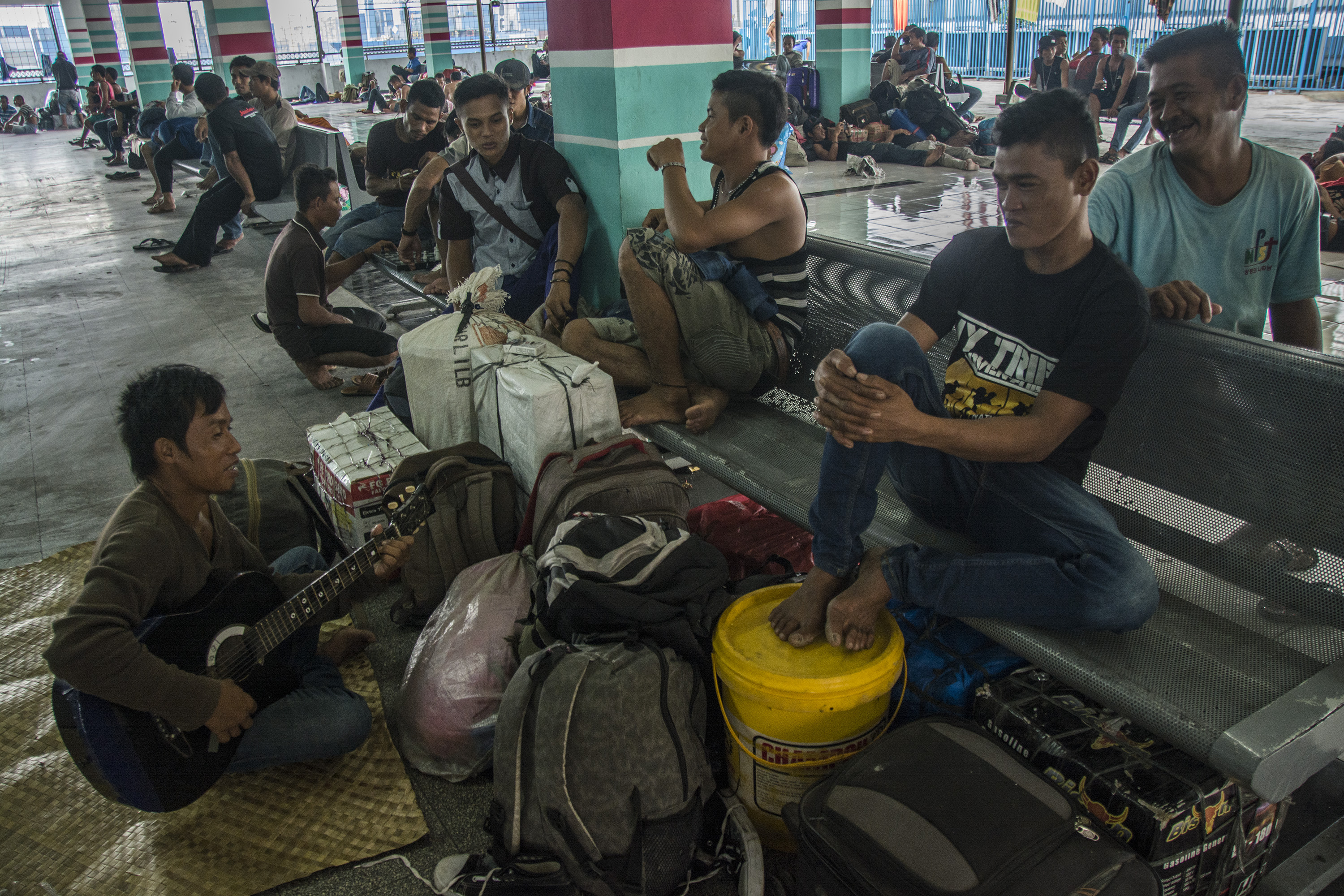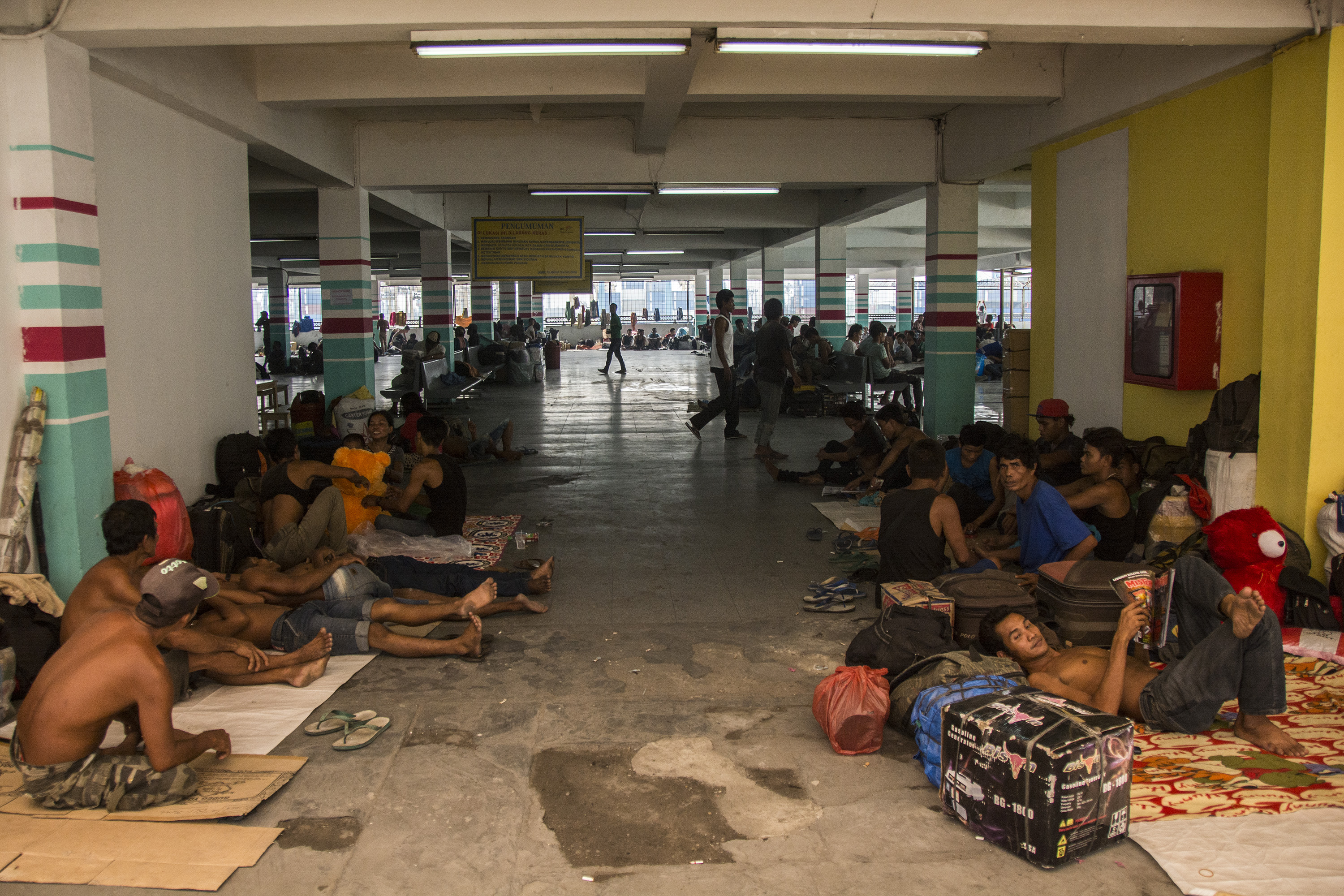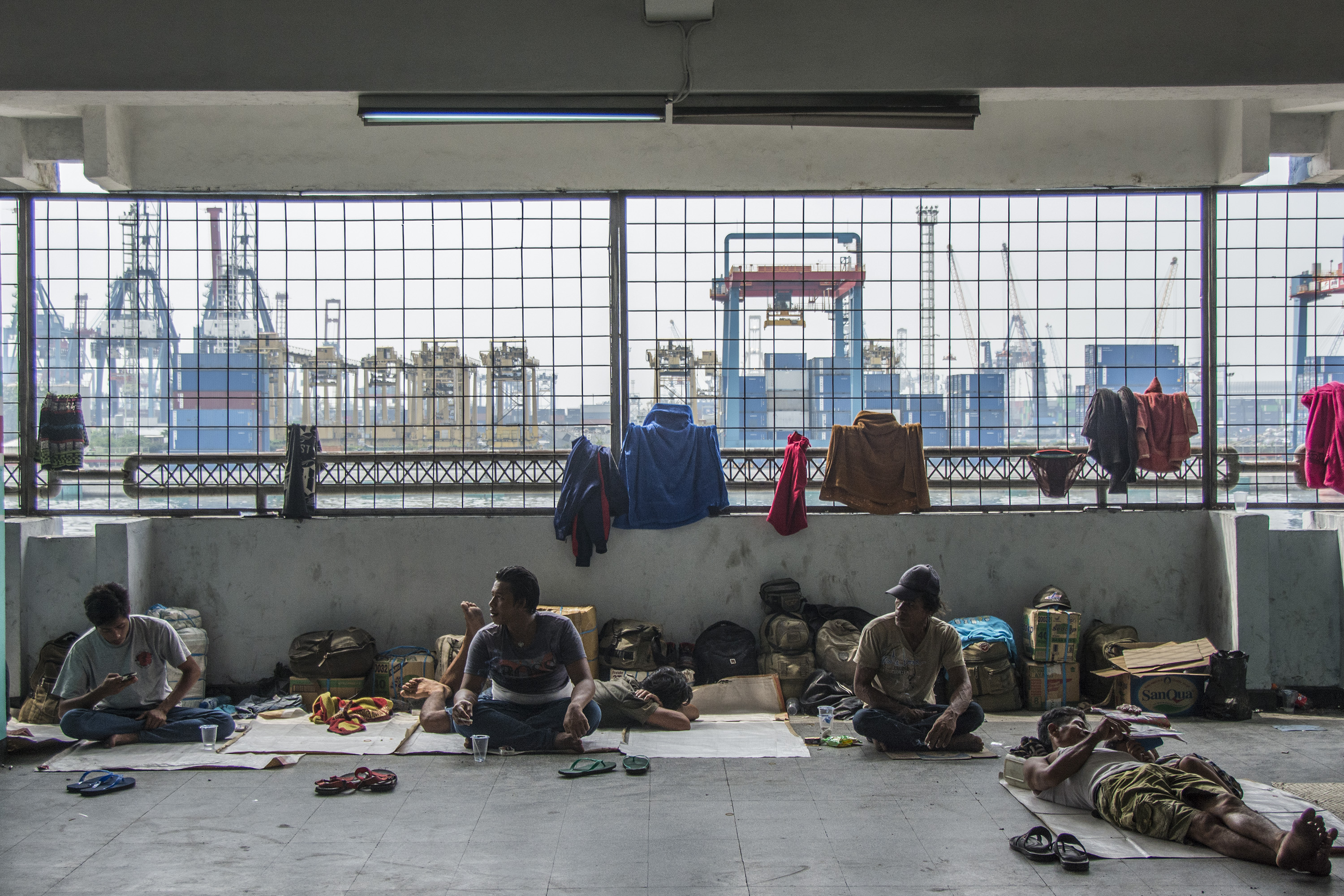 Calon pemudik asal menunggu kedatangan kapal di Pelabuhan Tanjung Priok, Jakarta, Rabu (29/6). Pemudik yang menggunakan transportasi laut mulai memadati pelabuhan Tanjung Priok dan diprediksi puncak arus mudik terjadi pada H-4 dan H-3 lebaran. ANTARA FOTO/Aprillio Akbar/aww/16.