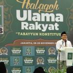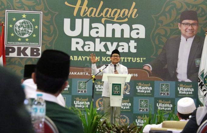 Ketua Umum Partai Kebangkitan Bangsa (PKB) Muhaimin Iskandar saat memberikan pidatonya dan sekaligus membuka acara Halaqoh Ulama Rakyat di Jakarta, Senin (28/11/2016). Dalam acara Halaqoh Ulama Rakyat yang dihadiri ratusan peserta para Kyai dan Ulama dari pondok pesantren seluruh Indonesia. AKTUAL/Munzir