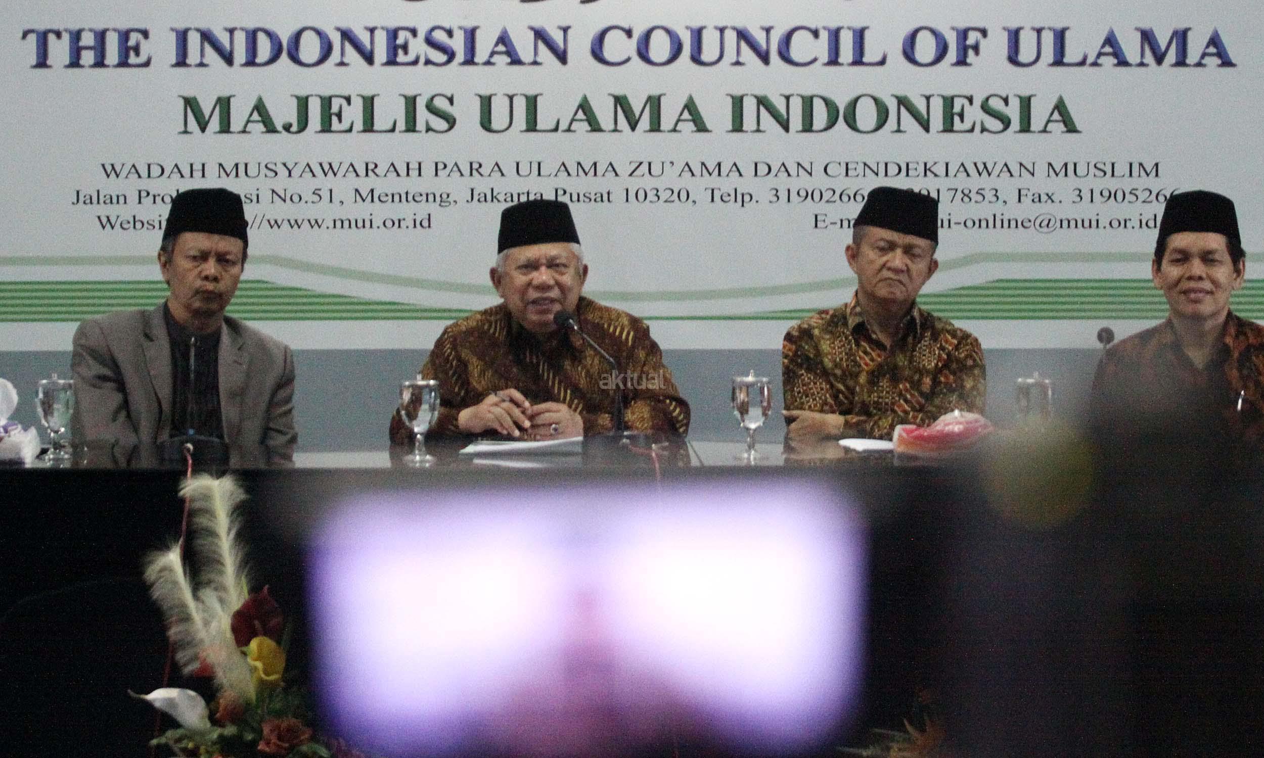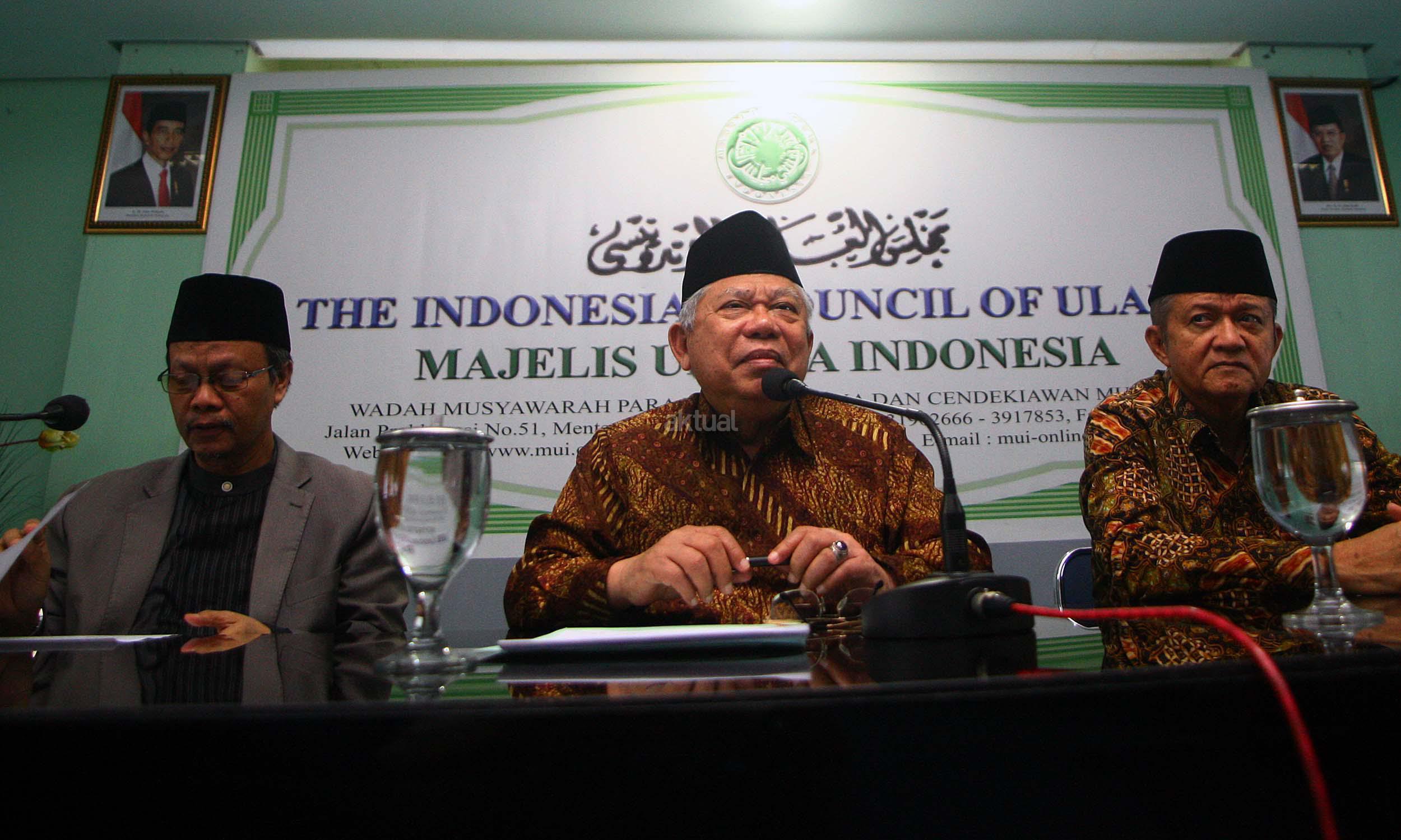 Ketua Umum MUI Pusat KH Ma'ruf Amin (tengah) bersama jajaran pimpinan MUI Pusat saat menggelar jumpa pers terkait menjelang bulan Ramadhan di kantor MUI Pusat, Jakarta, Selasa (31/5/2016). Dalam jumpa persnya Majelis Ulama Indonesia mendesak aparat penegak hukum untuk menindak tegas berbagai bentuk peredaran minum keras, tempat hiburan malam, praktek prostitusi dan menghimbau kelompok masyarakat untuk tidak melakukan sweeping di dalam ke khusyu'an dan ke khidmatan saat menjalankan ibadah puasa bulan Ramadhan.
