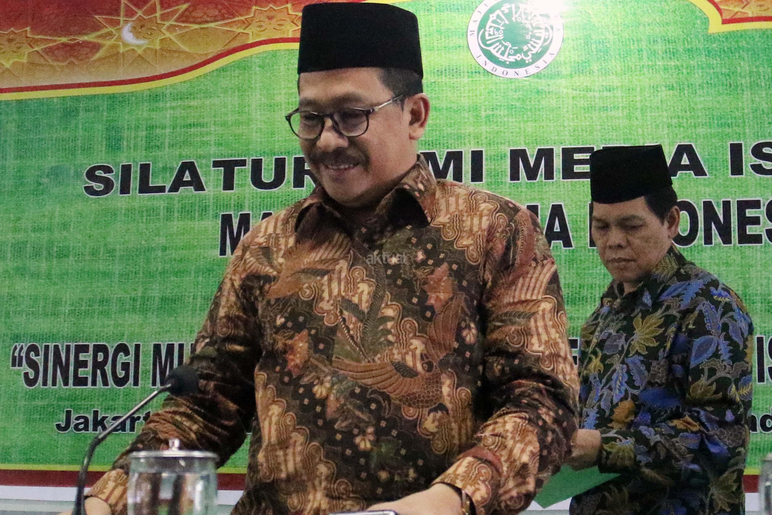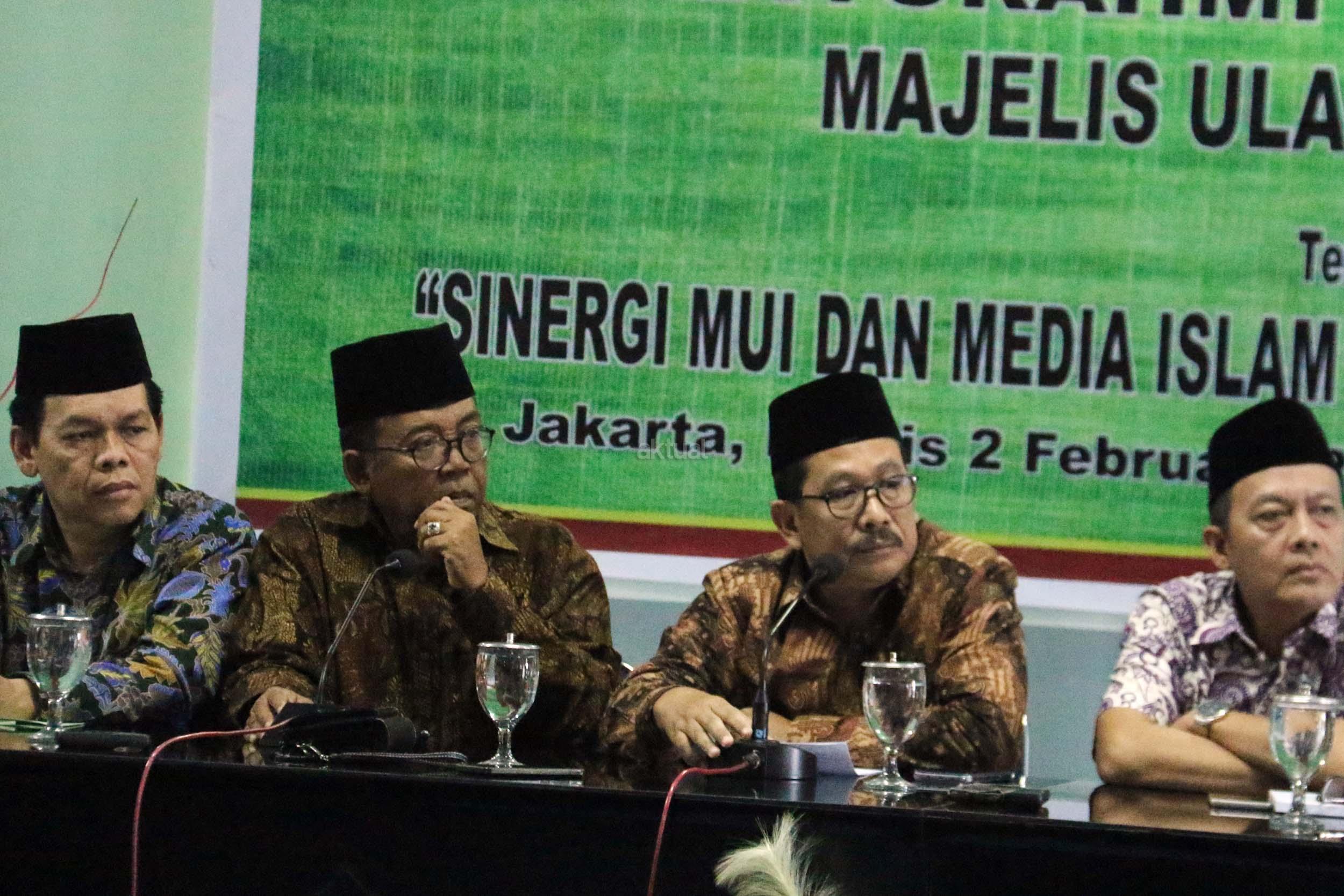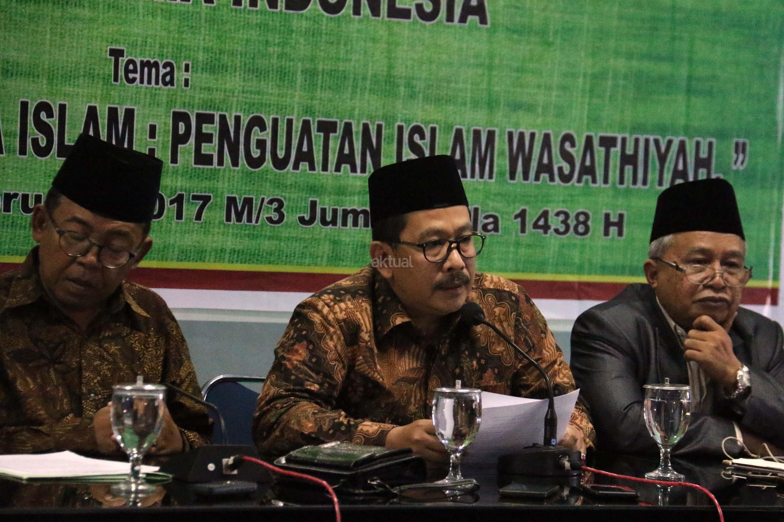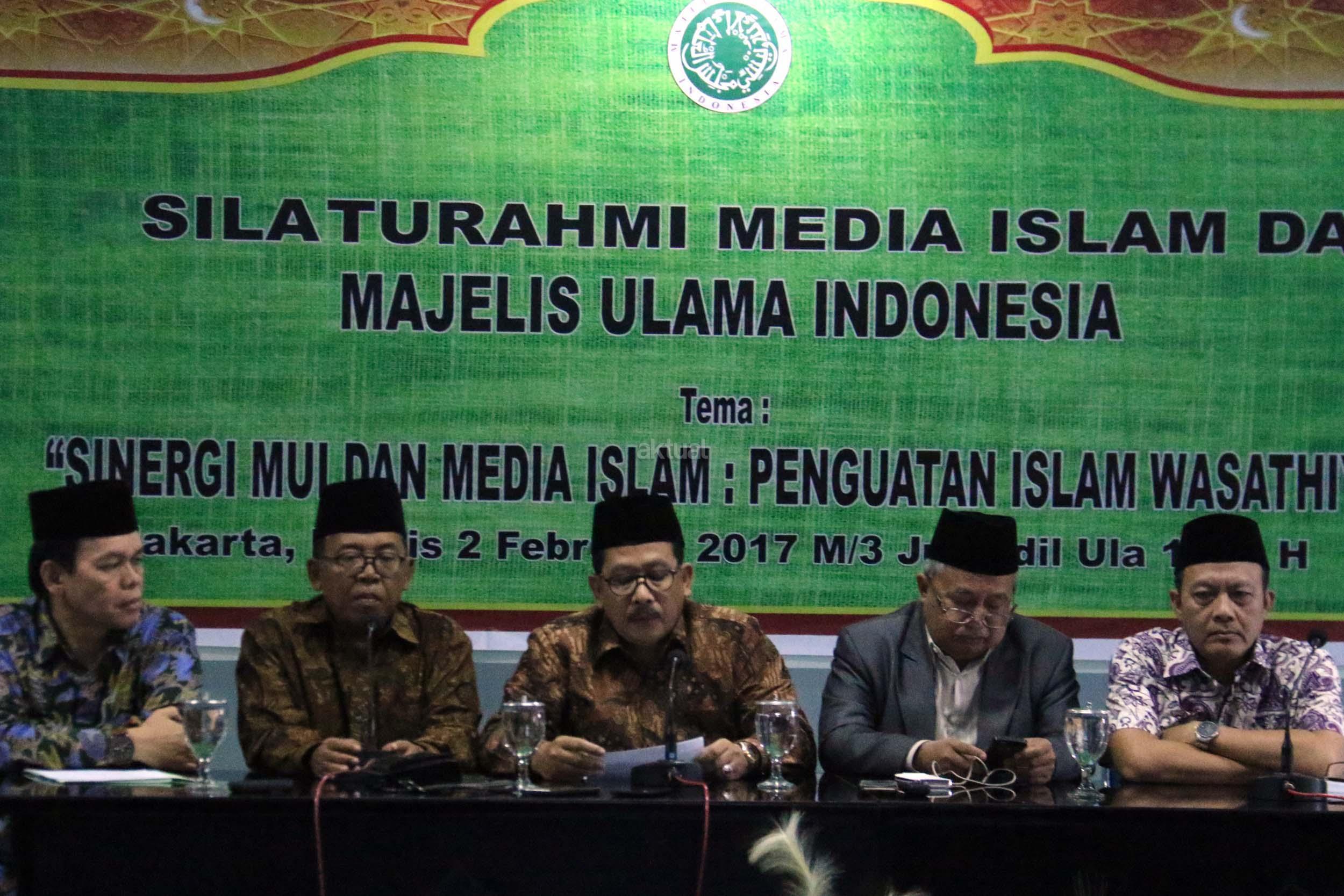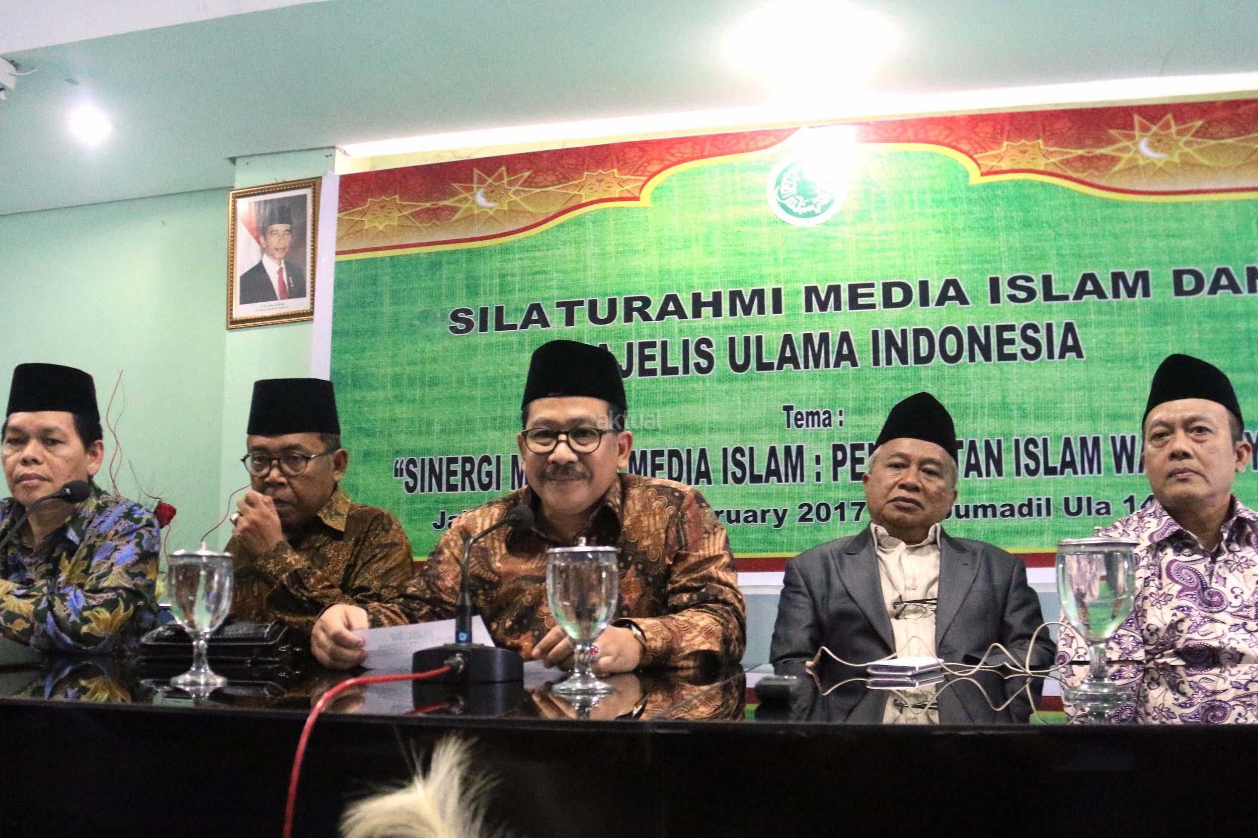 Wakil Ketua Umum Majelis Ulama Indonesia (MUI) Zainut Tauhid Saadi (tengah) saat menggelar konferensi pers terkait pernyataan Gubernur DKI nonaktif Basuki Tjahaja Purnama (Ahok) kepada ketua MUI KH Ma’ruf Amin, di Jakarta, Kamis (2/2/2017). Dalam konferensi persnya MUI menyesalkan atas pernyataan Ahok yang menyudutkan KH Ma’ruf Amin saat menjadi saksi di sidang penistaan Agama. AKTUAL/Munzir
