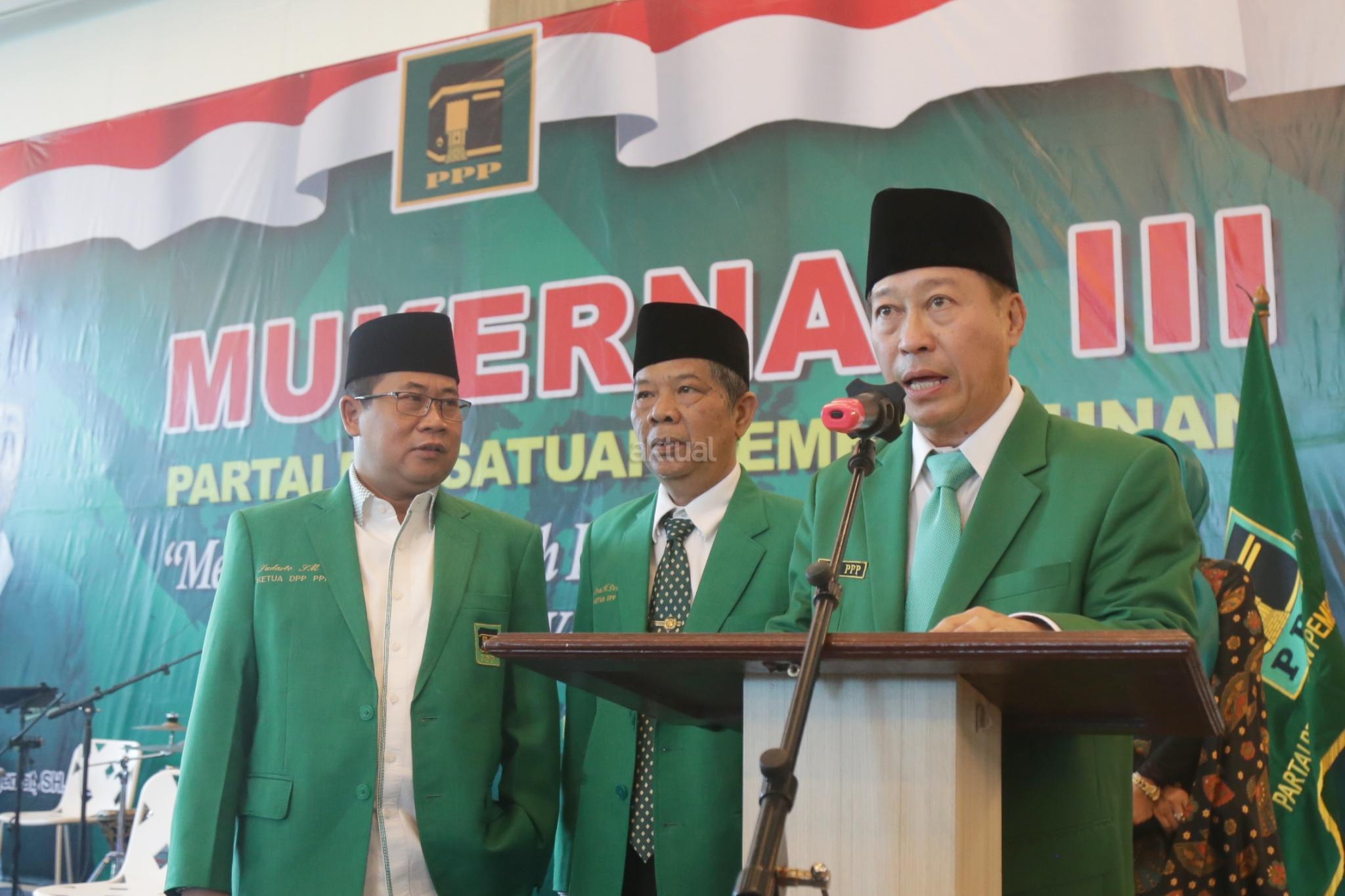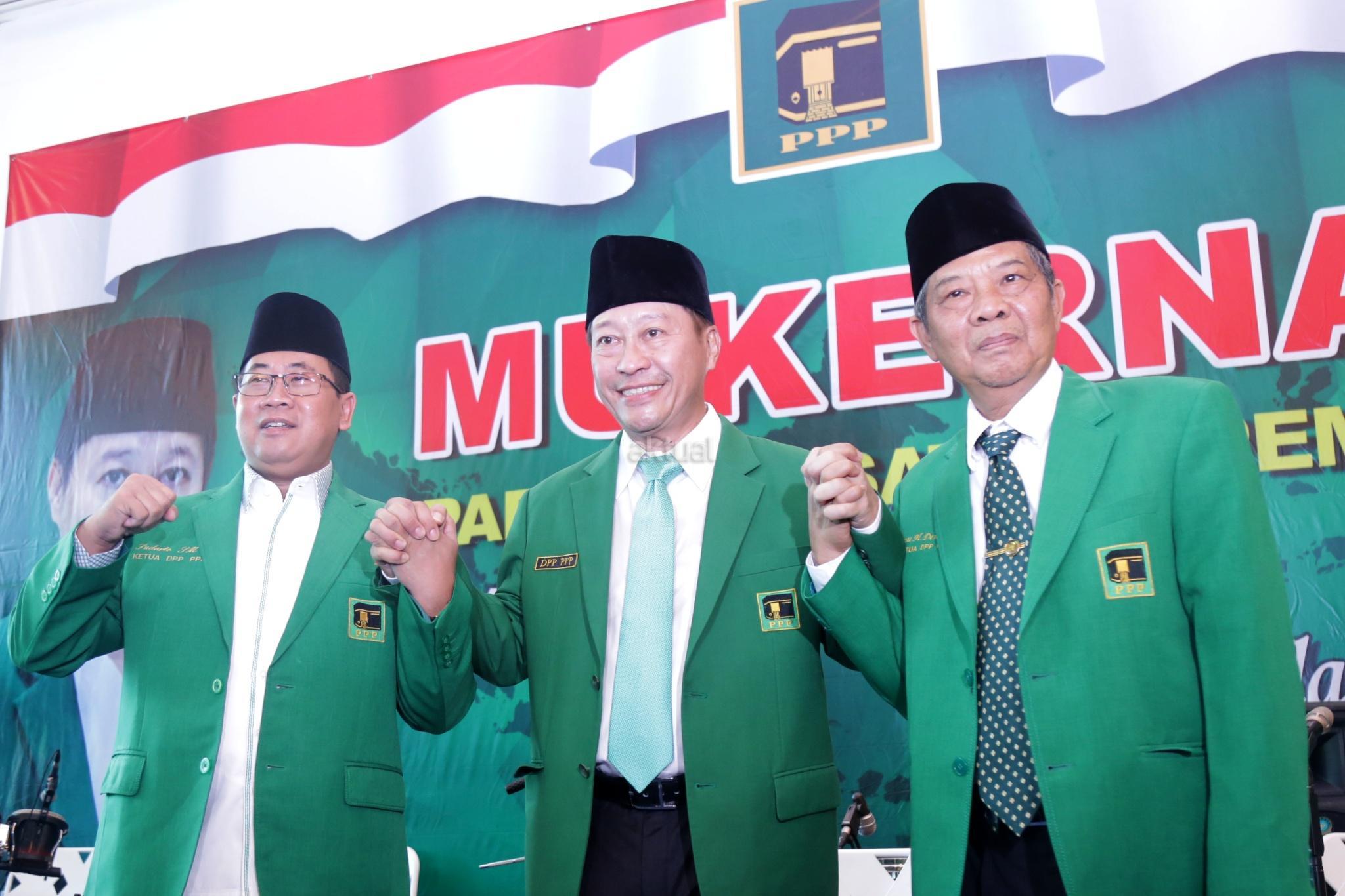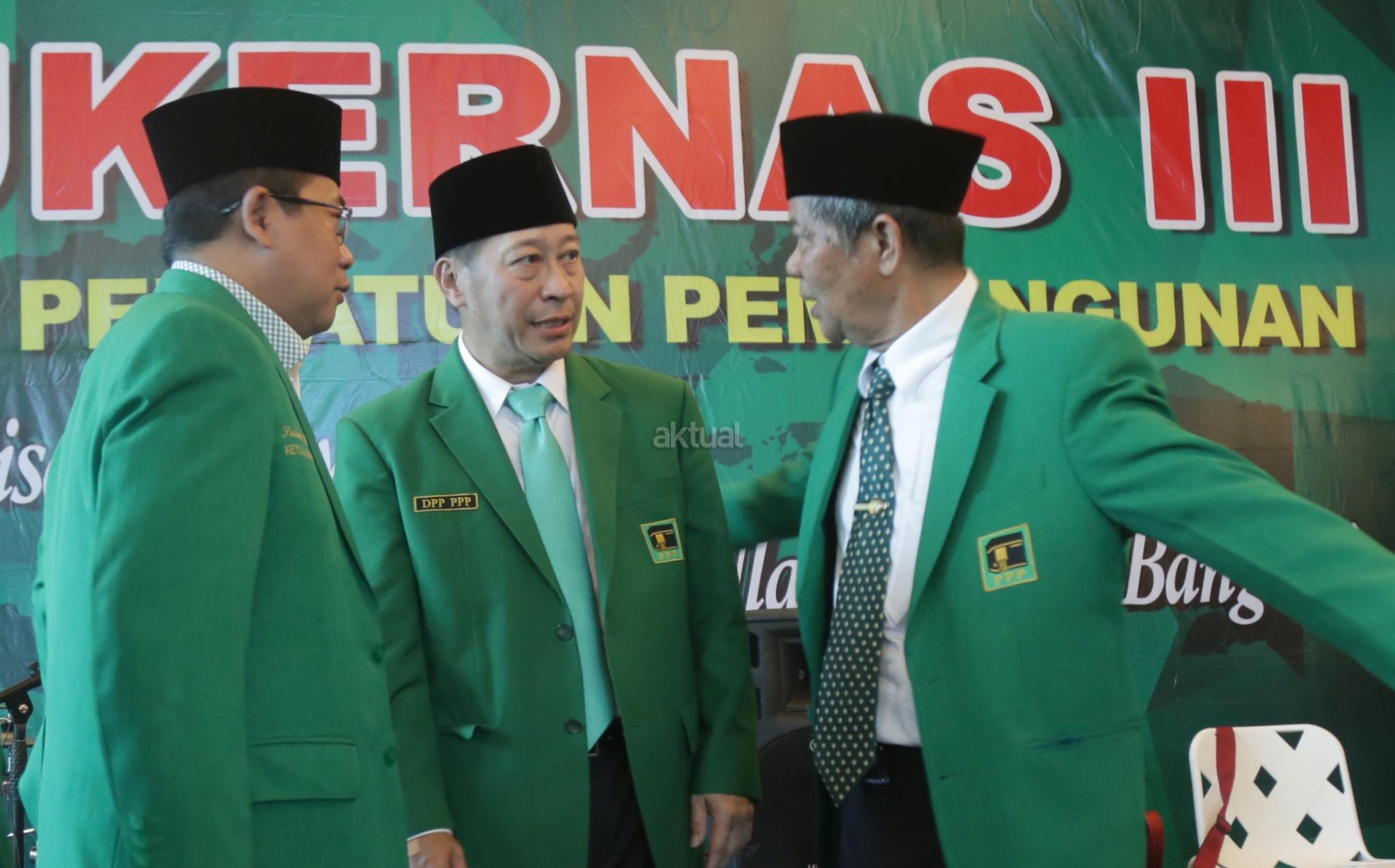 PJS Ketua Umum Partai Persatuan Indonesia (PPP) Muktamar Jakarta, Humphrey Djemat (ketiga kanan), Sekretaris Jenderal Partai Persatuan Indonesia (PPP) Sudarto (ketiga kiri) dan sejumlah kader Partai Persatuan Indonesia (PPP) Muktamar Jakarta saat membuka Mukernas III Partai Persatuan Indonesia (PPP) Muktamar Jakarta di Gedung Galeri, Jakarta, Kamis (15/11/2018). Tema Mukernas PPP Muktamar Jakarta tersebut "Revitalisasi Marwah Partai Warisan Ulama Untuk Bangsa", dihadiri 34 DPW seluruh indonesia, tokoh senior partai dan empat organisasi massa pendiri PPP fusi 1973. AKTUAL/Tino Oktaviano