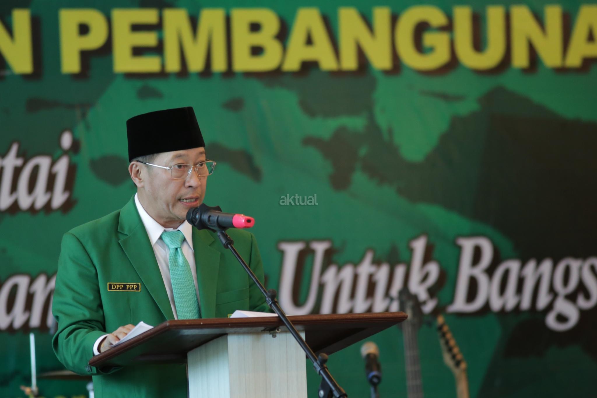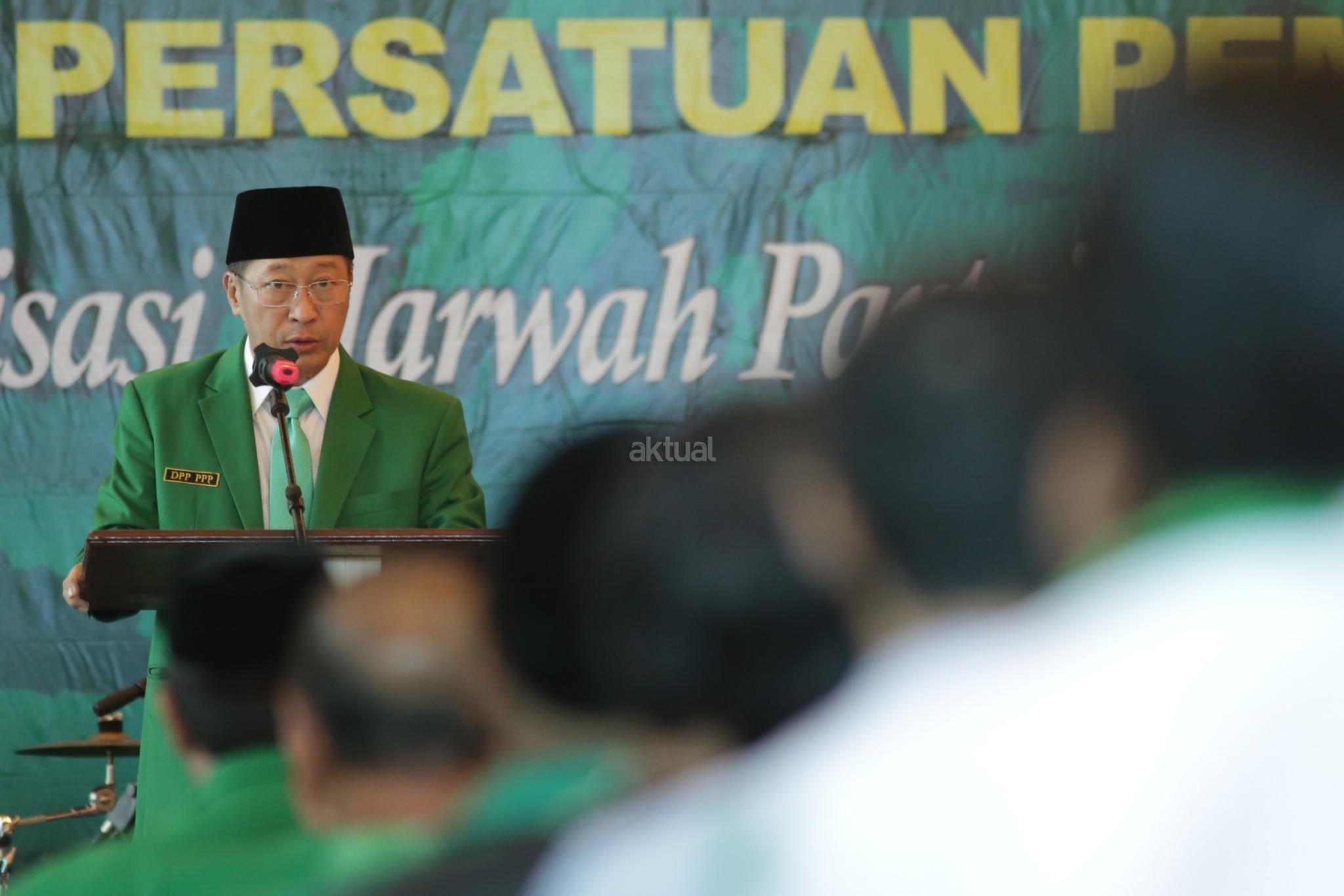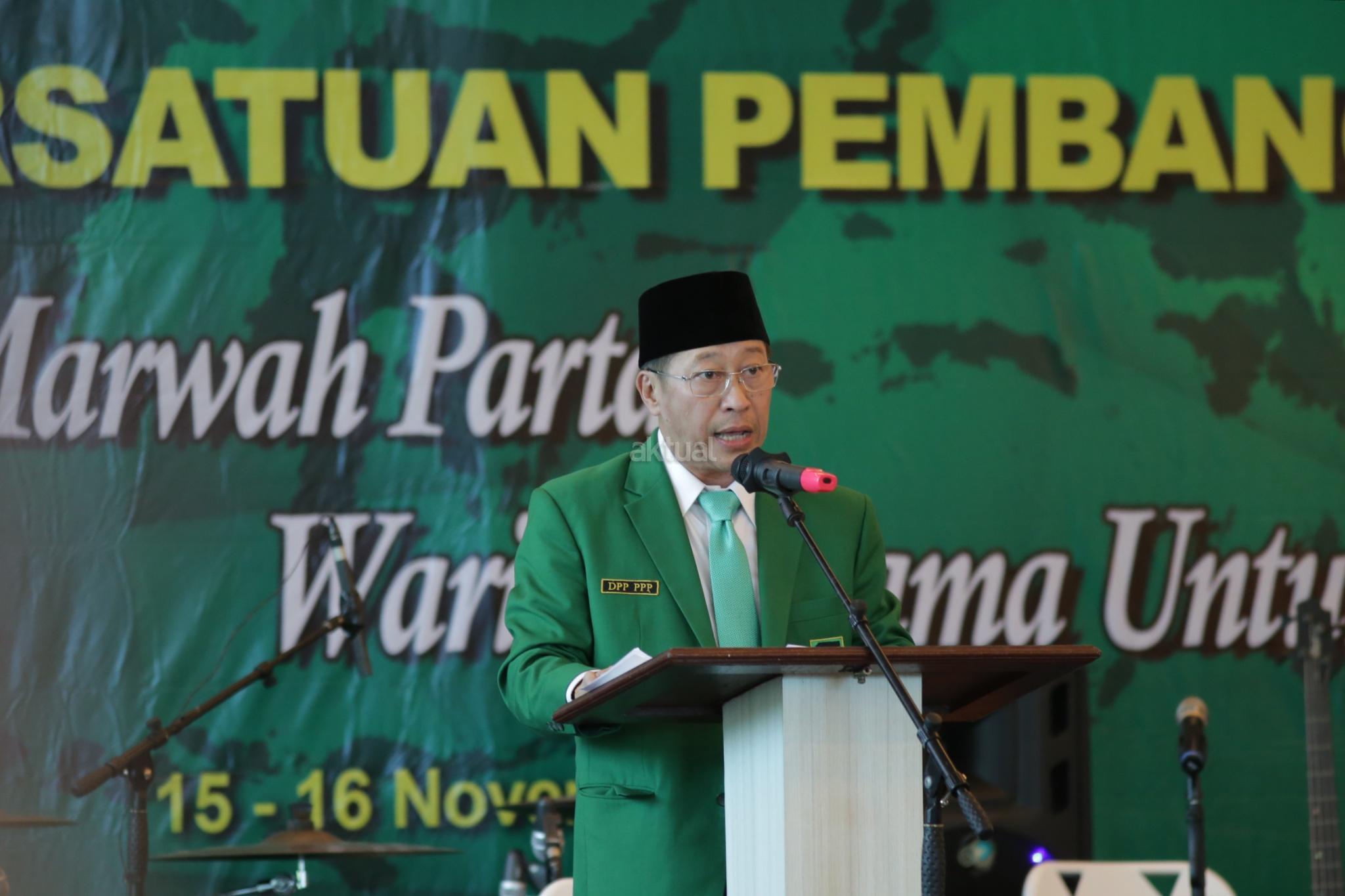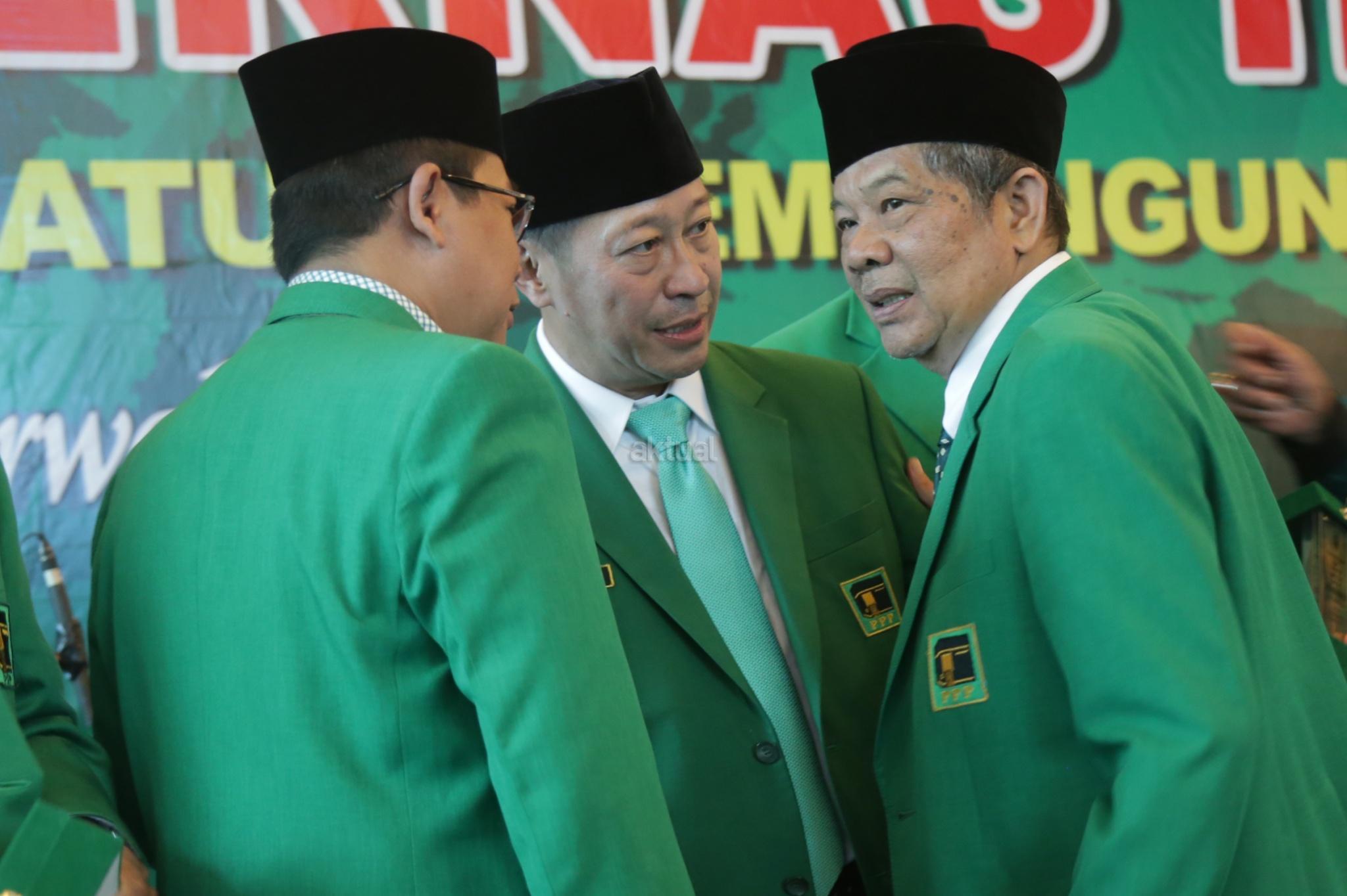 PJS Ketua Umum Partai Persatuan Indonesia (PPP) Muktamar Jakarta, Humphrey Djemat (ketiga kanan), Sekretaris Jenderal Partai Persatuan Indonesia (PPP) Sudarto (ketiga kiri) dan sejumlah kader Partai Persatuan Indonesia (PPP) Muktamar Jakarta saat membuka Mukernas III Partai Persatuan Indonesia (PPP) Muktamar Jakarta di Gedung Galeri, Jakarta, Kamis (15/11/2018). Tema Mukernas PPP Muktamar Jakarta tersebut "Revitalisasi Marwah Partai Warisan Ulama Untuk Bangsa", dihadiri 34 DPW seluruh indonesia, tokoh senior partai dan empat organisasi massa pendiri PPP fusi 1973. AKTUAL/Tino Oktaviano