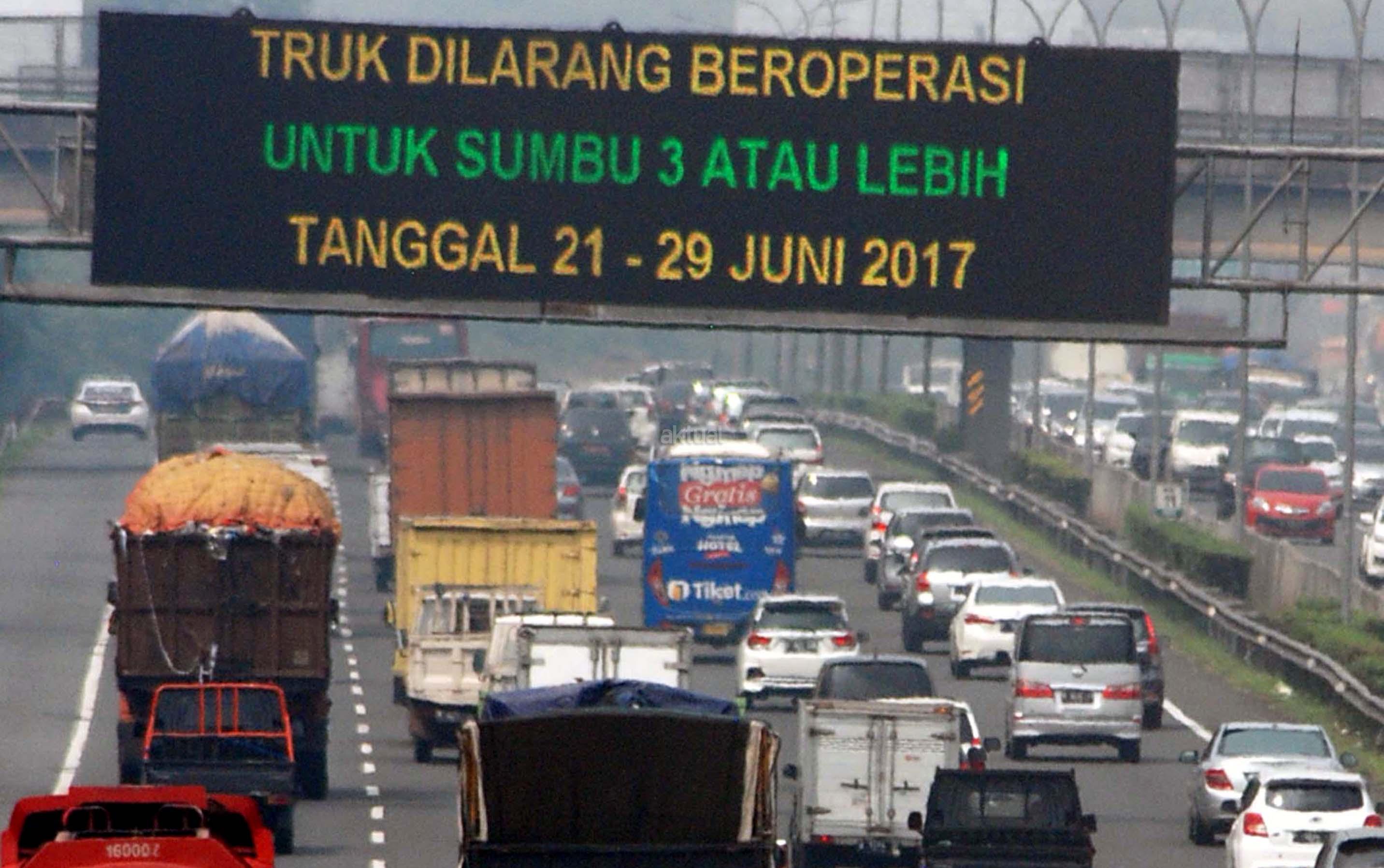 Sejumlah kendaraan melintas di bawah bilboard bertuliskan larangan melintas bagi kendaraan truk jelang lebaran di tol Jagorawi, Jakarta, Rabu (14/6/2017). Menjelang arus dan balik mudik lebaran tahun 2017, pemerintah melalui Direktorat Jenderal Perhubungan Darat kembali memberlakukan pembatasan operasional bagi kendaraan angkutan barang. Hal ini dilakukan guna meningkatkan pelayanan dan kelancaran arus lalu lintas pada musim mudik lebaran 1438 H, sehingga para pemudik dapat dengan nyaman dan aman sampai ke kampung halamannya masing-masing. Adapun aturan larangan melintas khusus truk barang mulai 21 Juni hingga 29 Juni 2017 berlaku di seluruh jalan nasional atau jalur mudik dan jalan tol di pulau Jawa dan Lampung. AKTUAL/Munzir