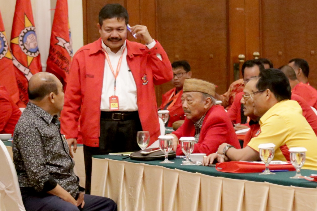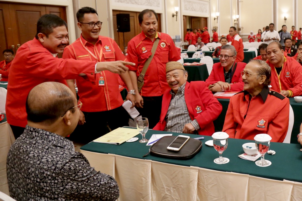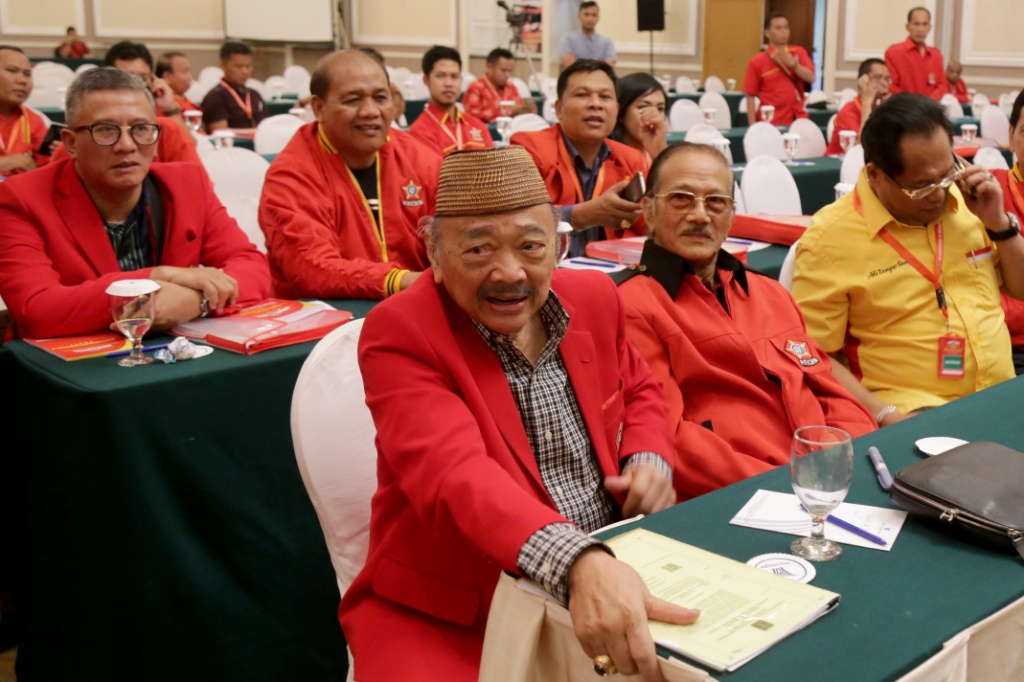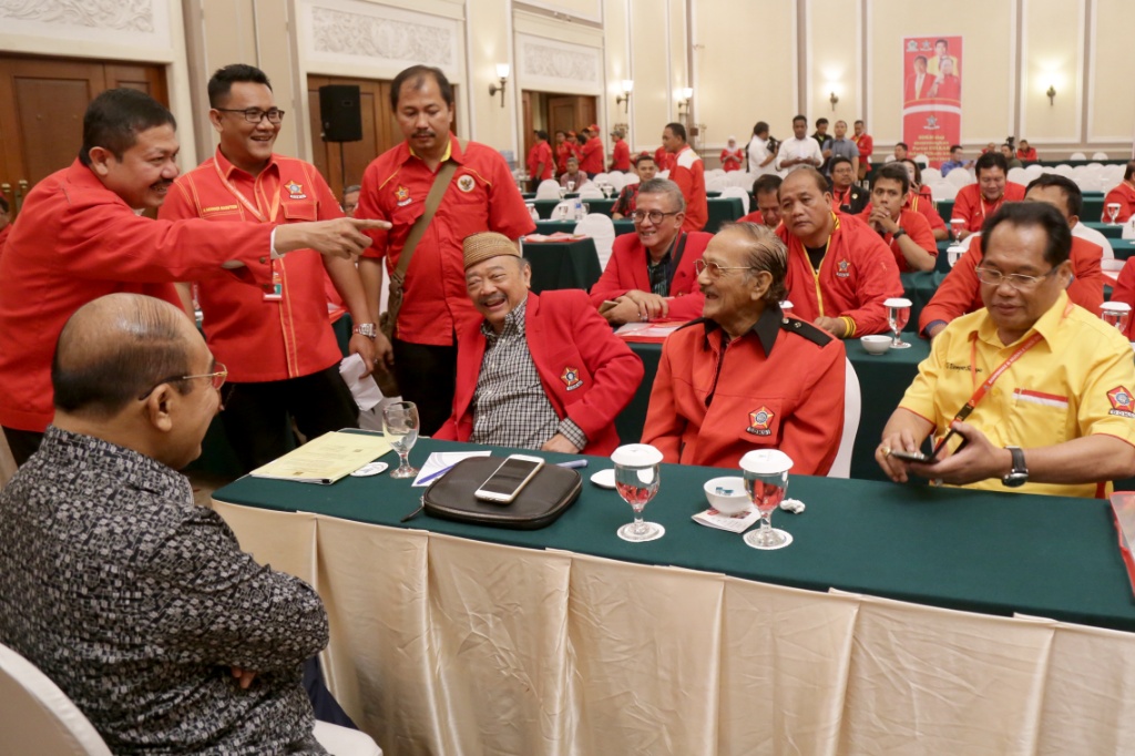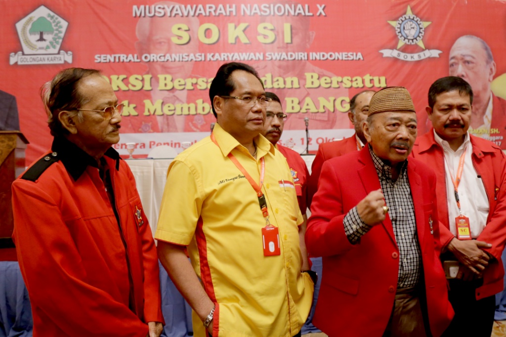 Ketua Dewan Pembina Sentral Organisasi Karyawan Swadiri (SOKSI) Oetojo Oesman berbincang dengan jajaran pengurus SOKSI di Hotel Menara Peninsula Jakarta Barat, Selasa (10/10). Dari 34 Dewan Pimpinan Daerah (Depidar) SOKSI yang ada, sebanyak 28 di antaranya telah tiba di Jakarta untuk mengikuti kegiatan pra-munas organisasi sayap pendiri Partai Golongan Karya. AKTUAL/Tino Oktaviano