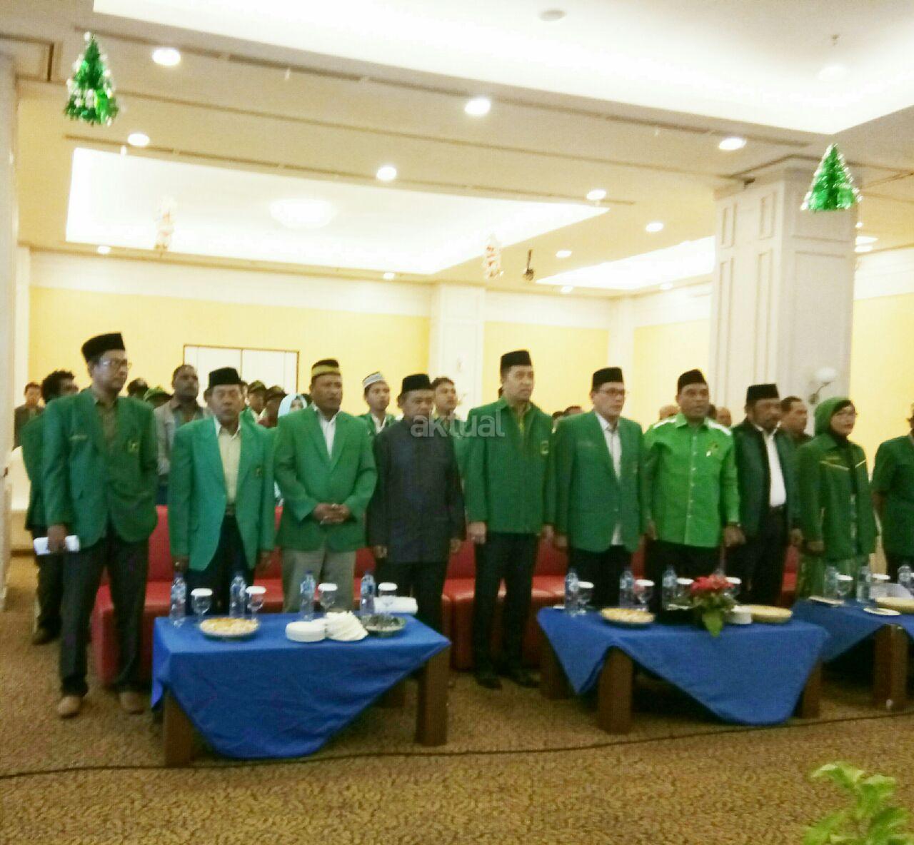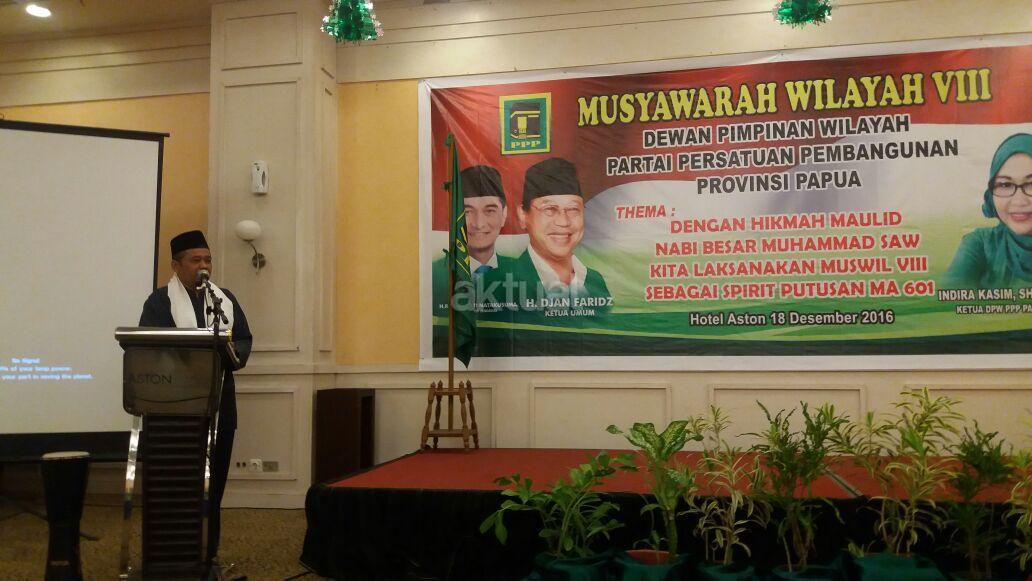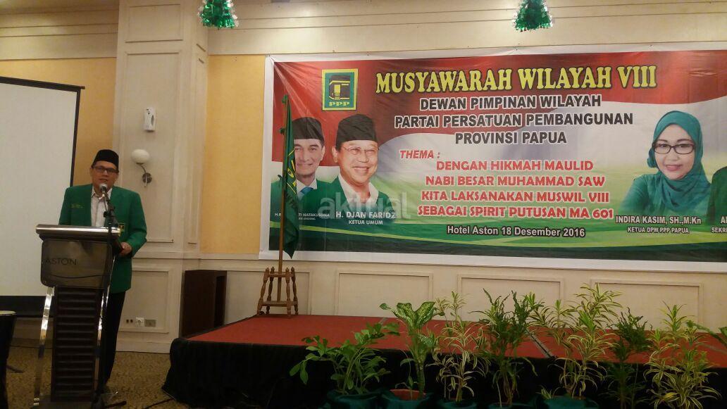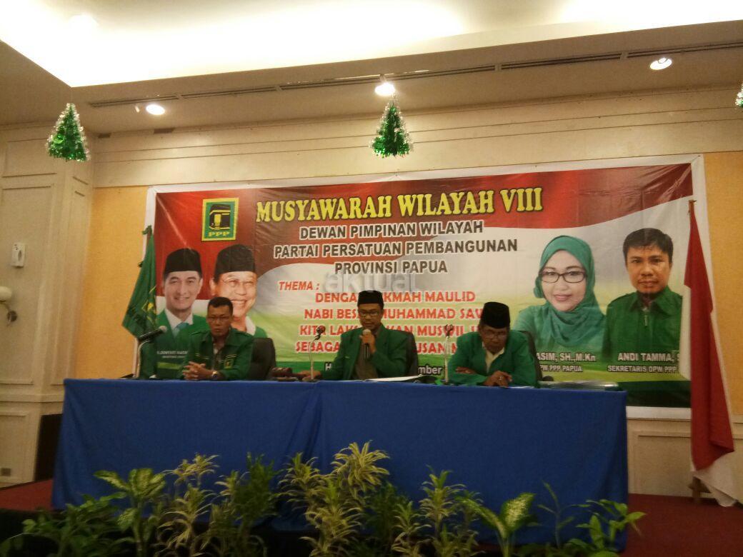 Ketua DPP PPP kubu Djan Faridz, Jafar Alkatiri (memukul gendang) didampingi jajaran pengurus saat membuka Musyawarah Wilayah VIII DPW PPP Provinsi Papua, Minggu (18/12). Muswil digelar untuk konsolidasi internal melakukan reorganisasi kepengurusan secara konstitusional sesuai AD/ART Partai Persatuan Pembangunan, selain itu juga untuk merumuskan program kerja dan persiapan verifikasi Parpol dlm menghadapi pemilu 2019. AKTUAL/HO