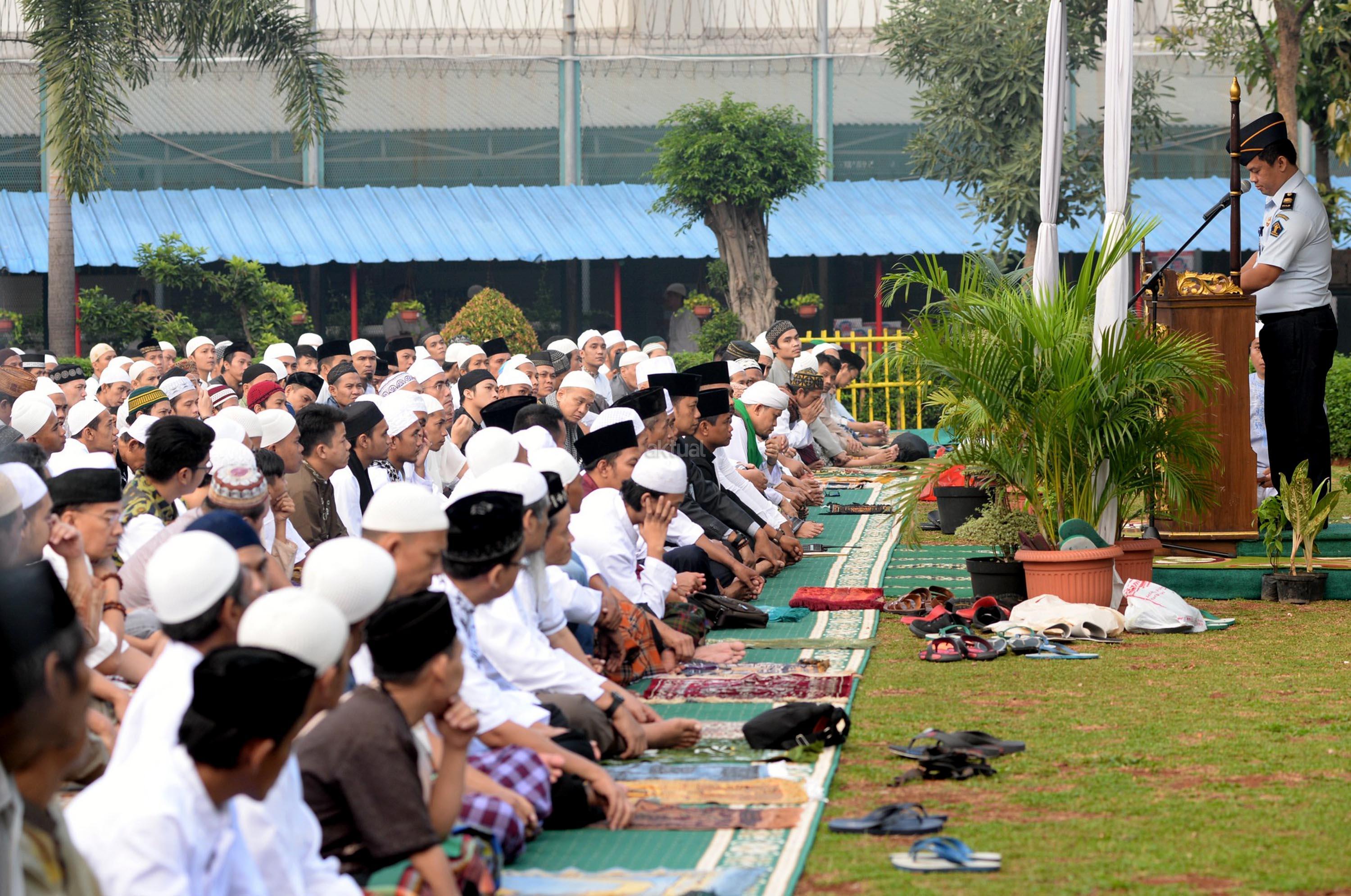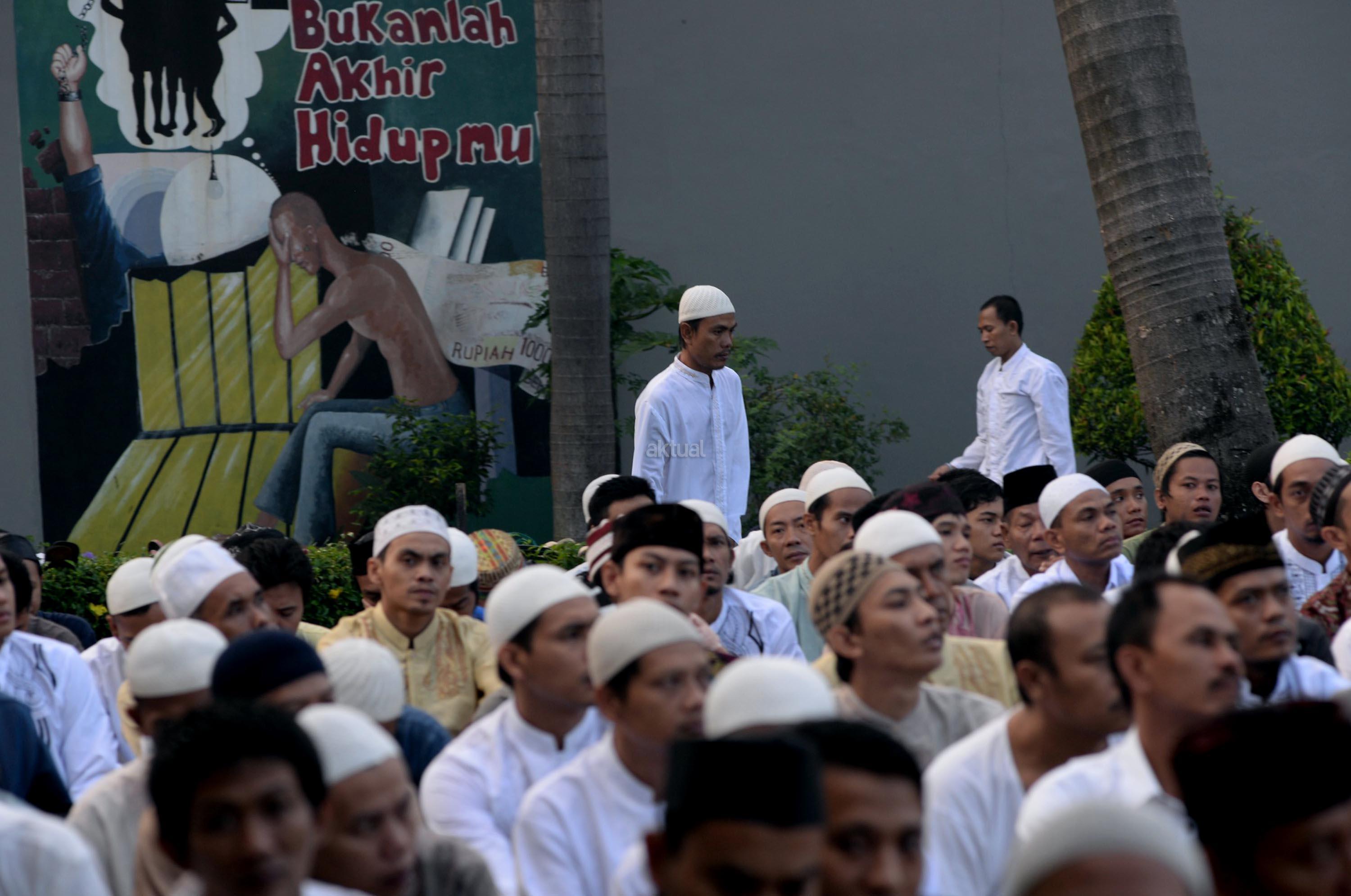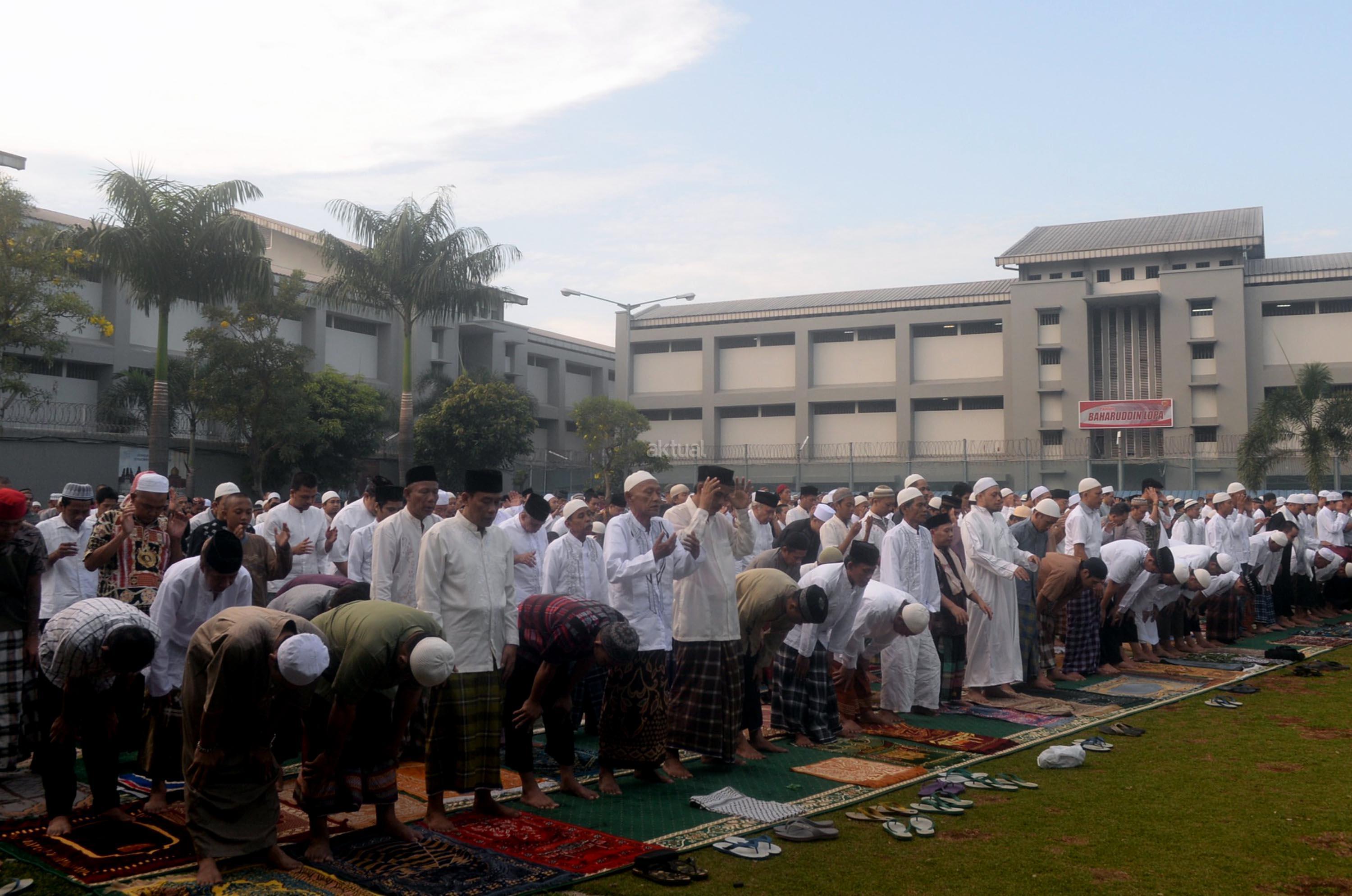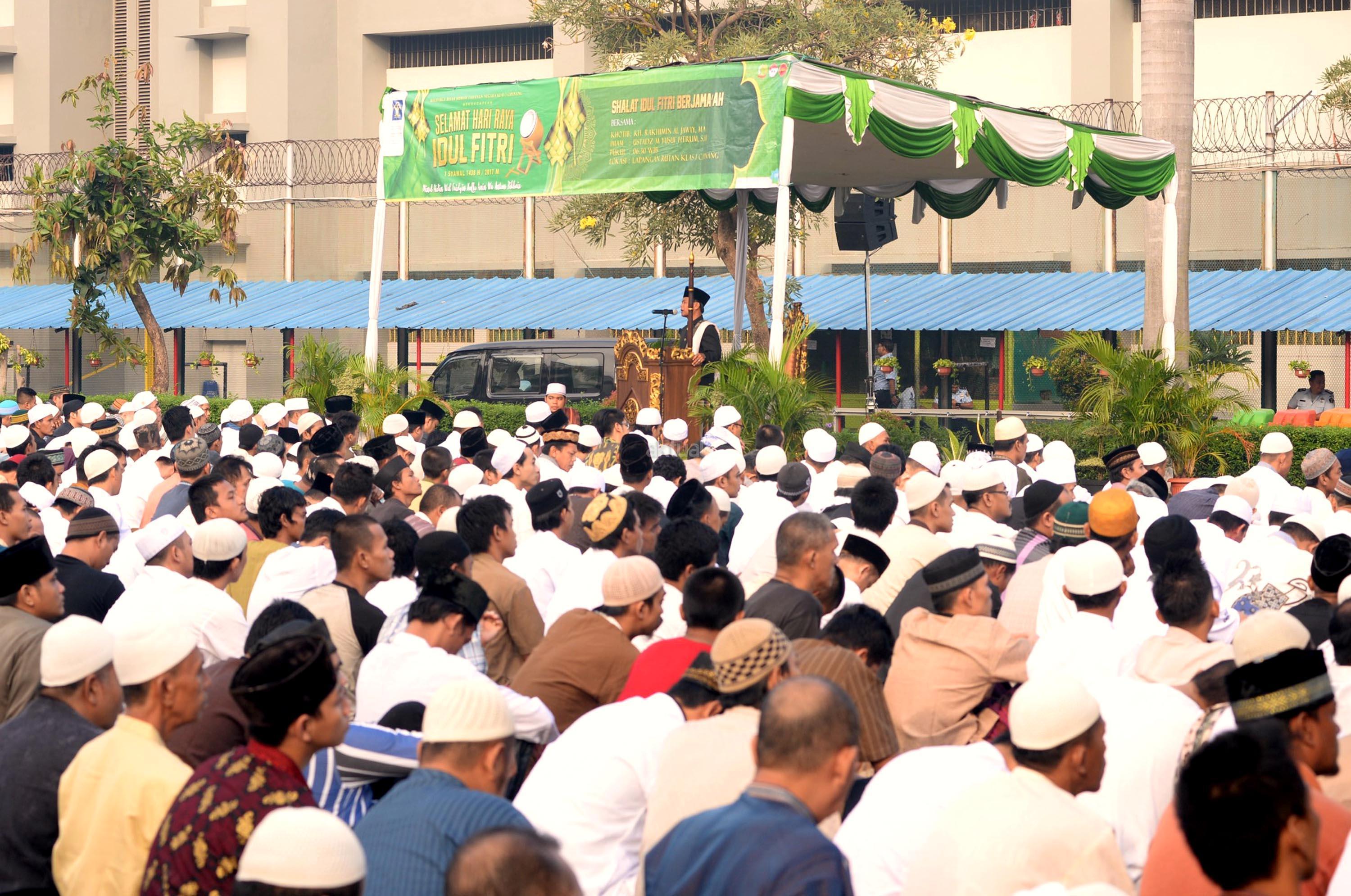 Ribuan narapidana dan petugas lapas melaksanakan Shalat Idul Fitri di Rutan Kelas I Cipinang, Jakarta, Minggu (25/6/2017). Hari Raya Idul Fitri 1438 H disambut umat Muslim dengan melaksanakan Shalat Id di sejumlah masjid dan tempat terbuka. AKTUAL/Munzir