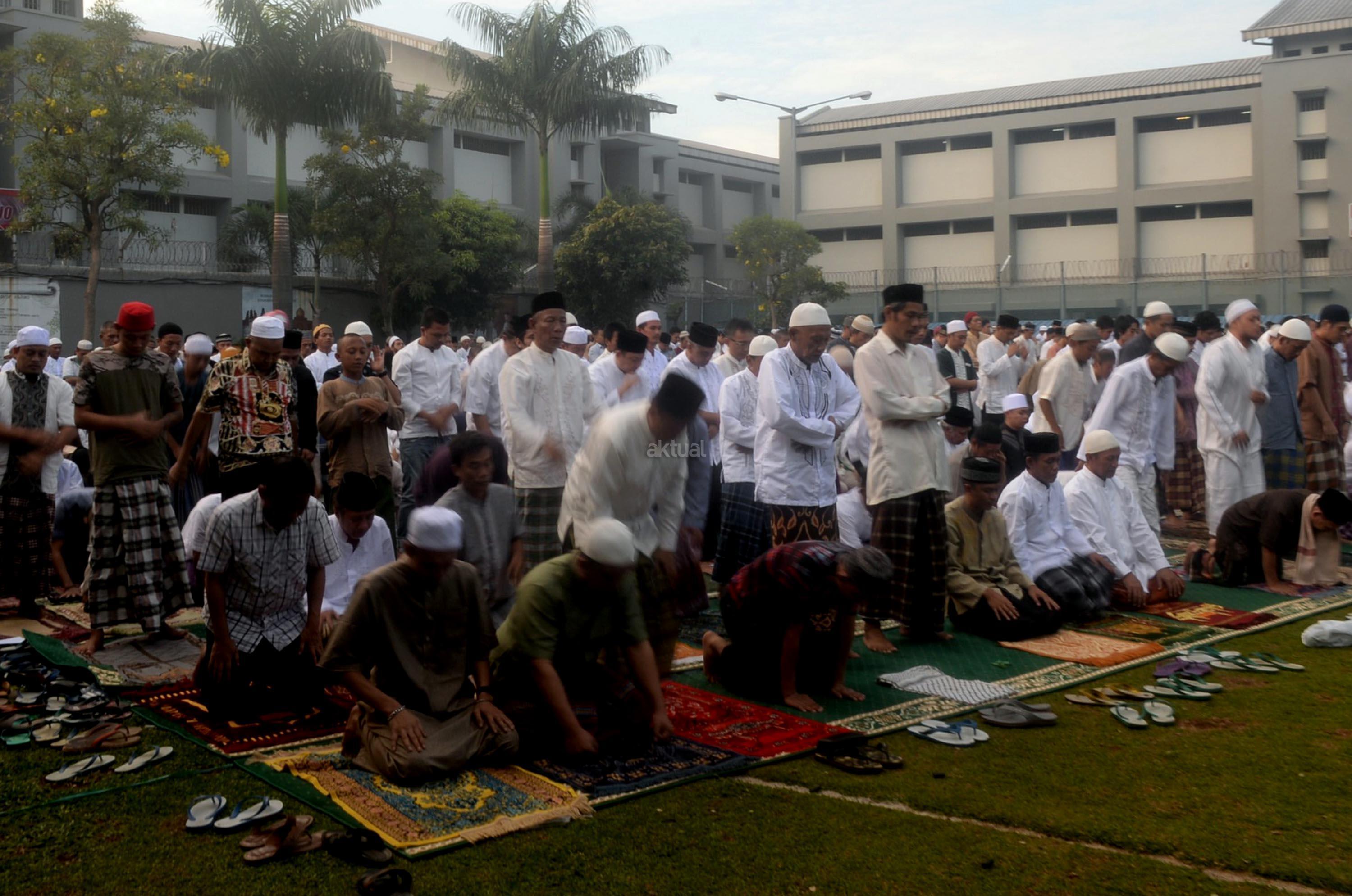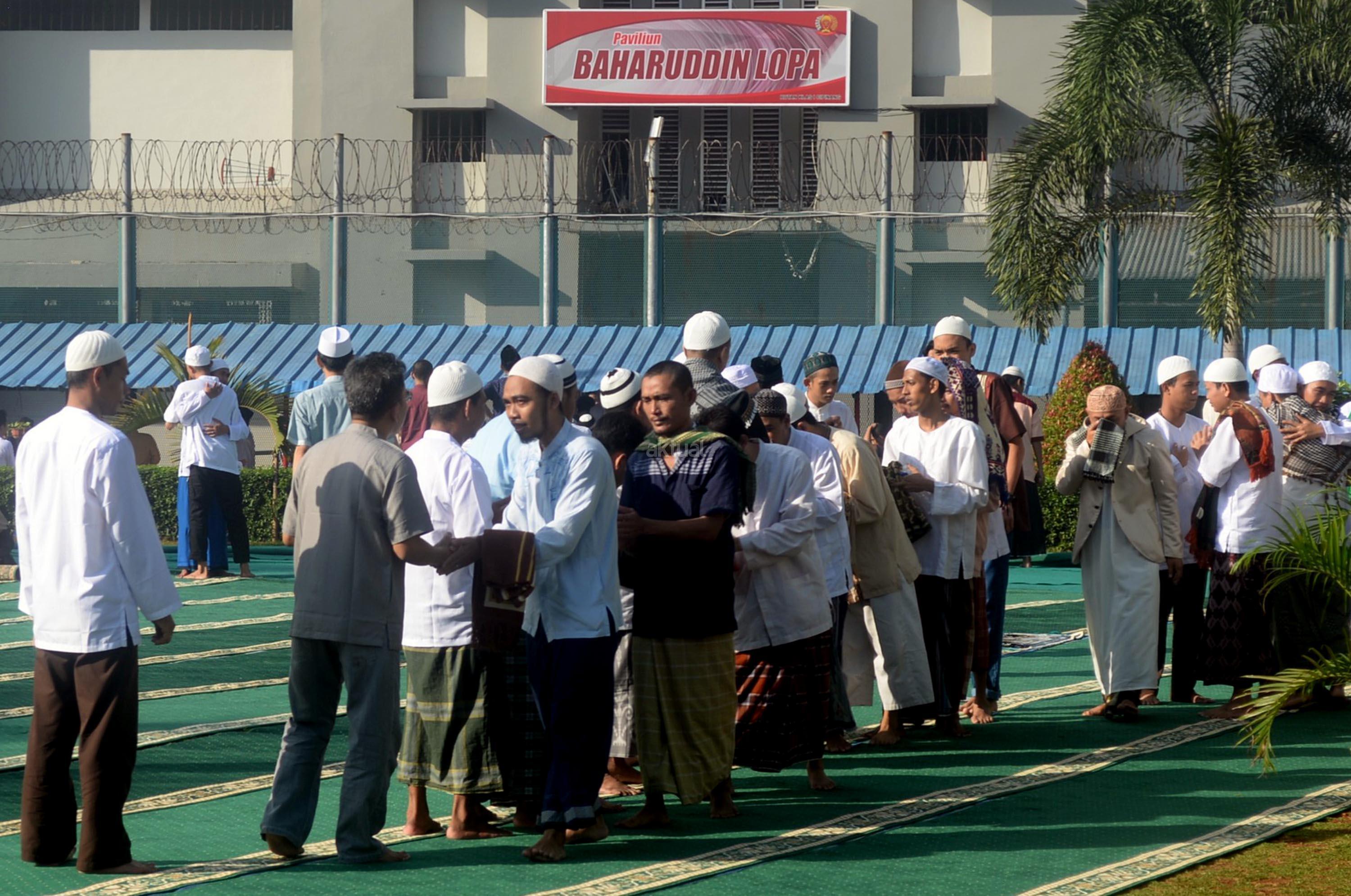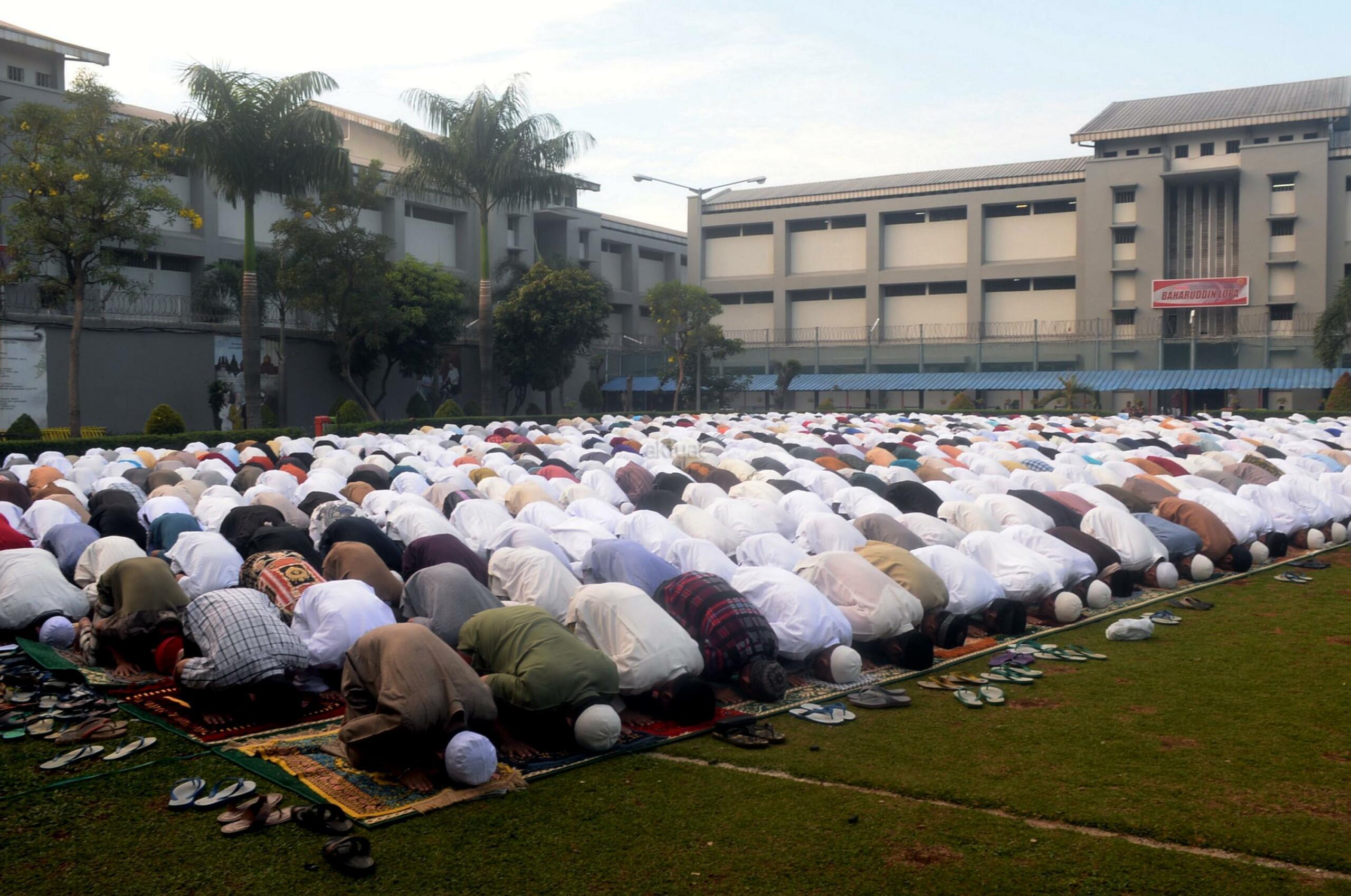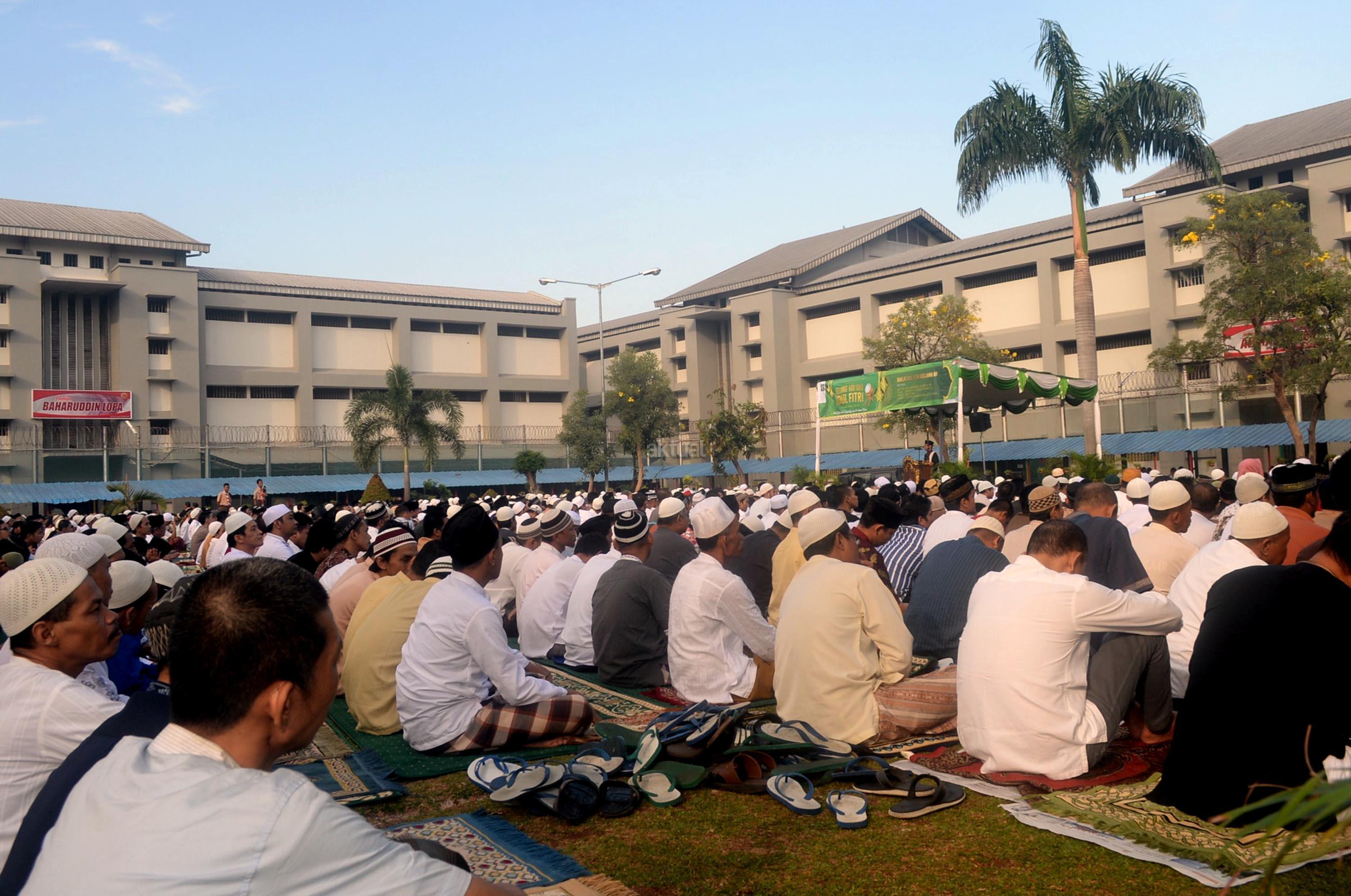 Ribuan narapidana dan petugas lapas melaksanakan Shalat Idul Fitri di Rutan Kelas I Cipinang, Jakarta, Minggu (25/6/2017). Hari Raya Idul Fitri 1438 H disambut umat Muslim dengan melaksanakan Shalat Id di sejumlah masjid dan tempat terbuka. AKTUAL/Munzir