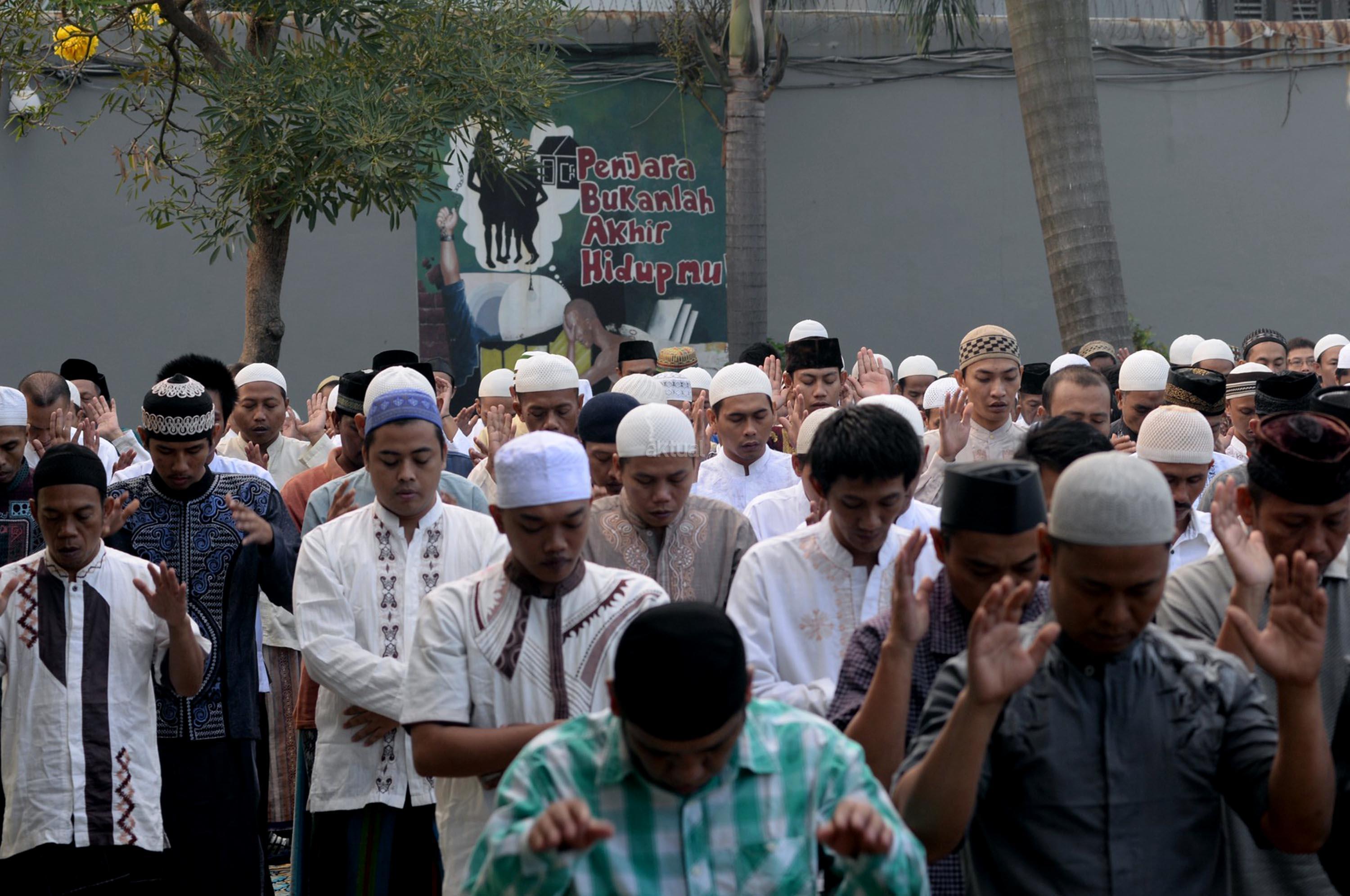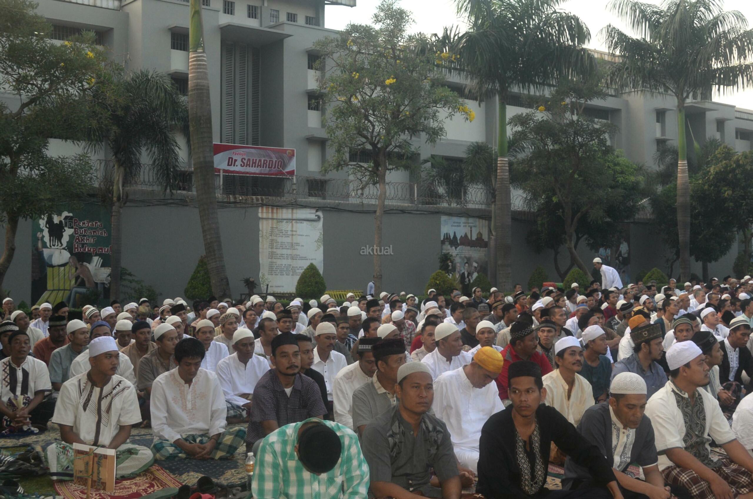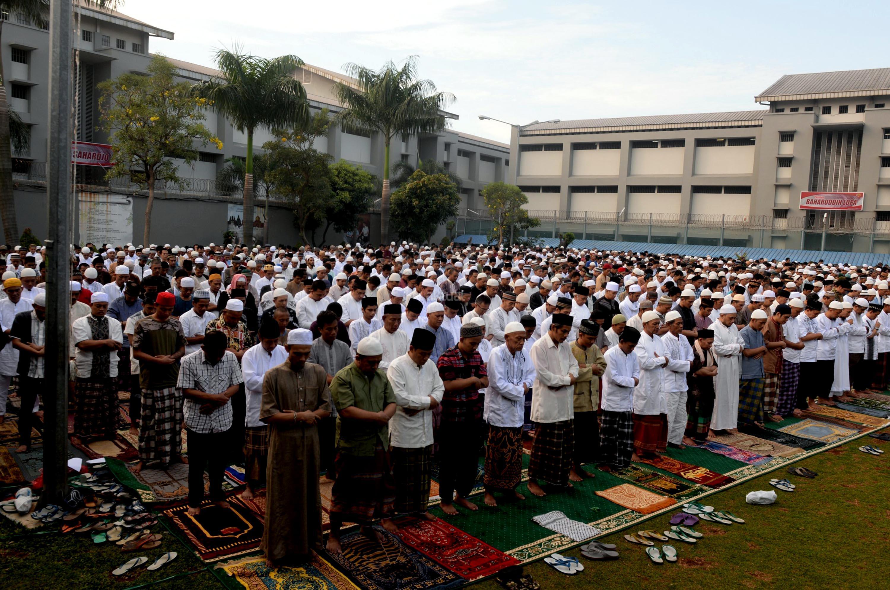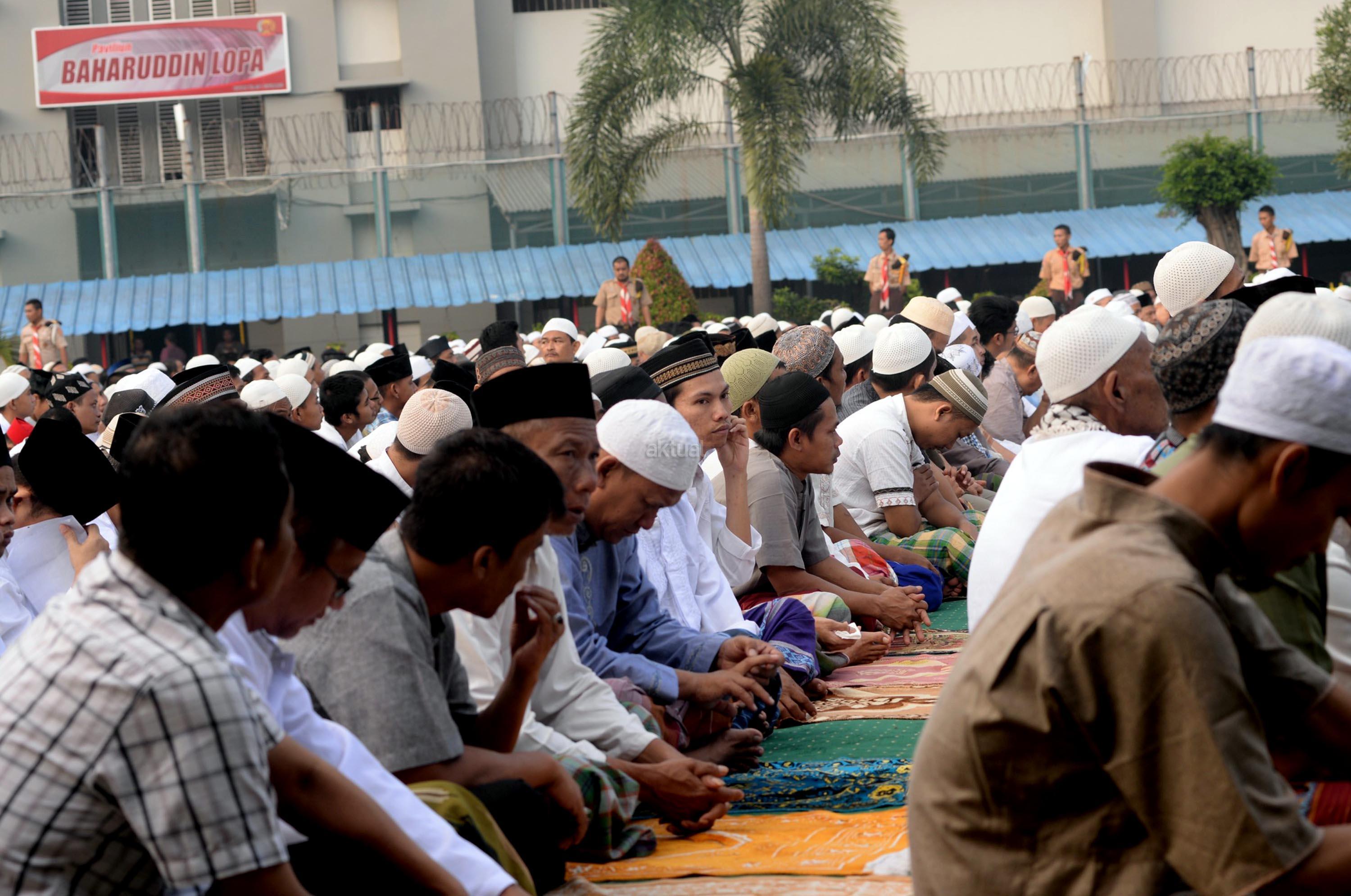 Ribuan narapidana dan petugas lapas melaksanakan Shalat Idul Fitri di Rutan Kelas I Cipinang, Jakarta, Minggu (25/6/2017). Hari Raya Idul Fitri 1438 H disambut umat Muslim dengan melaksanakan Shalat Id di sejumlah masjid dan tempat terbuka. AKTUAL/Munzir