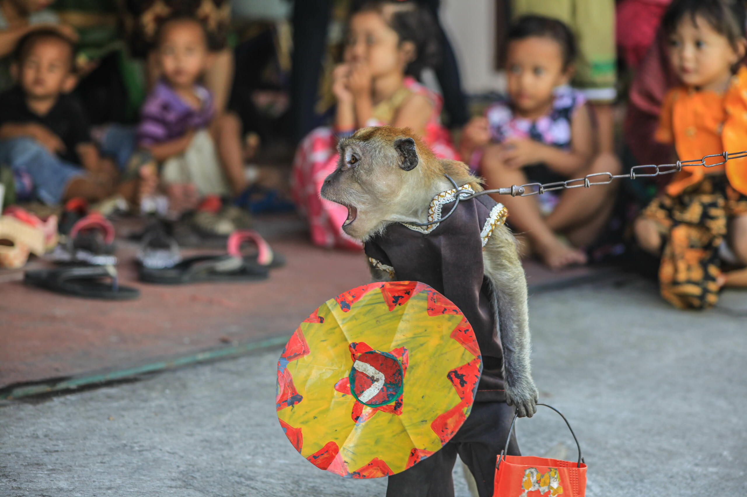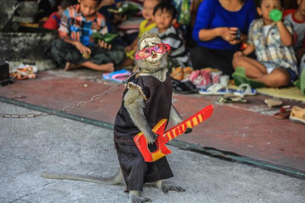 Seekor monyet jenis Ekor Panjang (Macaca fascicularis) beraksi dalam pertunjukan topeng monyet di, Solo, Jawa Tengah, Kamis (5/5). Meski tergolong aman secara jumlah populasi dan penyebarannya, berdasarkan data International Union for Conservation of Nature (IUCN), jenis primata monyet ekor panjang masuk kategori least concern atau risiko rendah, sehingga sangat rentan terhadap perburuan dan perdagangan satwa ilegal.ANTARA FOTO/Maulana Surya/pd/16.