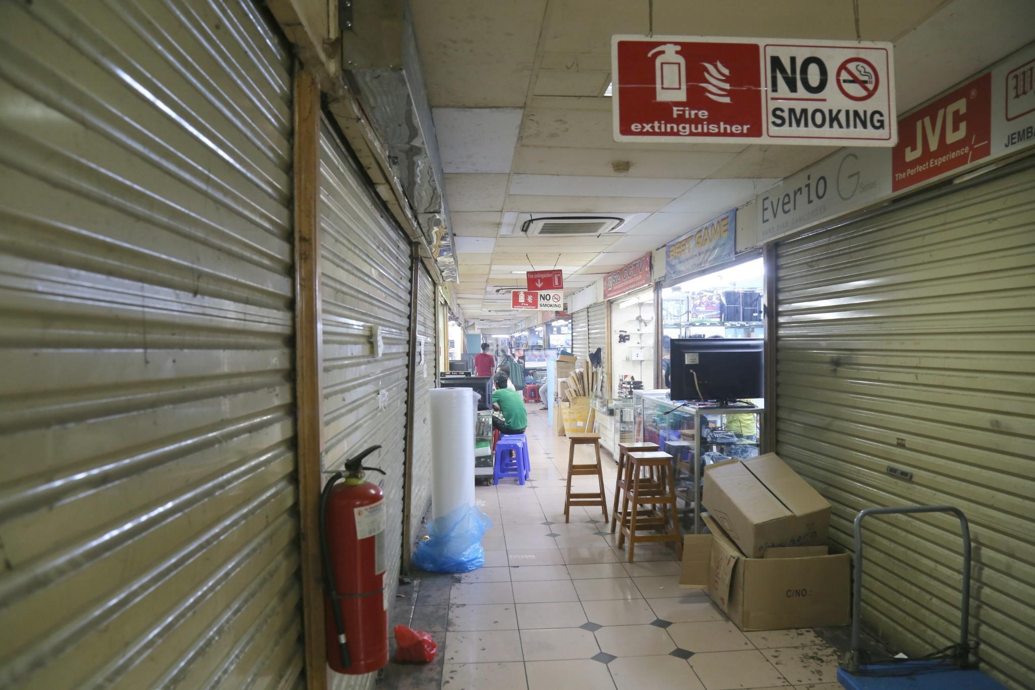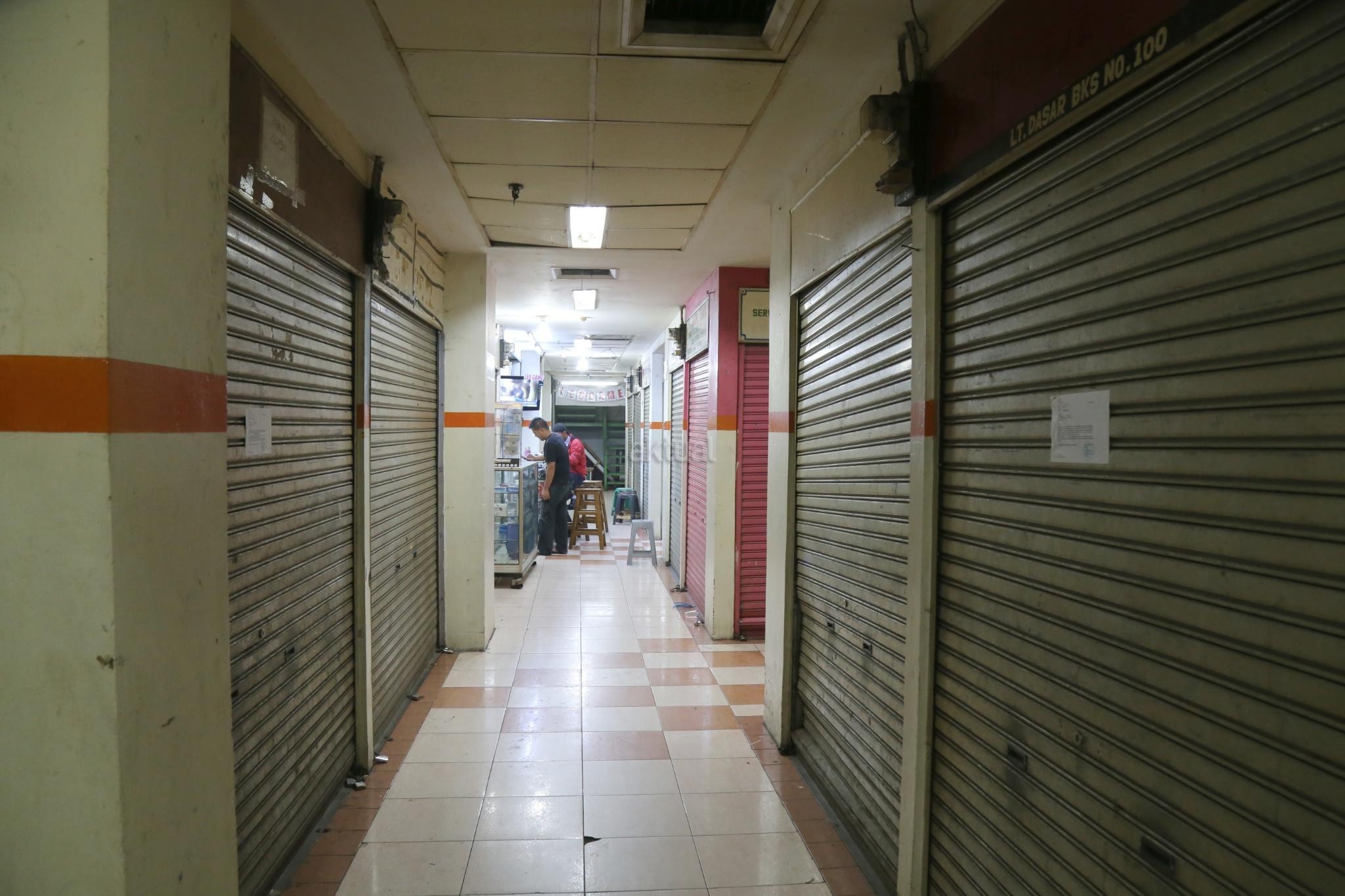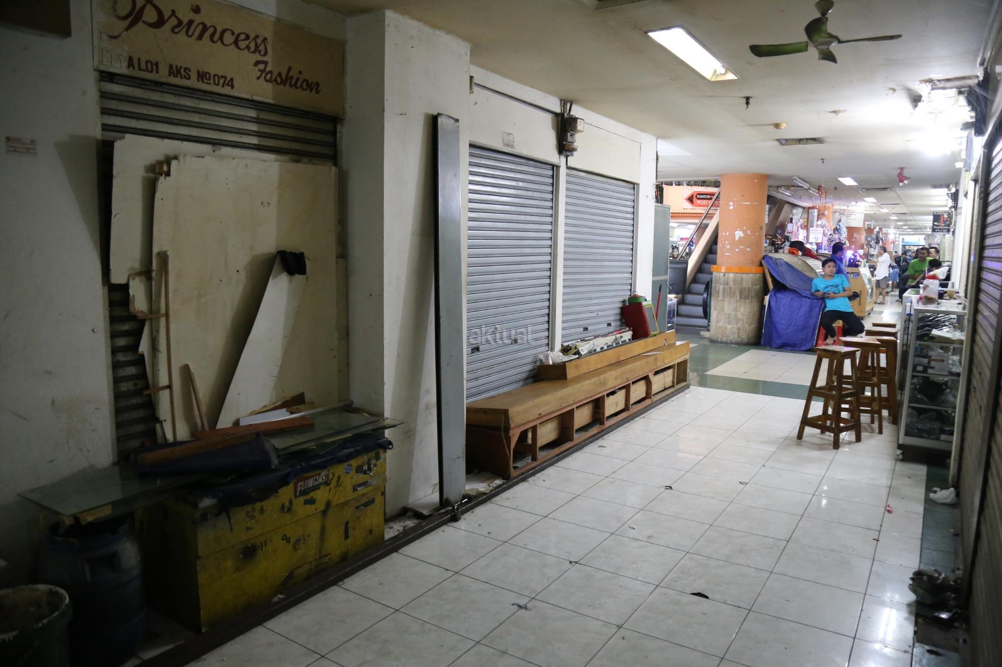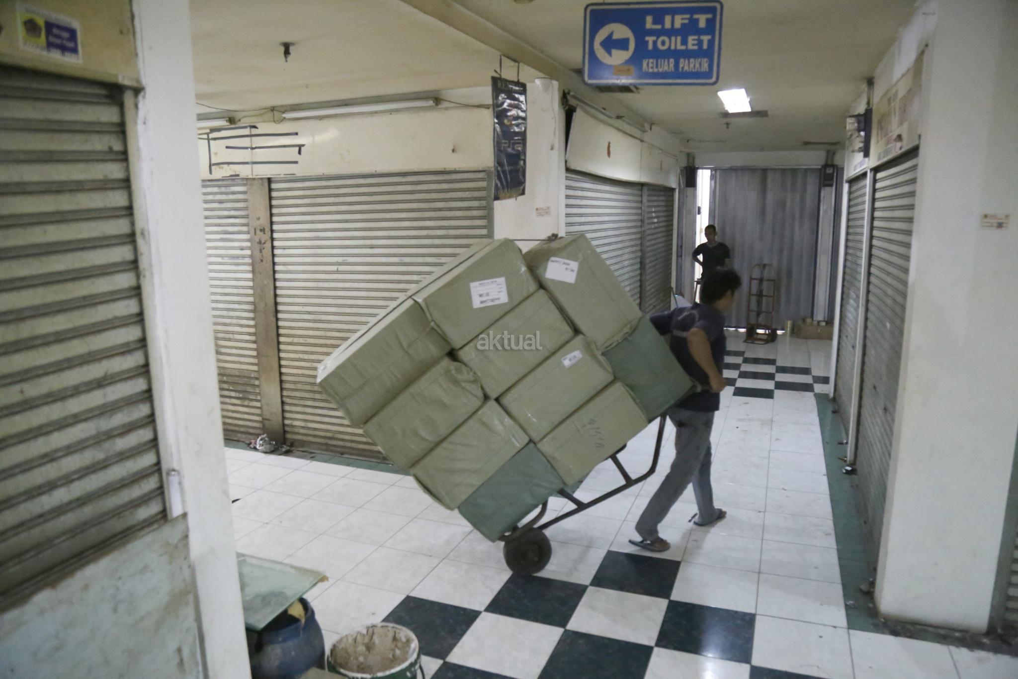 Pekerja membawa barang melewati kios yang tutup di Pusat Elektronik Glodok, Jakarta, Senin (17/7). Sejumlah penjual barang elektronik di kawasan ini mengeluhkan omzet penjualan mereka anjlok. Hal ini dikarenakan maraknya penjualan elektronik melalui situs belanja online. Selain itu fasilitas seperti eskalator banyak yang rusak tidak diperbaiki. AKTUAL/Tino Oktaviano