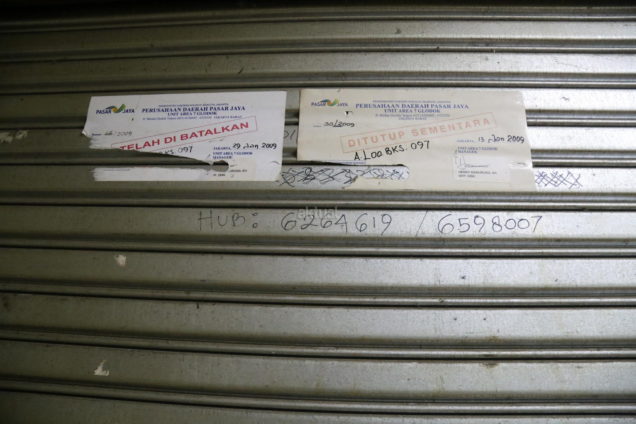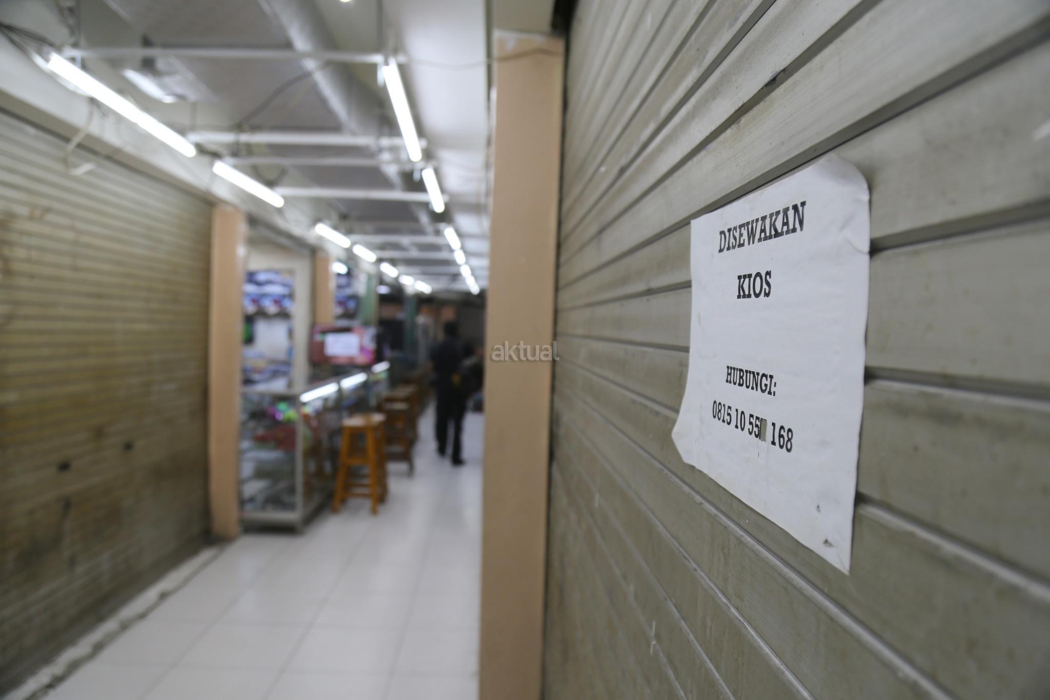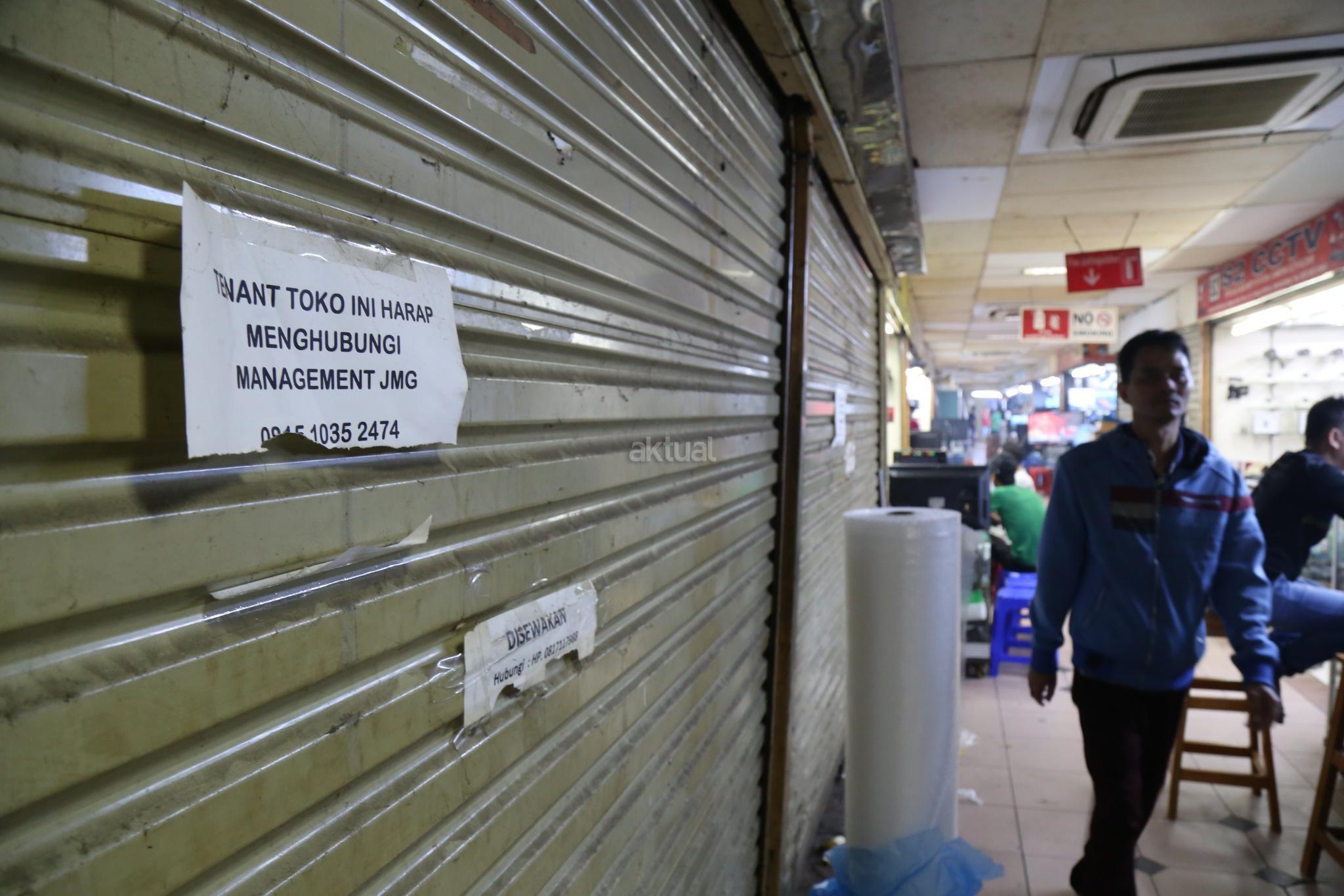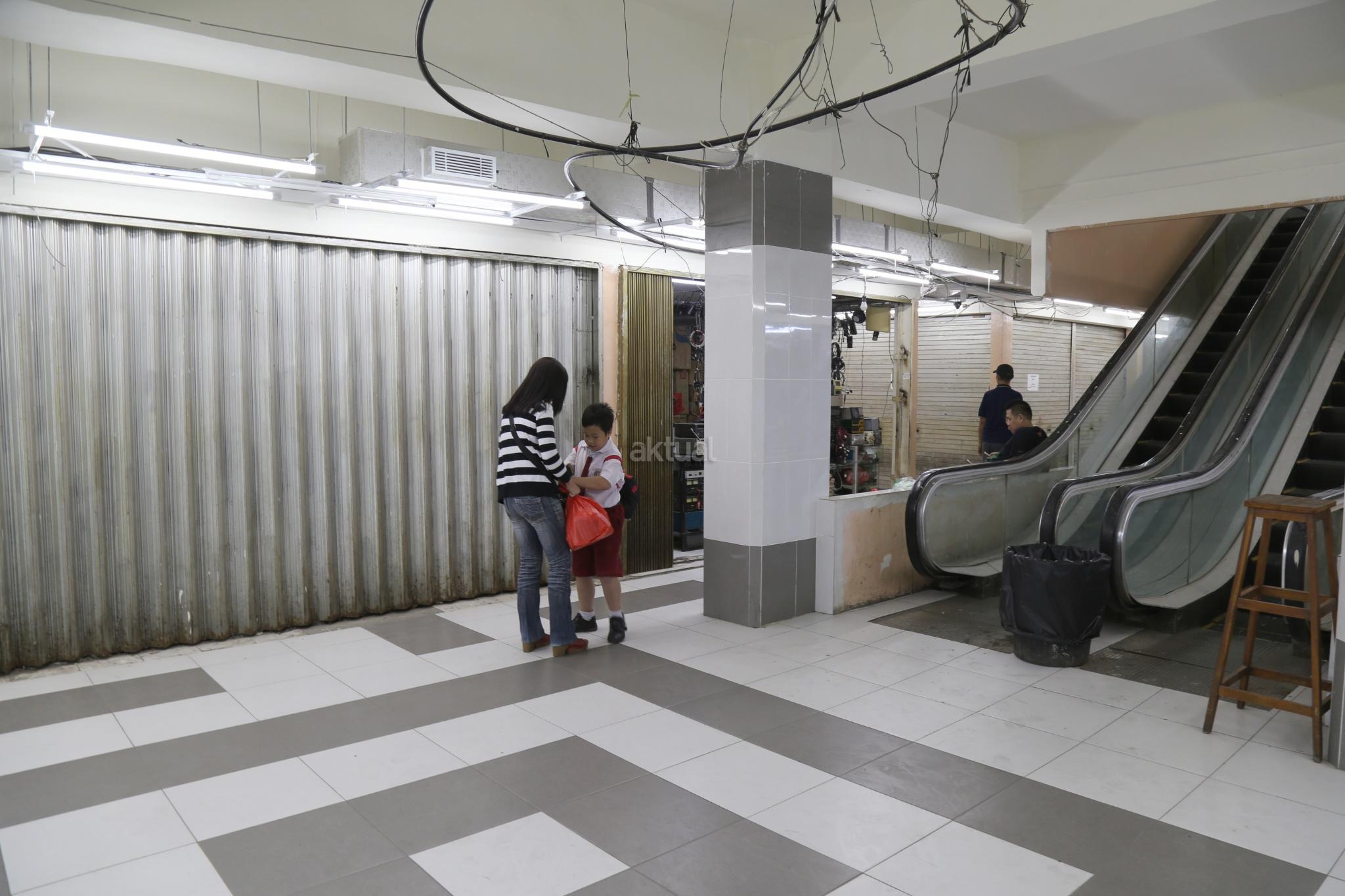 Pengunjung berjalan melewati kios yang tutup di Pusat Elektronik Glodok, Jakarta, Senin (17/7). Sejumlah penjual barang elektronik di kawasan ini mengeluhkan omzet penjualan mereka anjlok. Hal ini dikarenakan maraknya penjualan elektronik melalui situs belanja online. Selain itu fasilitas seperti eskalator banyak yang rusak tidak diperbaiki. AKTUAL/Tino Oktaviano