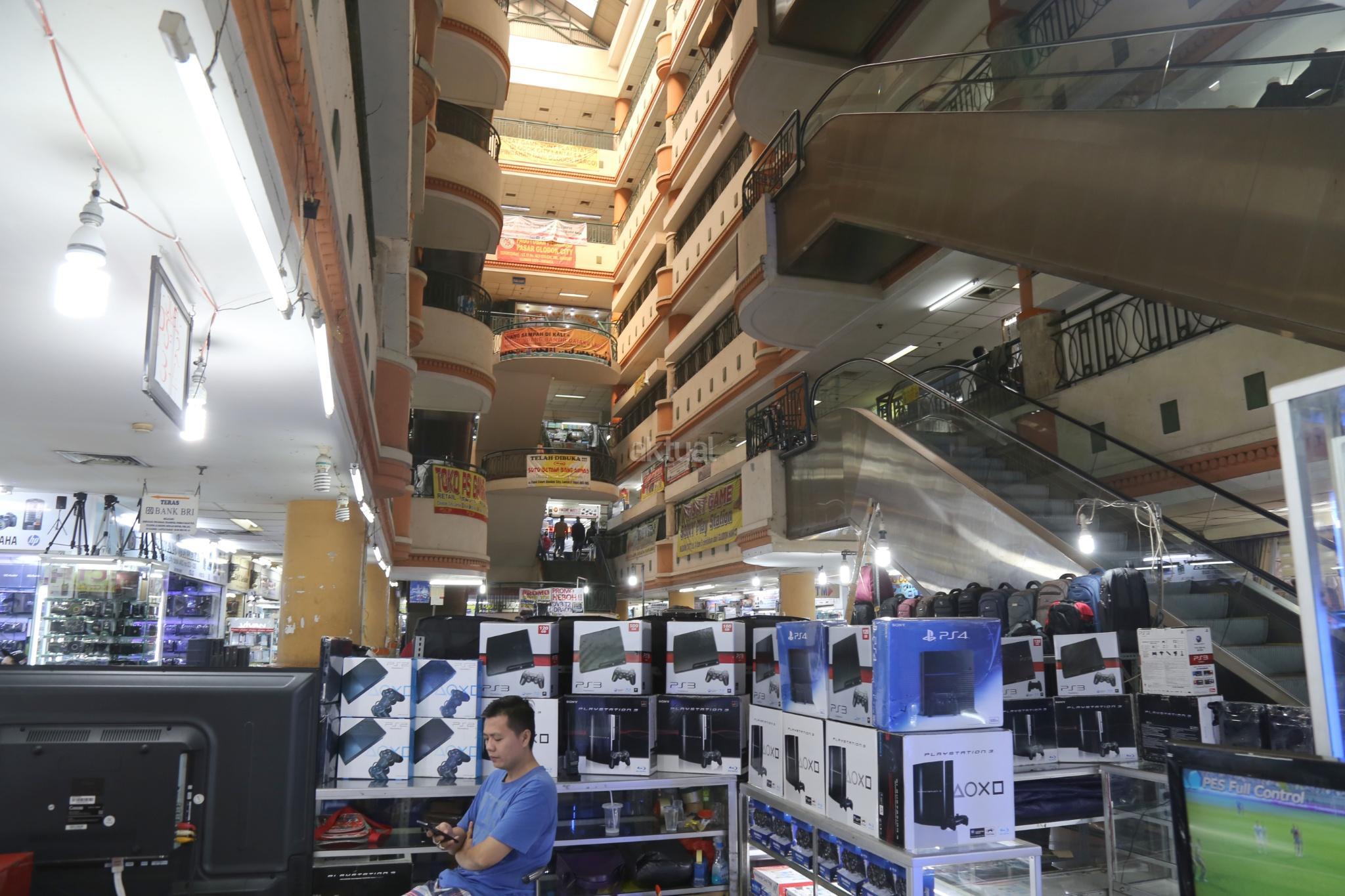 Suasana kios yang buka di Pusat Elektronik Glodok, Jakarta, Senin (17/7). Sejumlah penjual barang elektronik di kawasan ini mengeluhkan omzet penjualan mereka anjlok. Hal ini dikarenakan maraknya penjualan elektronik melalui situs belanja online. Selain itu fasilitas seperti eskalator banyak yang rusak tidak diperbaiki. AKTUAL/Tino Oktaviano