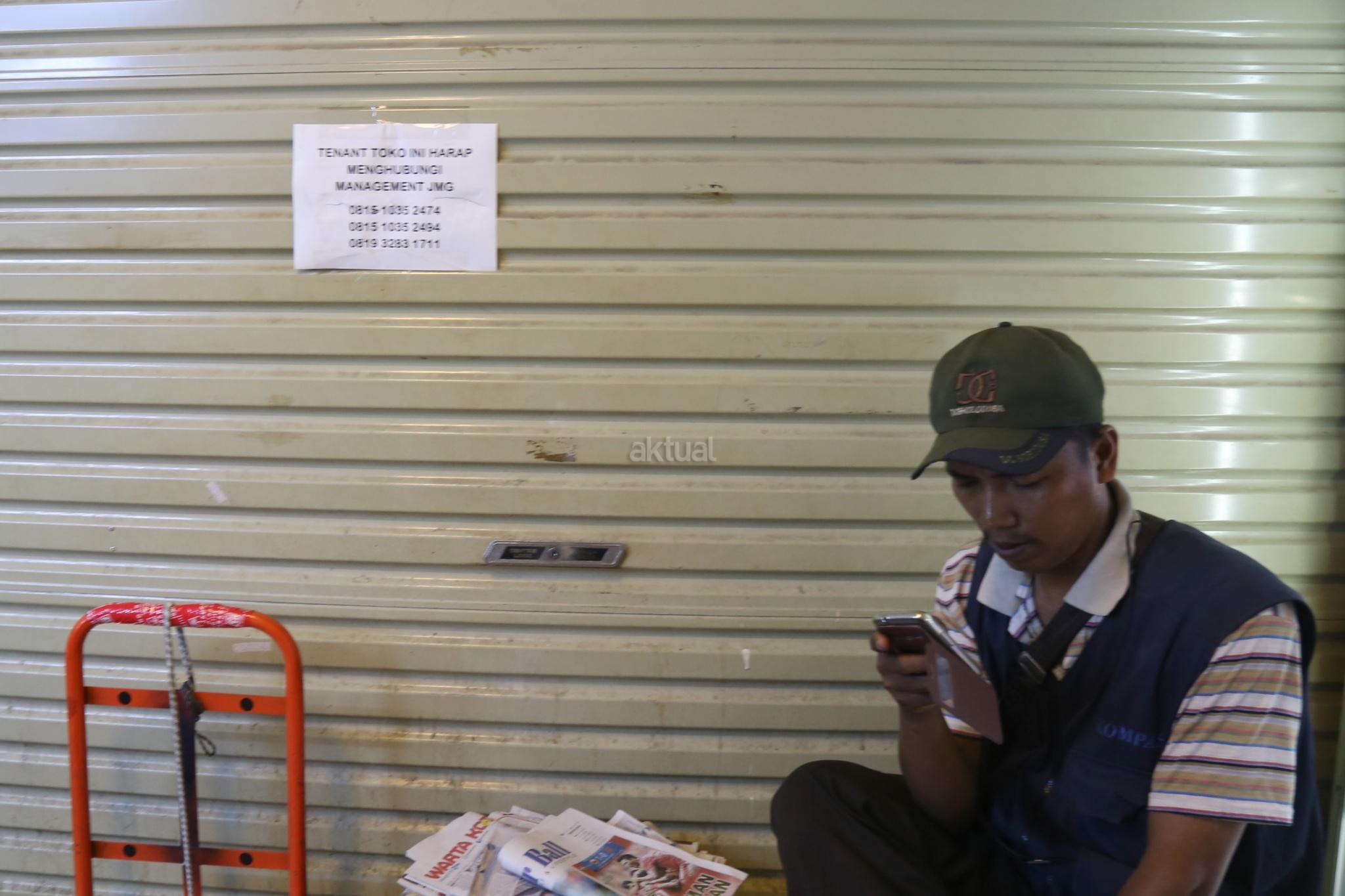 Pedagang korang duduk dekat kios yang tutup di Pusat Elektronik Glodok, Jakarta, Senin (17/7). Sejumlah penjual barang elektronik di kawasan ini mengeluhkan omzet penjualan mereka anjlok. Hal ini dikarenakan maraknya penjualan elektronik melalui situs belanja online. Selain itu fasilitas seperti eskalator banyak yang rusak tidak diperbaiki. AKTUAL/Tino Oktaviano