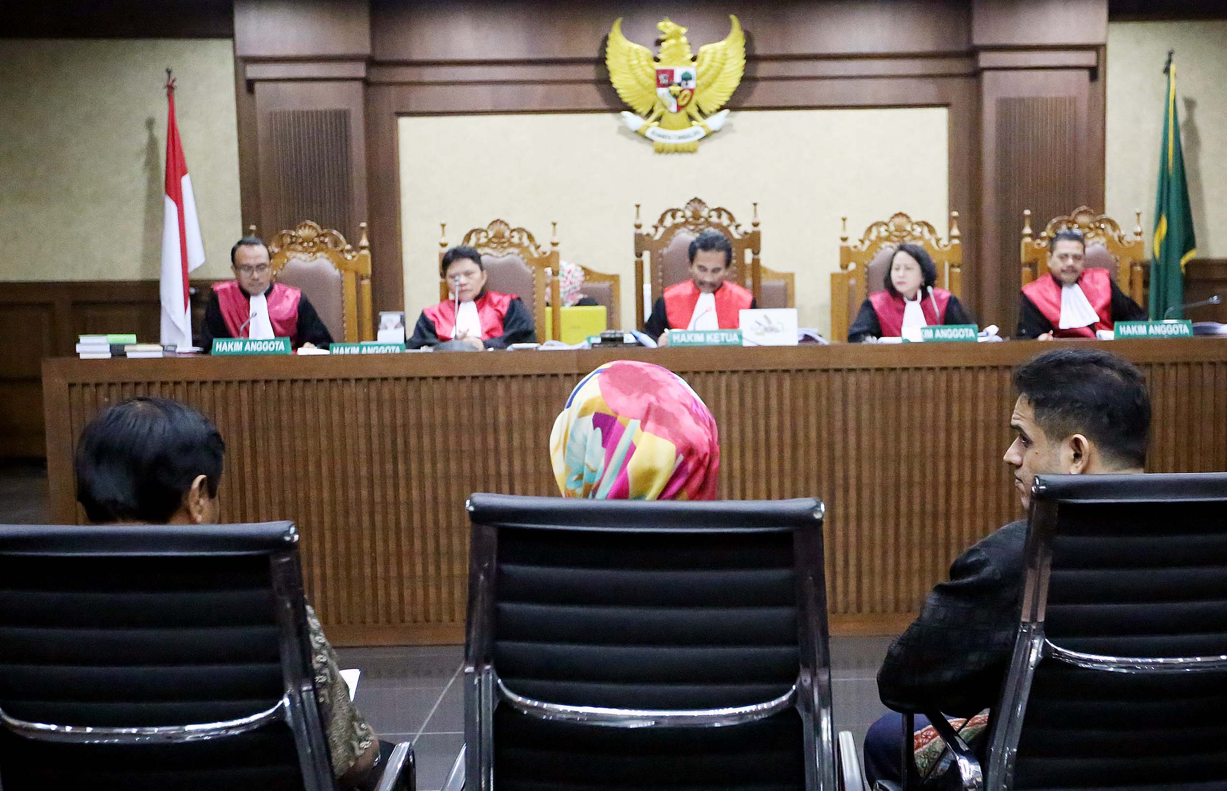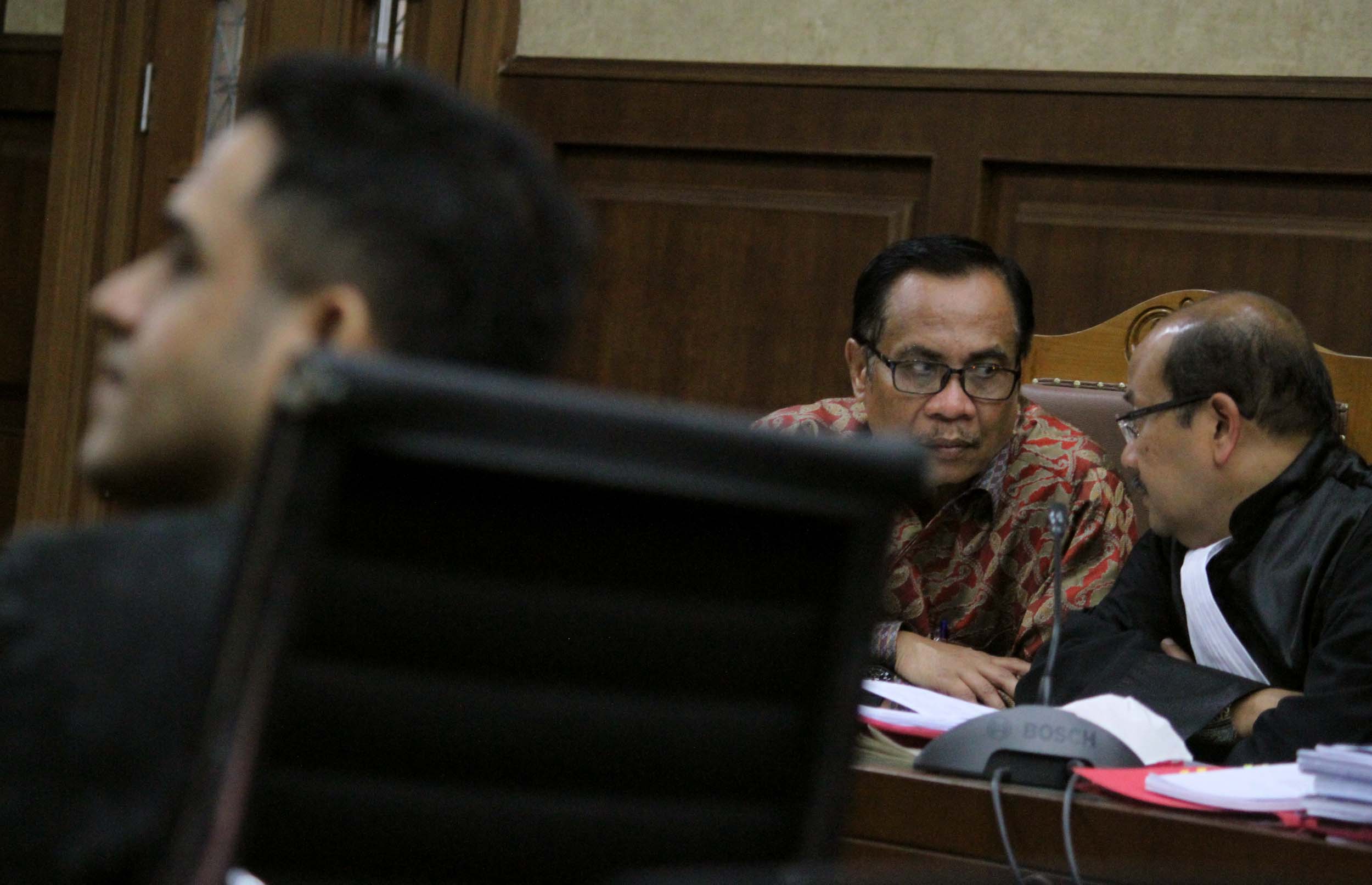 Mantan Bendahara Umum Partai Demokrat M Nazaruddin (kanan), saat menjadi saksi dalam sidang lanjutan kasus proyek pengadaan paket penerapan Kartu Tanda Penduduk berbasis Nomor Induk Kependudukan secara nasional (e-KTP) di Pengadilan Tipikor, Jakarta, Senin (3/4/2017). Selain Nazaruddin, Jaksa Penuntut Umum KPK dijadwalkan memanggil sembilan saksi lainnya, yakni Dian Hasanah, M Jafar Hafsah, Khatibul Umam, Yosep Sumartono, Vidi Gunawan, Munawar, Melchias Marcus Mekeng, Olly Dondokambey, dan Eva Omvita. AKTUAL/Munzir
