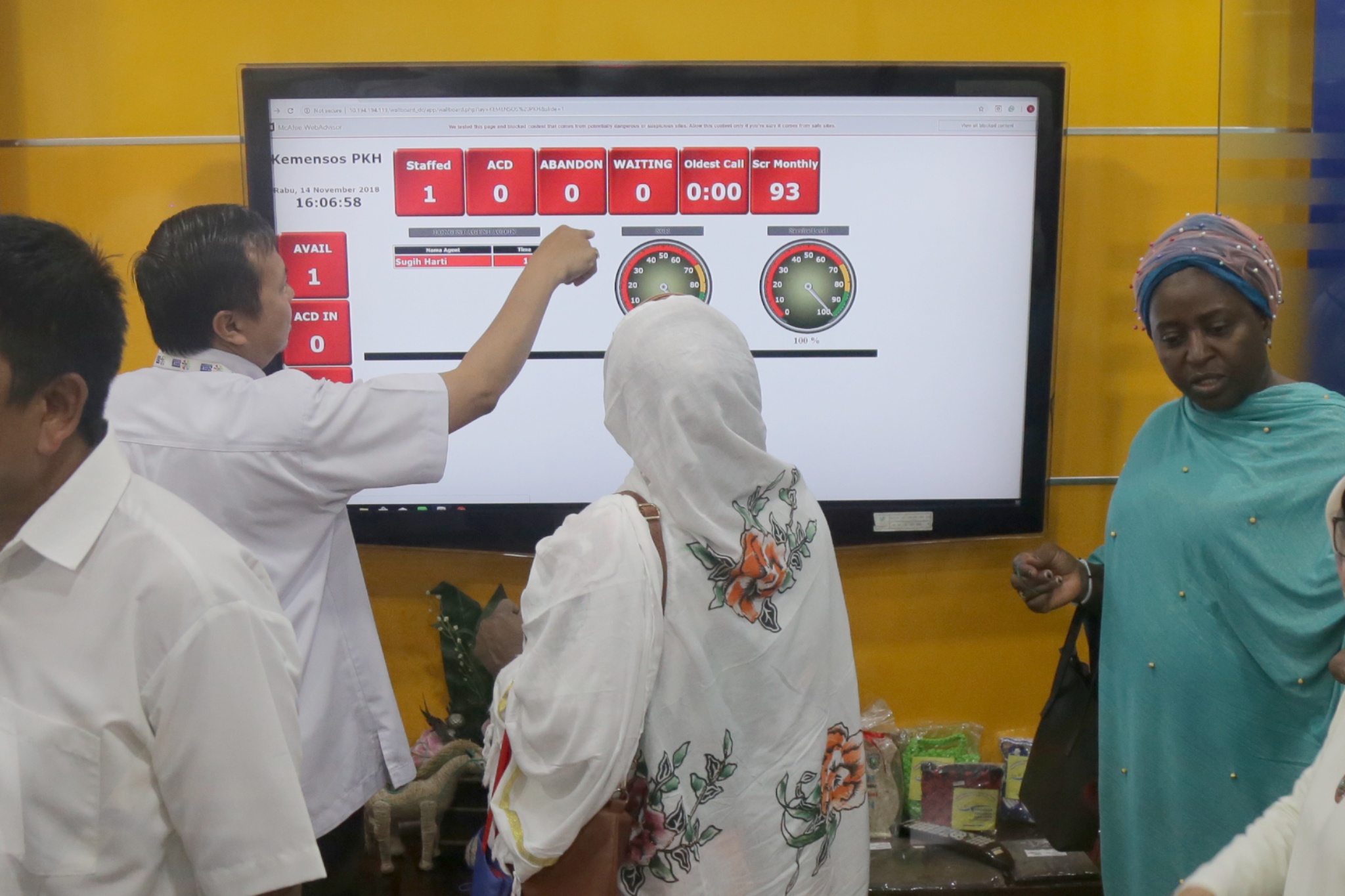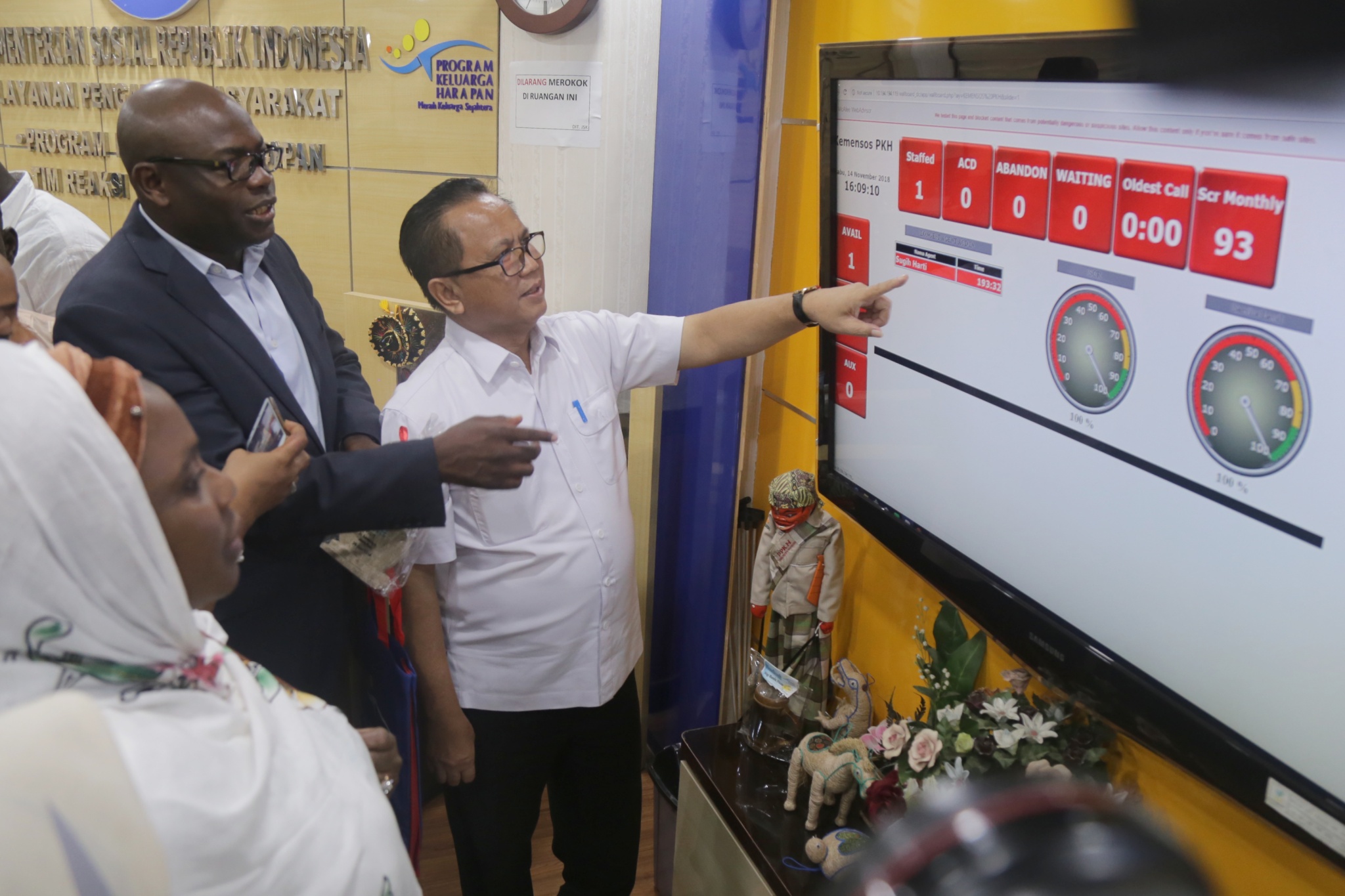 Staf Jaminan Sosial Keluarga Kemensos RI menjelaskan Program Keluarga Harapan (PKH) kepada Staf Negeria Cash Transfer Office, di Contact Centre PKH, Kementerian Sosial, Jakarta, Rabu (14/11/2018). Nur Pujianto mengatakan PKH berhasil menekan angka kemiskinan menjadi dibawah 10%. AKTUAL/Tino Oktaviano