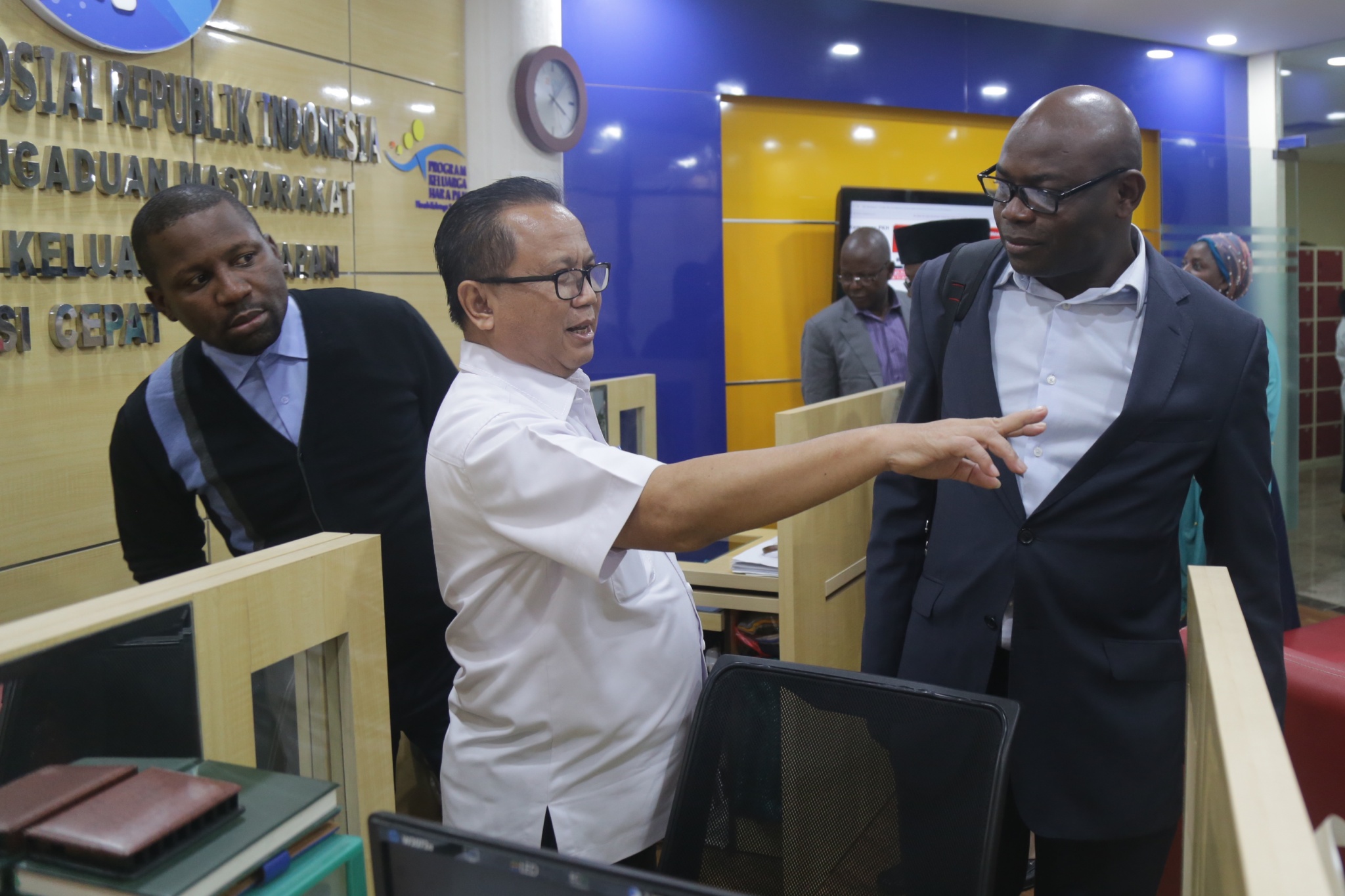 Direktur Jaminan Sosial Keluarga Kemensos RI Nur Pujianto (kiri) mendampingi Assistant Project Accountant Negeria Cash Transfer Office Adam Ibraheem Salisu (tengah) mendengarkan penjelasan mengenai Program Keluarga Harapan (PKH), di Contact Centre PKH, Kementerian Sosial, Jakarta, Rabu (14/11/2018). Nur Pujianto mengatakan PKH berhasil menekan angka kemiskinan menjadi dibawah 10%. AKTUAL/Tino Oktaviano