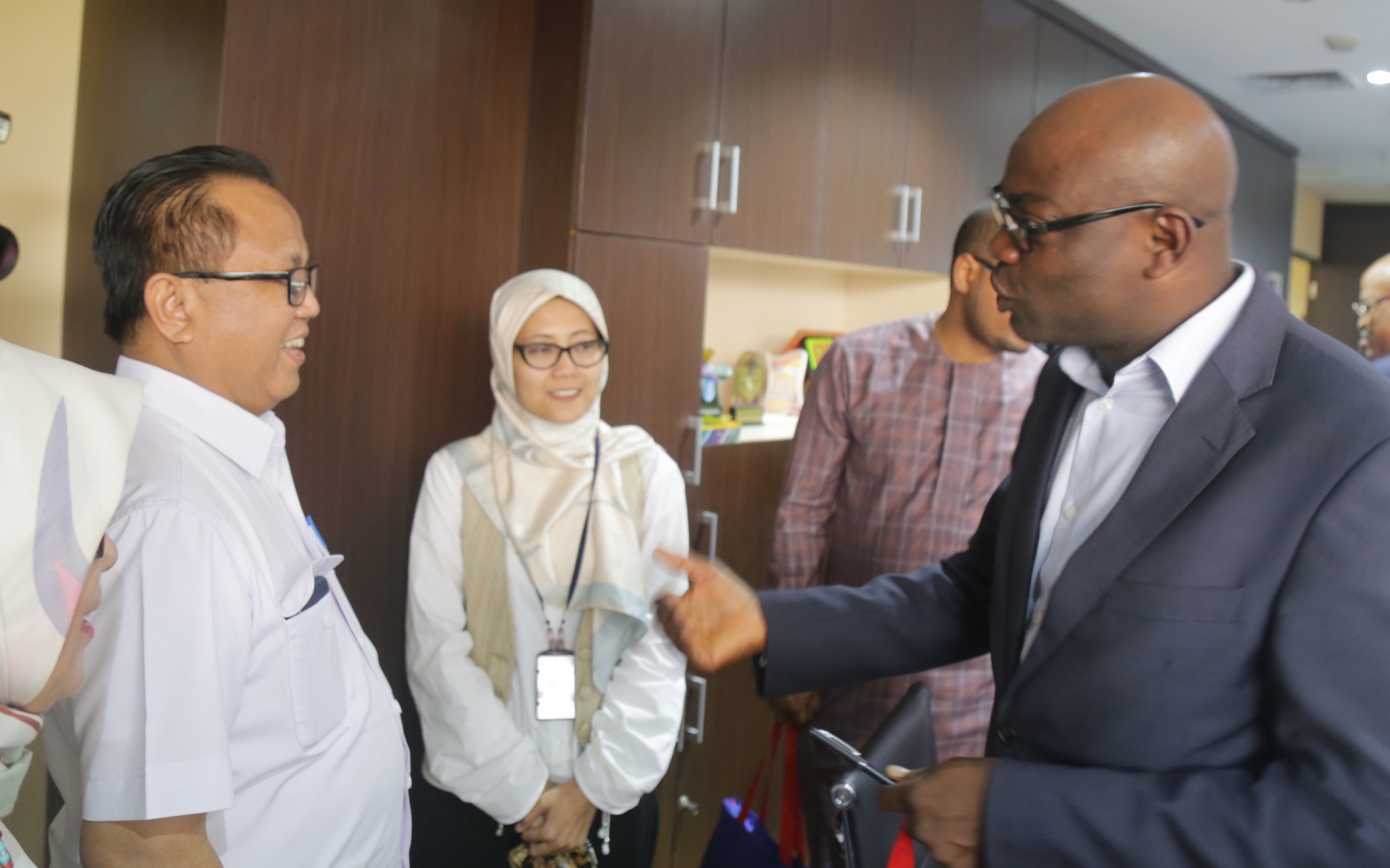 Direktur Jaminan Sosial Keluarga Kemensos RI Nur Pujianto (tengah) menjelaskan Program Keluarga Harapan (PKH) kepada Assistant Project Accountant Negeria Cash Transfer Office Adam Ibraheem Salisu (kanan), di Contact Centre PKH, Kementerian Sosial, Jakarta, Rabu (14/11/2018). Nur Pujianto mengatakan PKH berhasil menekan angka kemiskinan menjadi dibawah 10%. AKTUAL/Tino Oktaviano