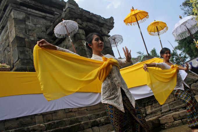 Dua seniman membawakan tari Rejang sebelum diadakan upacara Ngembak Geni di Candi Badut, Malang, Jawa Timur, Kamis (10/3). Upacara yang diadakan di komplek situs purbakala peninggalan dari kerajaan Kanjuruhan pada abad 8 Masehi tersebut merupakan penutup rangkaian Hari Raya Nyepi. ANTARA FOTO/Ari Bowo Sucipto/foc/16.