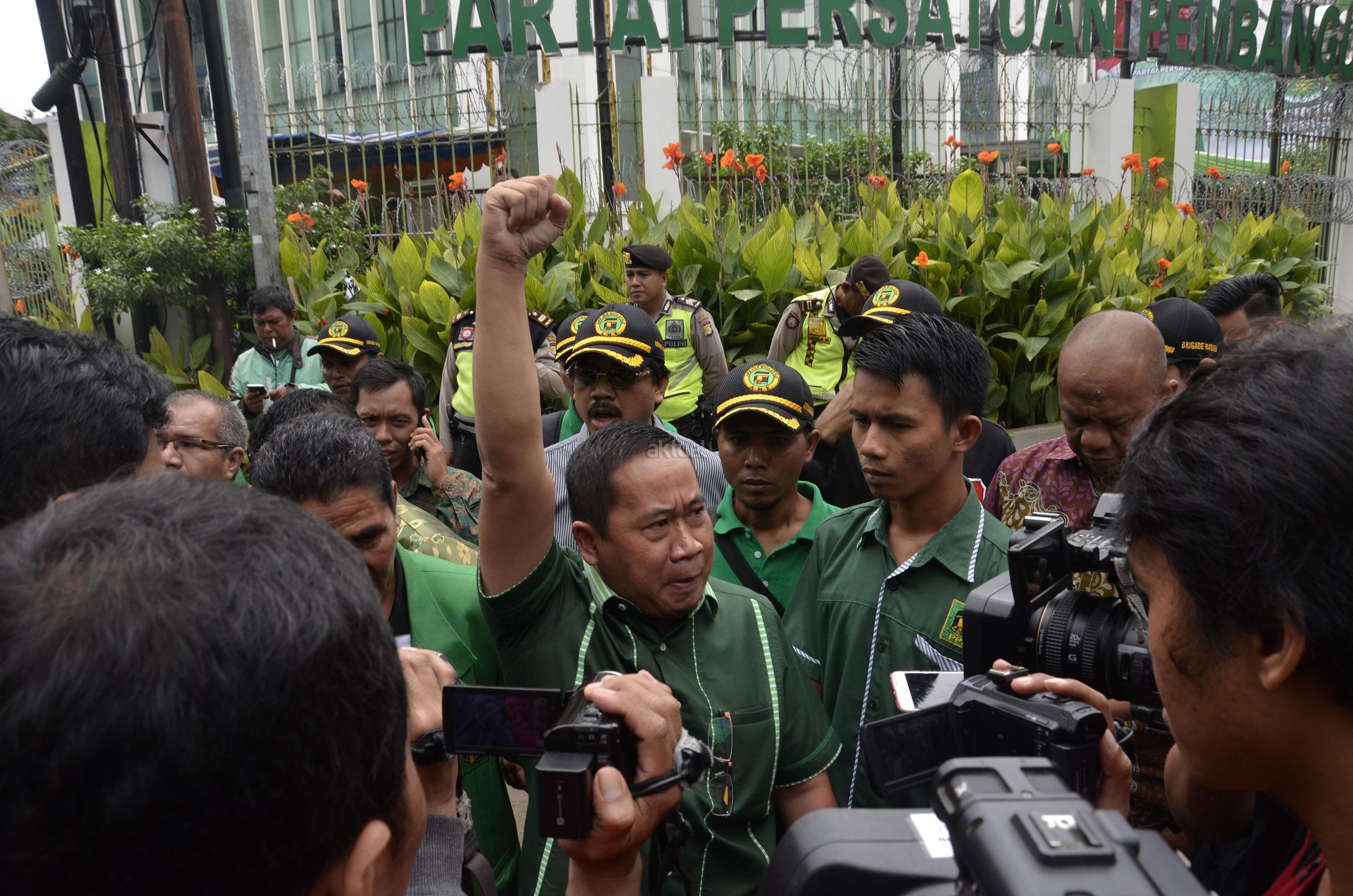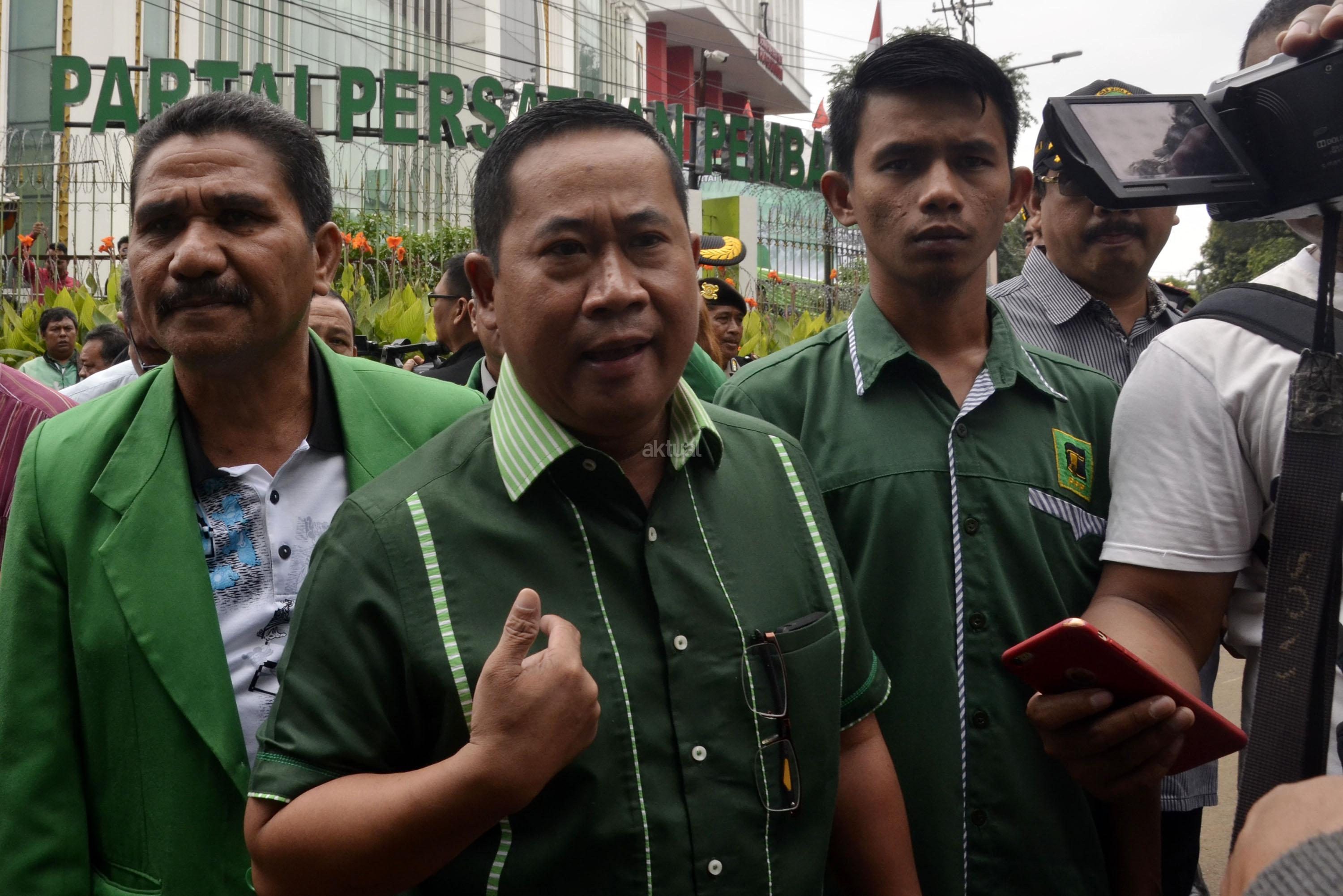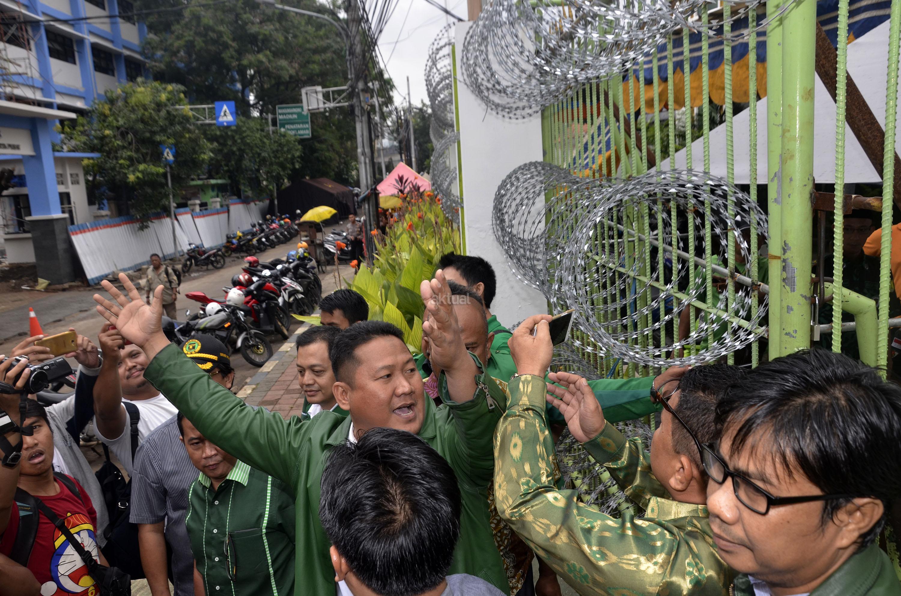 Wakil Sekjen DPP PPP Muktamar Jakarta Sudarto (tengah) mengepalkan tangan saat akan bersilaturami dikantor DPP PPP di Jakarta, Kamis (21/12/2017). PPP kubu Djan Faridz dihadang pendukung PPP Romahurmuziy ketika akan melakukan silaturahmi di Kantor DPP PPP, sempat terjadi Kekisruhan lantaran niat baik pengurus DPP dan DPW PPP Muktamar Jakarta untuk bersilaturahmi dengan pengurus PPP kubu Romahurmuziy ditolak oleh pendukung Romahurmuziy. Wasekjen DPP PPP kubu Djan Faridz Sudarto menegaskan, secara legal pihaknya lah yang seharusnya menempati kantor tersebut. AKTUAL/Tino Oktaviano