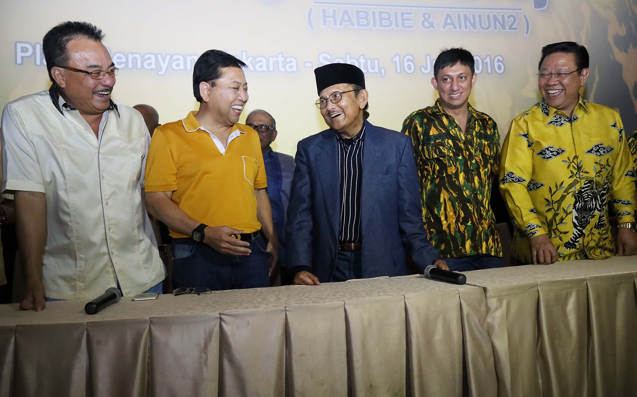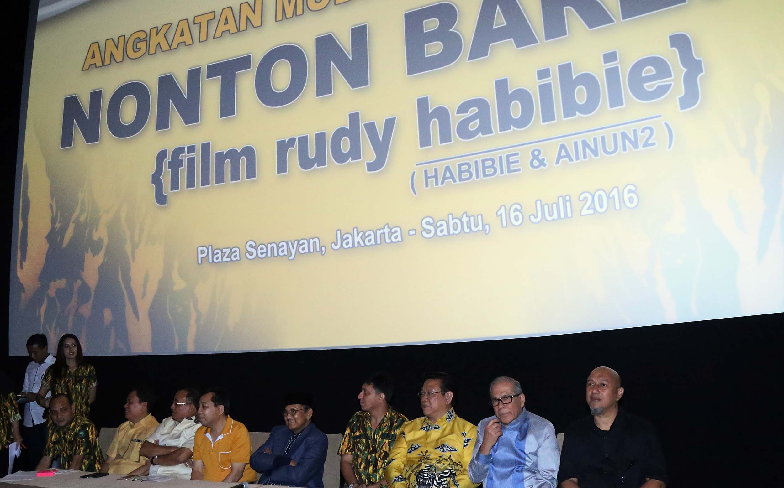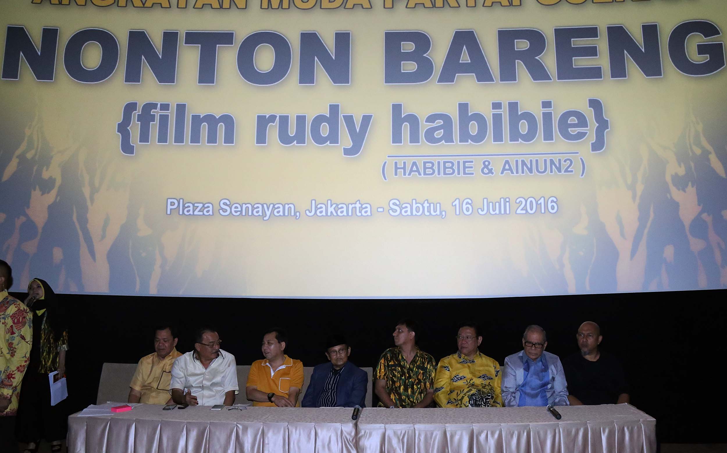 Kiri-kanan ; Bendahara Umum Partai Golkar Robert Joppy Kardinal, Ketua Umum Partai Golkar Setya Novanto, Presiden RI ke -3 B.J Habibie, Ketua Umum AMPG Fahd El Fouz Arafiq, Ketua Dewan Pakar Partai Golkar Agung Laksono saat menghadiri nonton bareng film Rudy Habibie bersama B.J Habibie, di XX1 Plaza Senayan, Jakarta, Sabtu (16/7). Kegiatan ini merupakan penghargaan kader muda Partai Golkar terhadap BJ Habibie sebagai tokoh bangsa yang dapat menginspirasi anak muda.