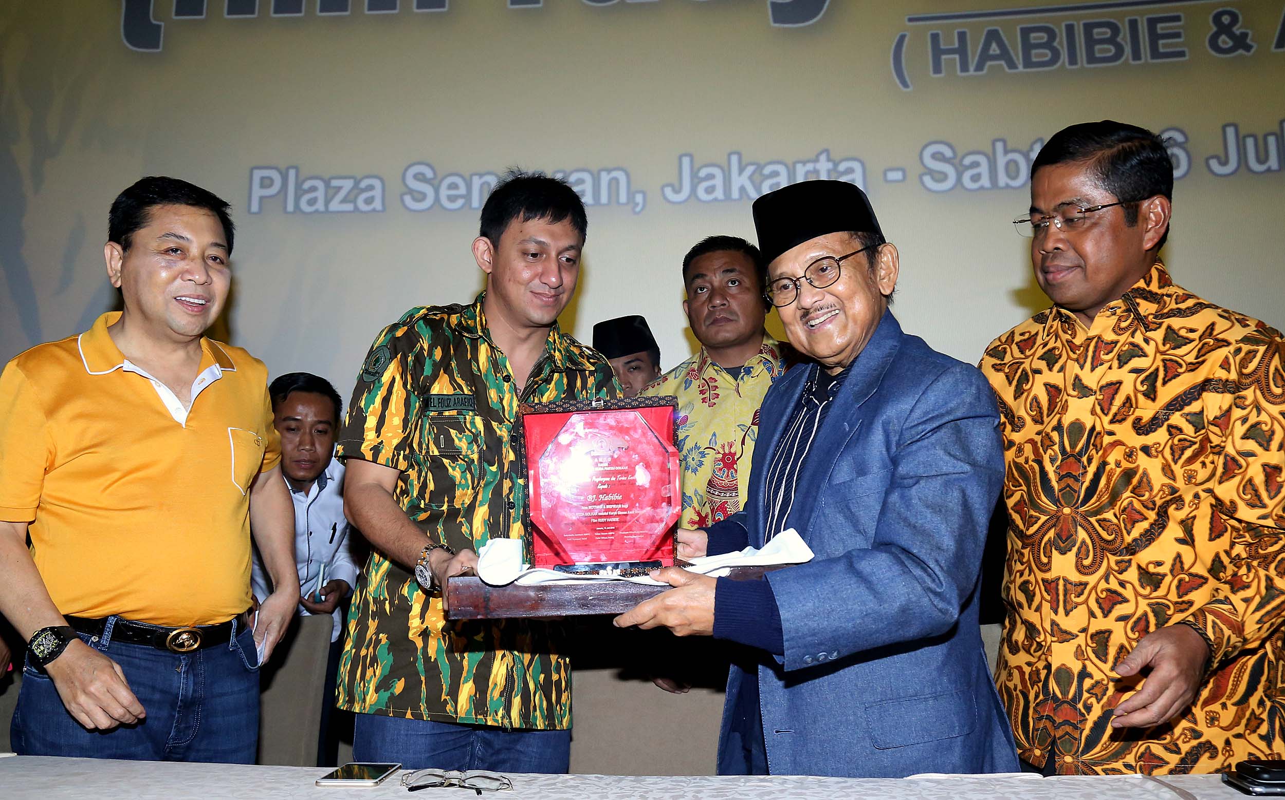 Ketua Umum AMPG Ketua Umum AMPG Fahd El Fouz Arafiq memberikan cinderamata kepada Presiden RI ke – 3 B.J Habibie dan didampingi Ketua Umum Partai Golkar Setya Novanto, Sekjen Partai Golkar Idrus Marham menghadiri nonton bareng film Rudy Habibie bersama B.J Habibie, di XX1 Plaza Senayan, Jakarta, Sabtu (16/7/2016). Kegiatan ini merupakan penghargaan kader muda Partai Golkar terhadap BJ Habibie sebagai tokoh bangsa yang dapat menginspirasi anak muda.