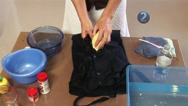 Sebelum mengambil baju, cuci kembali dengan pelembut kain pada bilasan terakhir. Tariklah apapun yang bisa Anda ambil kemudian keringkan. Gunakan scrub spons kering untuk menghilangkan sisa bintik noda membandel.