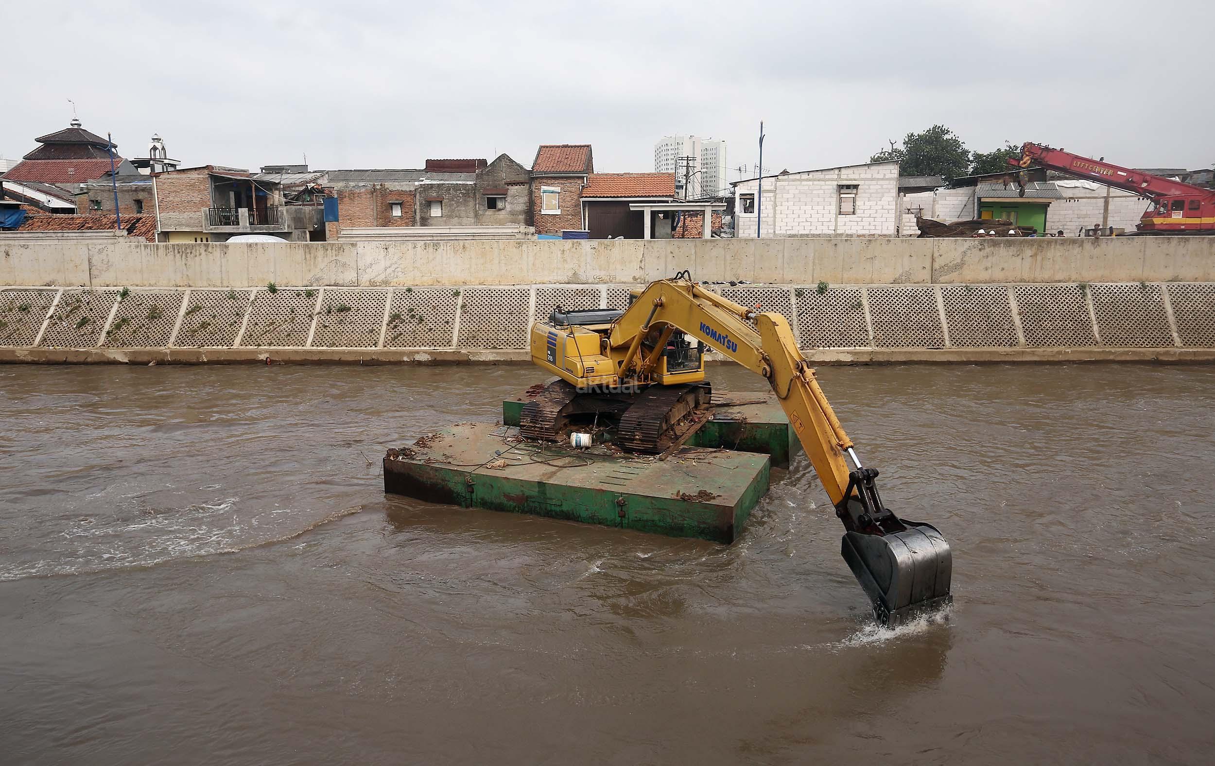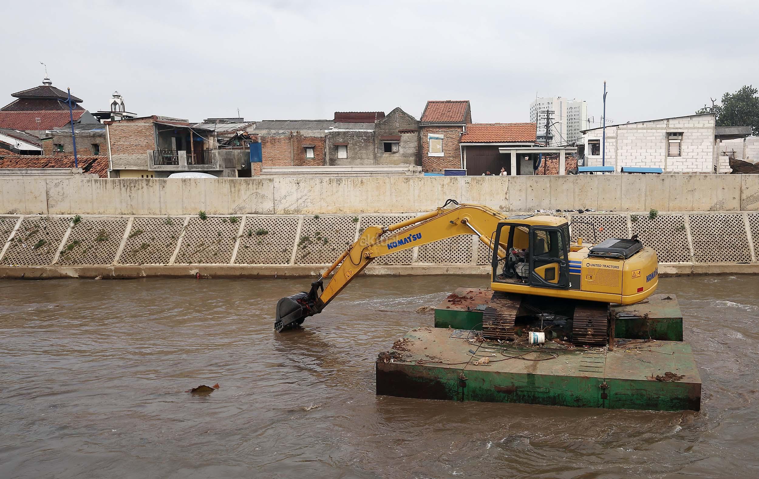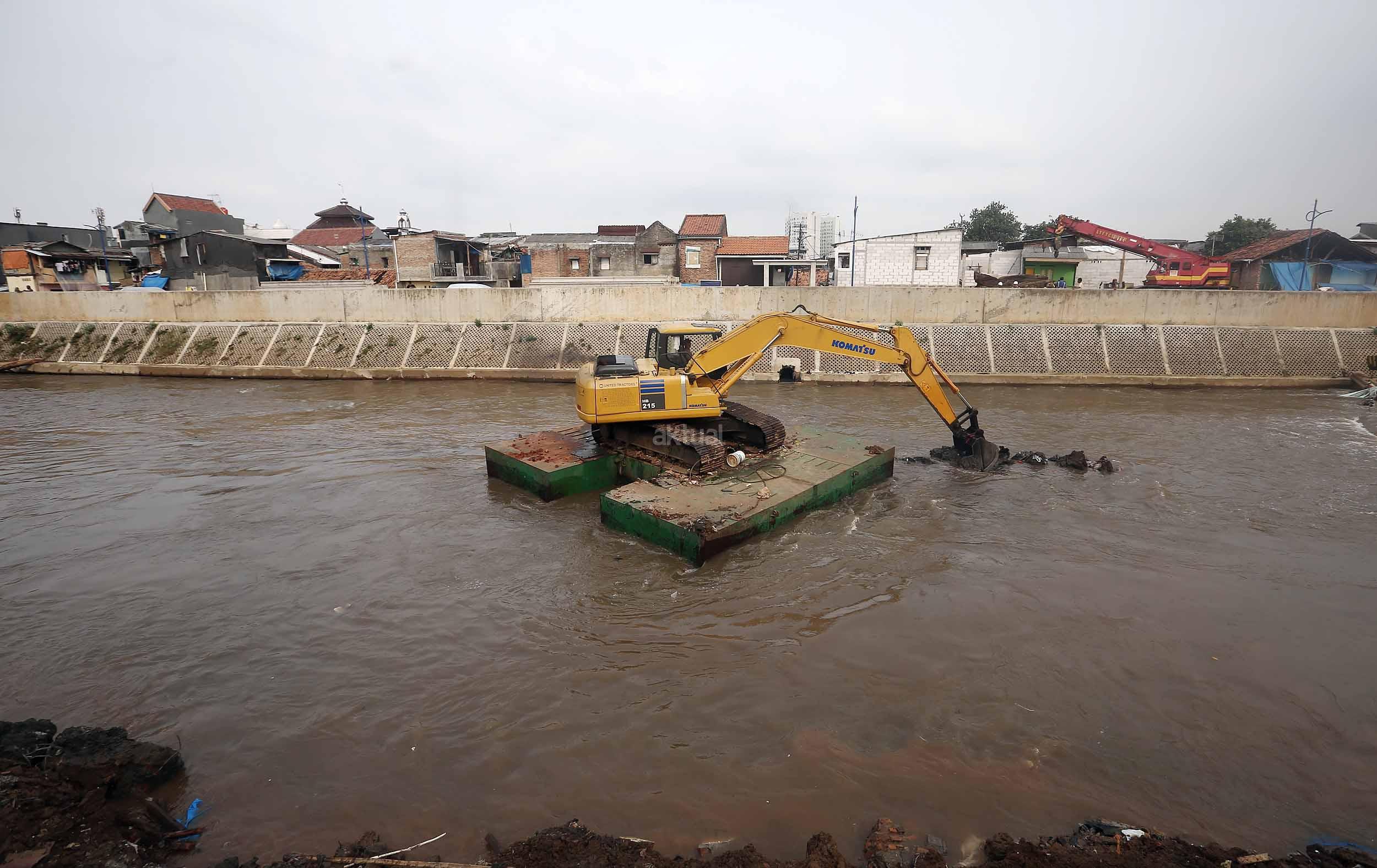 Alat berat ekskavator mengeruk lumpur di Sungai Ciliwung, Jakarta, Kamis (15/9/2016). Pengurukan lumpur dilakukan untuk mencegah pendangkalan air sungai Ciliwung dan antisipasi bahaya banjir di Jakarta .