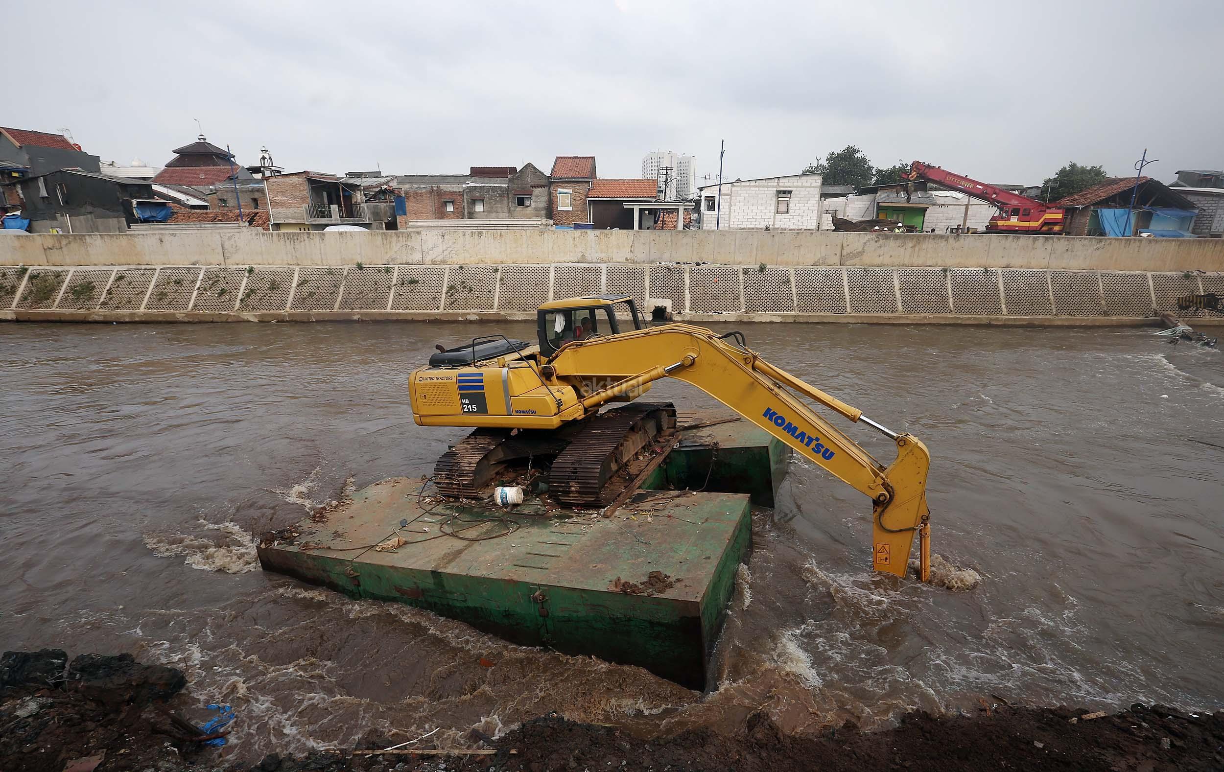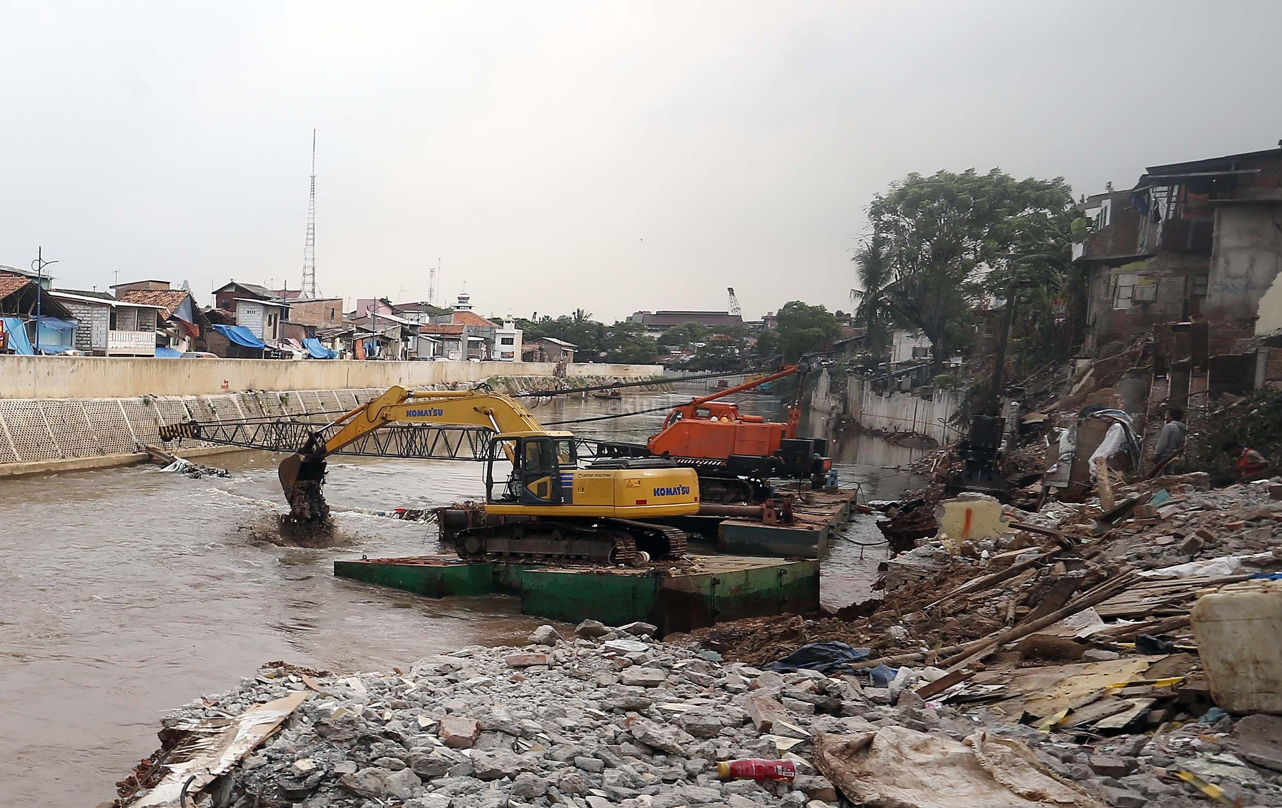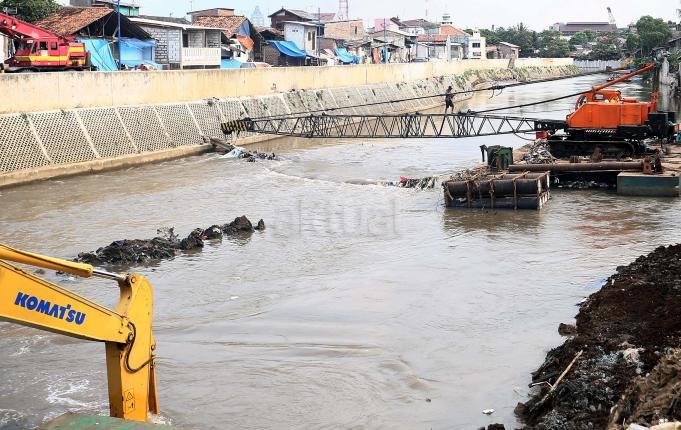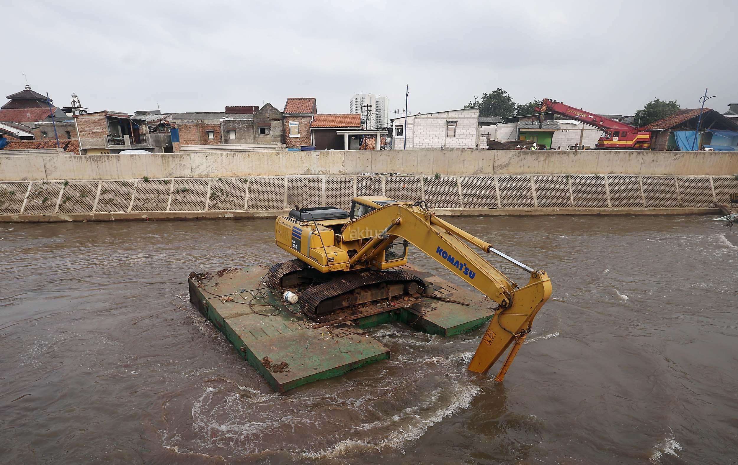 Alat berat ekskavator mengeruk lumpur di Sungai Ciliwung, Jakarta, Kamis (15/9/2016). Pengurukan lumpur dilakukan untuk mencegah pendangkalan air sungai Ciliwung dan antisipasi bahaya banjir di Jakarta .