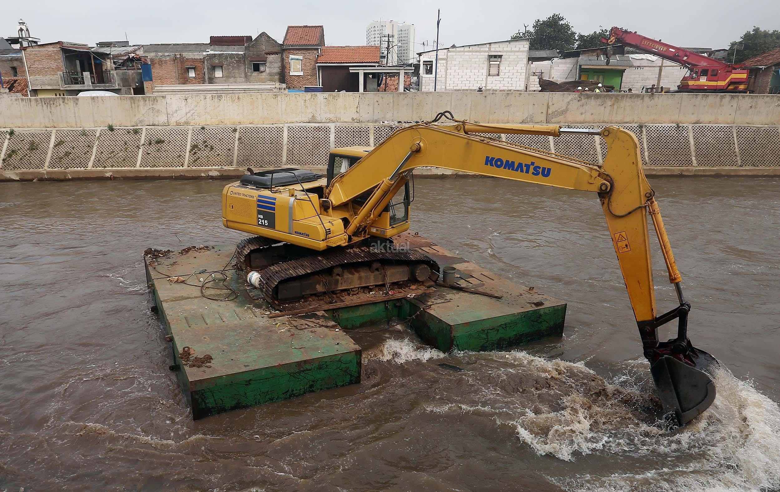 Alat berat ekskavator mengeruk lumpur di Sungai Ciliwung, Jakarta, Kamis (15/9/2016). Pengurukan lumpur dilakukan untuk mencegah pendangkalan air sungai Ciliwung dan antisipasi bahaya banjir di Jakarta. AKTUAL/MUNZIR
