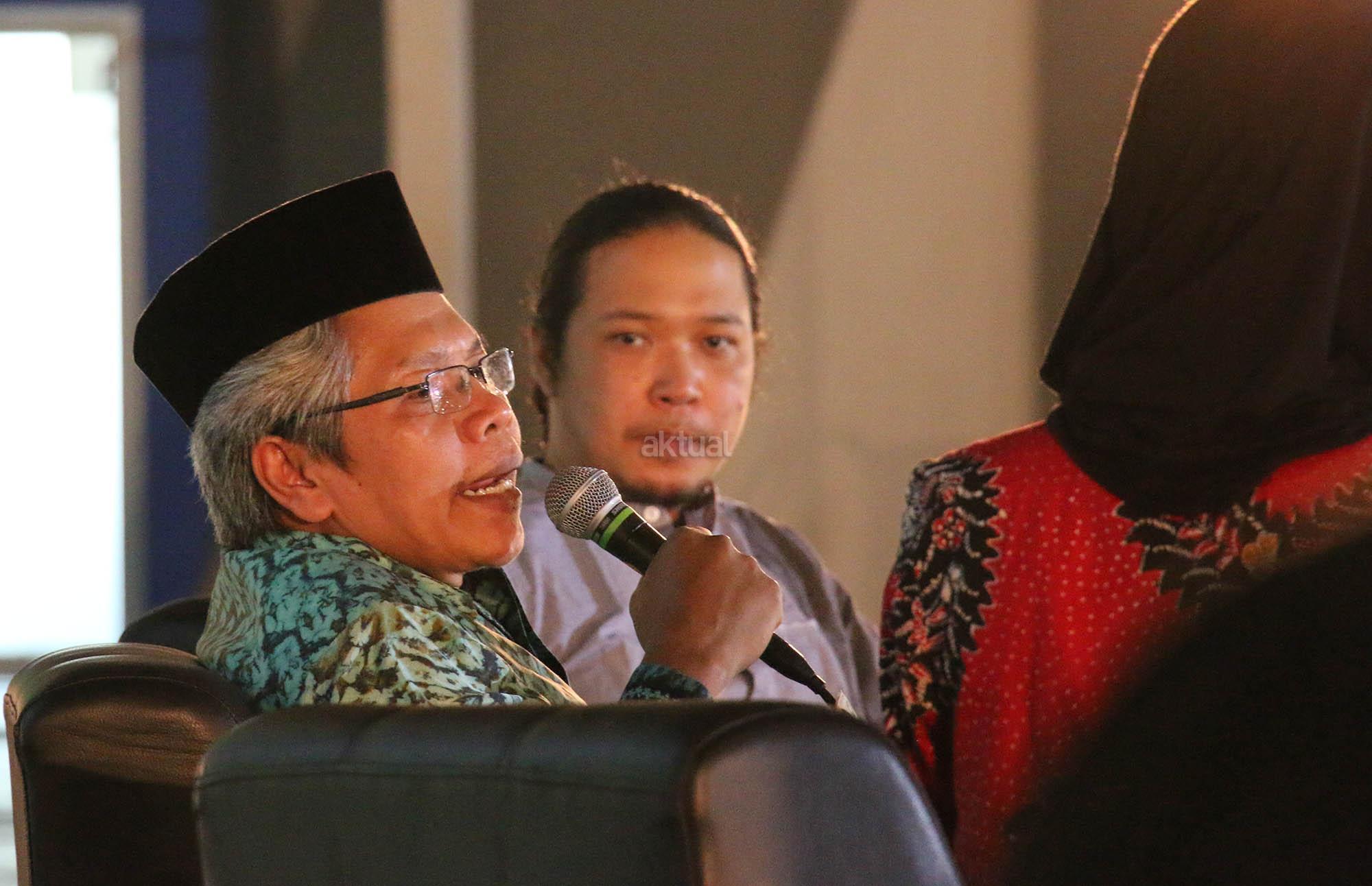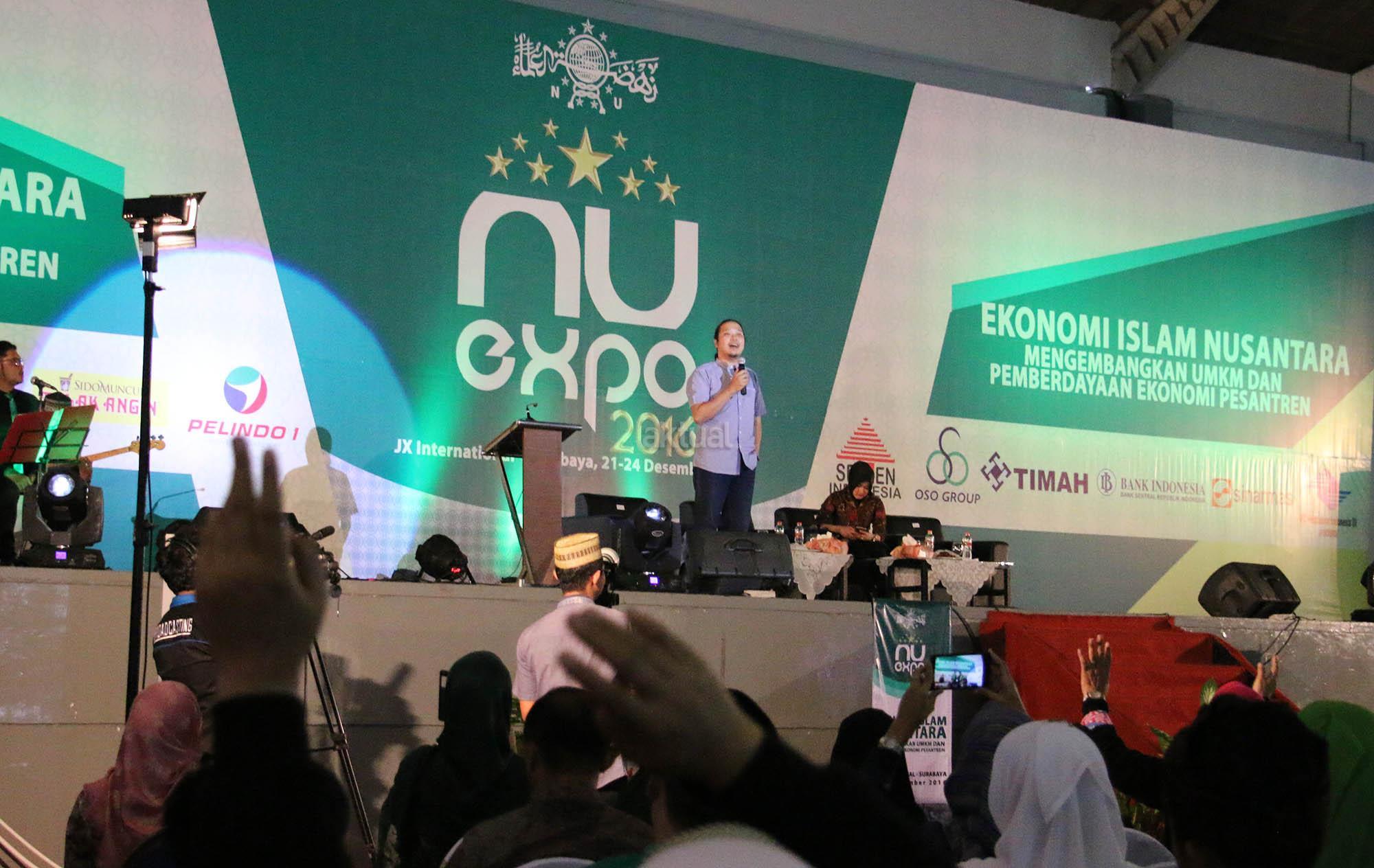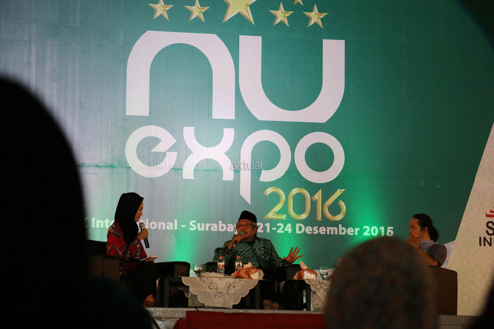 NU Expo Wakil Sekretaris Jenderal PBNU Suwadi Damartyas Pranoto (tengah) dan Wakil Ketua Lesbumi PBNU (Vocalis Noe Letto), Sabrang Mowo Damar Panuluh (kanan) saat melakukan diskusi pada acara NU Expo 2016 dengan tema “Ekonomi Islam Nusantara Mengembangkan UMKM dan Pemberdayaan Ekonomi Pesantren” di JI Expo, Surabaya, Sabtu (24/12/2016). Diskusi ini membahas peran dan sejarah ekonomi Nahdlatul Ulama dari masa ke masa. Di sela diskusi ini Sabrang Mowo Damar Panuluh (Noe Letto) menghibur pengunjung dengan menyanyikan beberapa lagunya. AKTUAL/HO