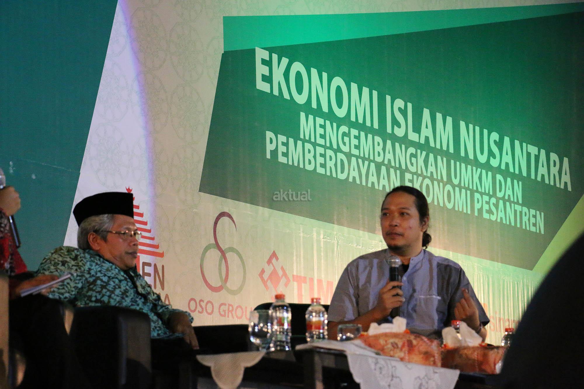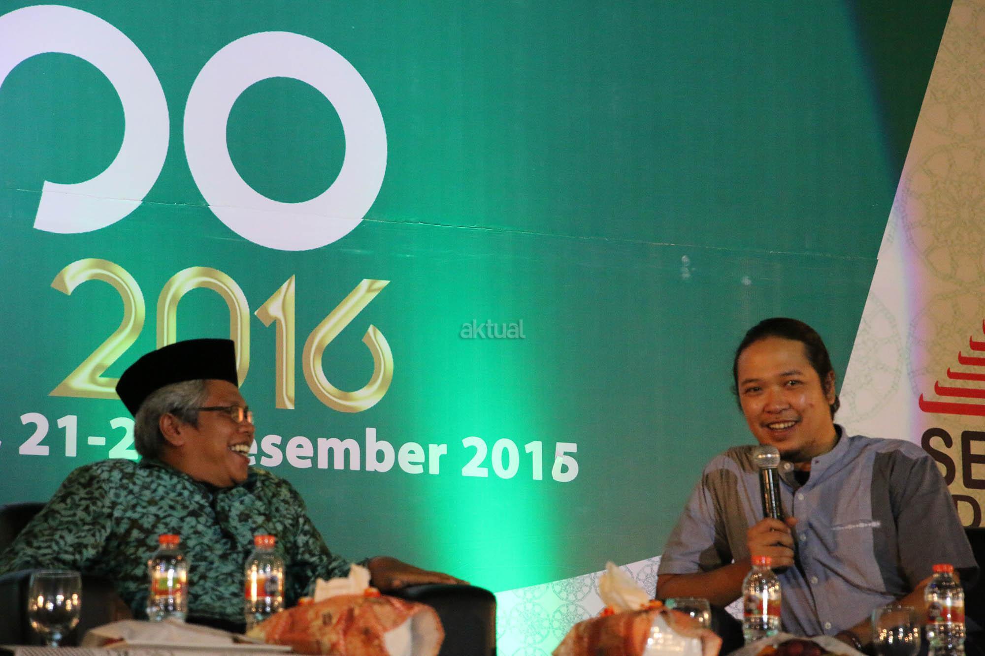 NU Expo Wakil Sekretaris Jenderal PBNU Suwadi Damartyas Pranoto dan Wakil Ketua Lesbumi PBNU (Vocalis Noe Letto), Sabrang Mowo Damar Panuluh (kanan) saat melakukan diskusi pada acara NU Expo 2016 dengan tema “Ekonomi Islam Nusantara Mengembangkan UMKM dan Pemberdayaan Ekonomi Pesantren” di JI Expo, Surabaya, Sabtu (24/12/2016). Diskusi ini membahas peran dan sejarah ekonomi Nahdlatul Ulama dari masa ke masa. Di sela diskusi ini Sabrang Mowo Damar Panuluh (Noe Letto) menghibur pengunjung dengan menyanyikan beberapa lagunya. AKTUAL/HO