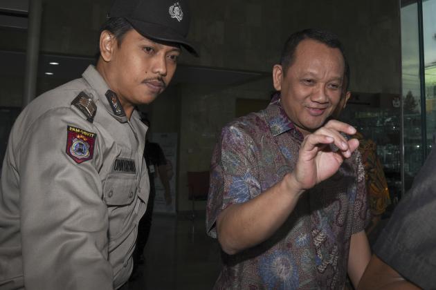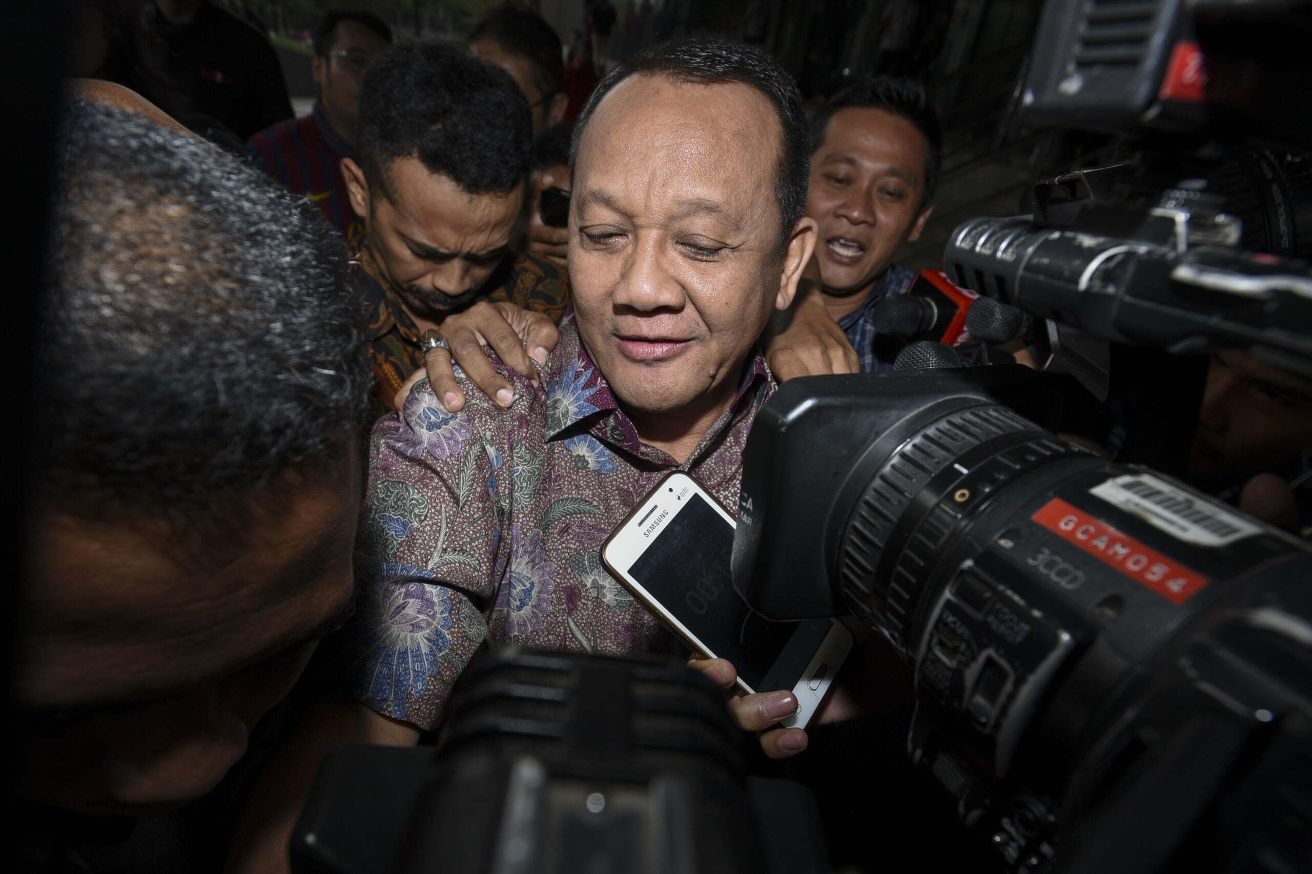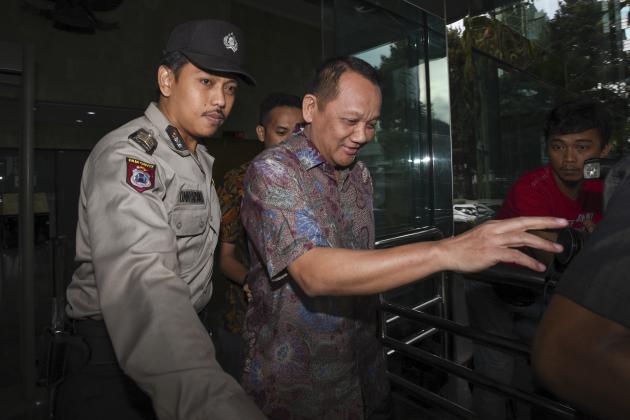 Sekretaris Mahkamah Agung (MA) Nurhadi (kanan) berjalan dikawal petugas seusai menjalani pemeriksaan di Gedung KPK, Jakarta, Rabu (15/6). Nurhadi diperiksa KPK sebagai saksi terkait kasus dugaan suap pengajuan Peninjauan Kembali (PK) atas perkara di Pengadilan Negeri Jakarta Pusat dengan tersangka tersangka Doddy Aryanto Supeno. ANTARA FOTO/Hafidz Mubarak A./aww/16.