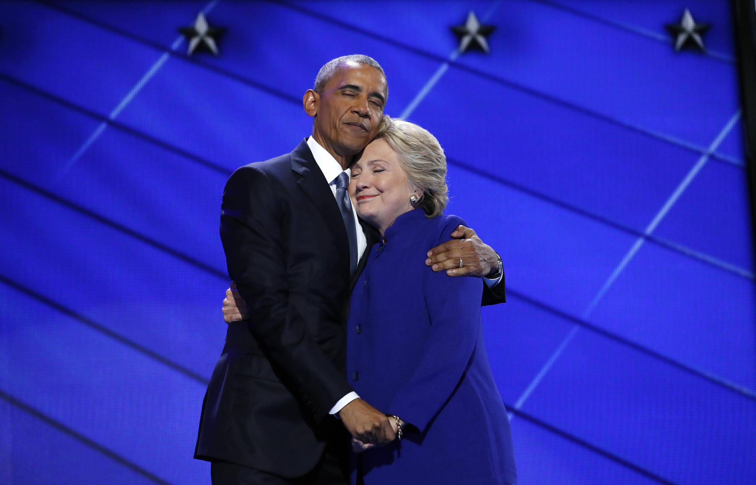 Calon presiden Amerika Serikat dari Partai Demokrat Hillary Clinton memeluk Presiden Amerika Serikat Barack Obama saat ia naik ke panggung diakhir pidatonya pada hari ketiga Konvensi Nasional Demokrat 2016 di Philadelphia, Pennsylvania, Amerika Serikat, Rabu (27/7). ANTARA FOTO/REUTERS/Jim Young/cfo/16