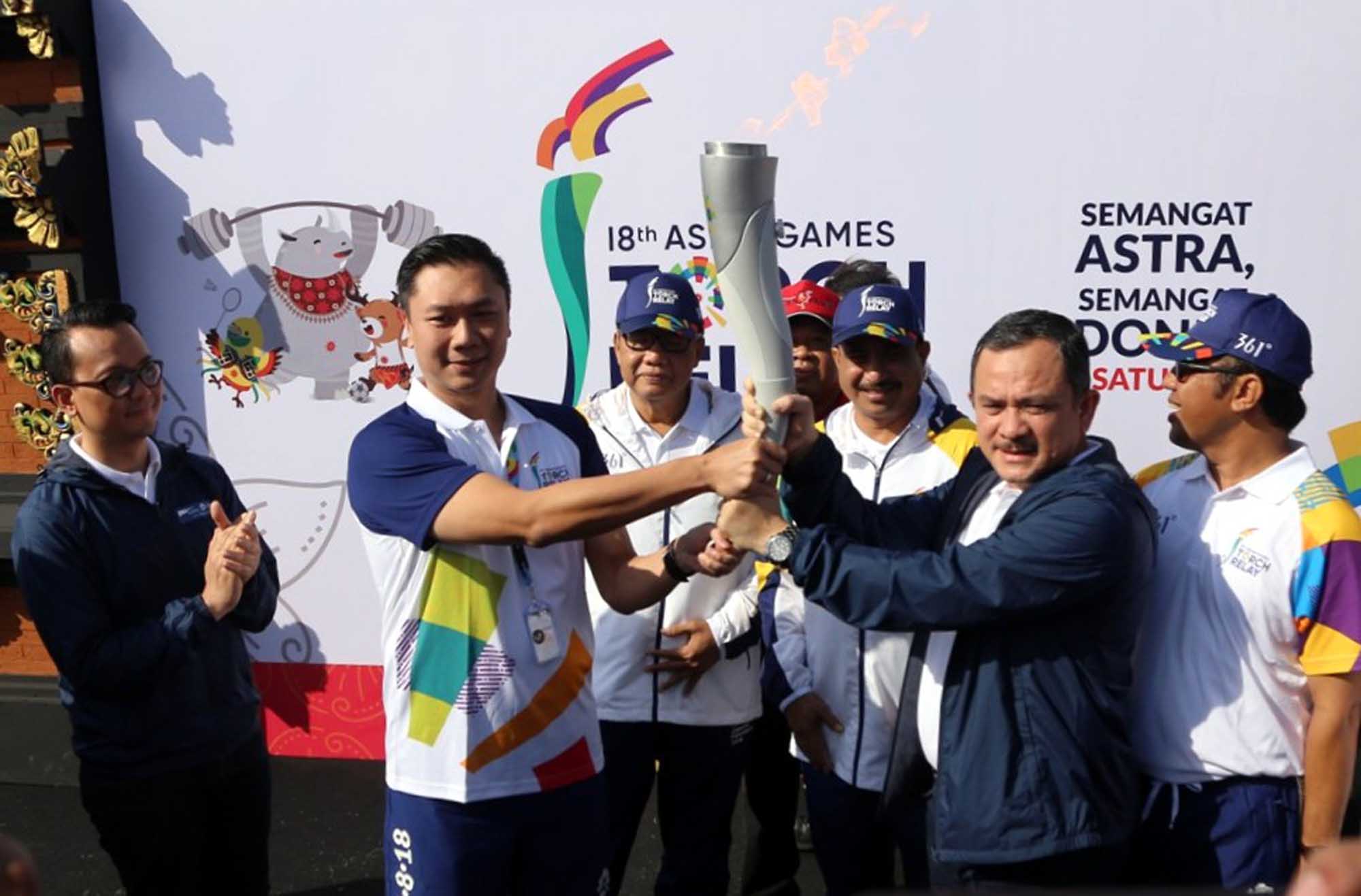 Menteri Pariwisata RI Arief Yahya (ketiga kanan) dan Menteri Koperasi, UMKM RI A.A.G.N Puspayoga (ketiga kiri), Head of Corporate Communications PT Astra International Tbk Boy Kelana Soebroto (kiri) dan Wakil Walikota Denpasar I Gusti Ngurah Jaya Negara (kanan) menyaksikan penyerahan obor dari Head of Environment & Social Responsibility PT Astra International Tbk Riza Deliansyah (kedua kanan) kepada Ketua Koordinator Wilayah Grup Astra Bali Haris Prasetya (kedua kiri) sebagai torch bearer pada pawai obor di Banjar Berseri Astra Denpasar, Pulugambang, Denpasar, Bali, Selasa (24/7). AKTUAL/Astra Internasional
