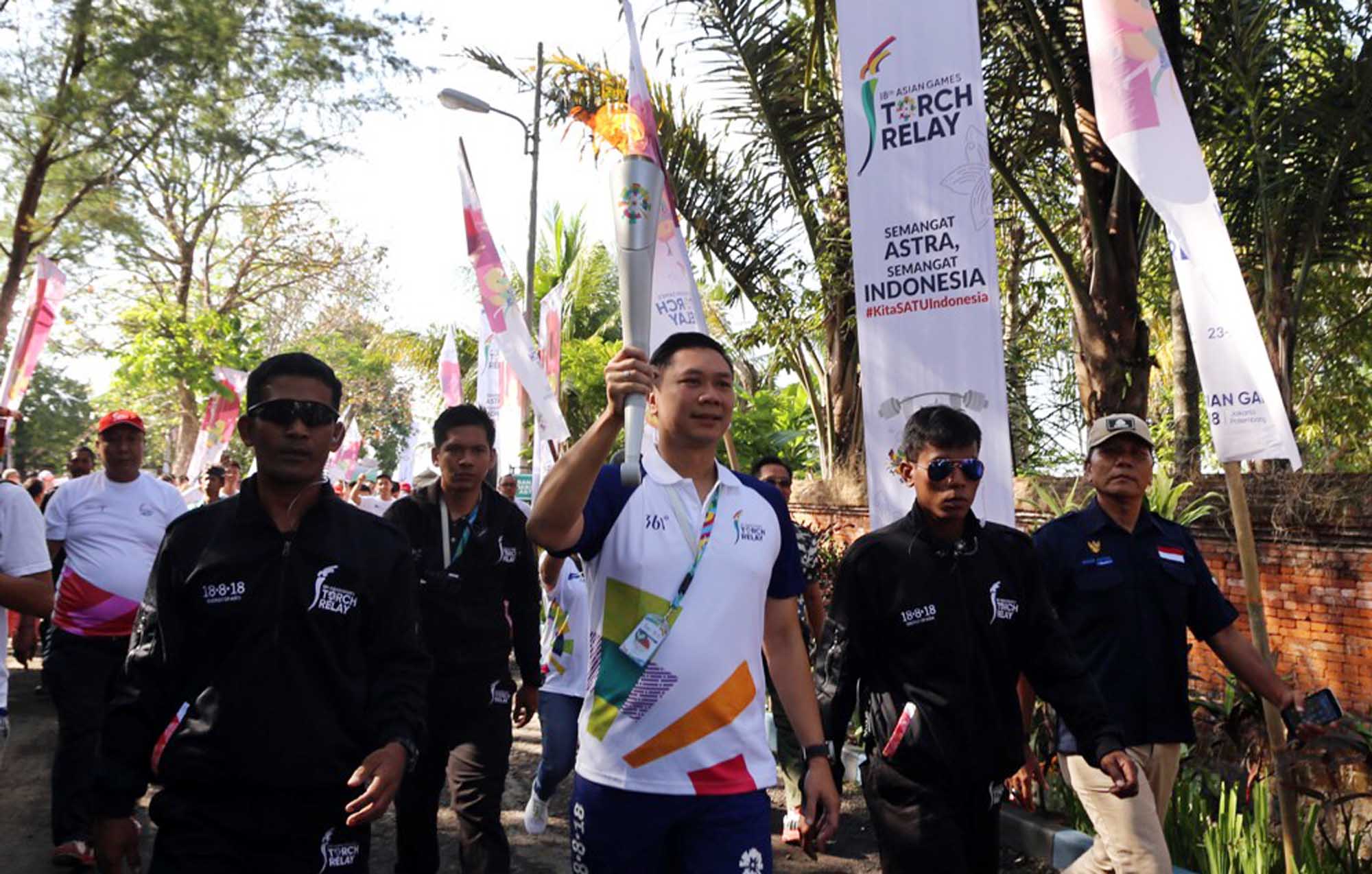 Ketua Koordinator Wilayah Grup Astra Bali Haris Prasetya membawa api obor Asian Games 2018 melewati Banjar Berseri Astra Denpasar, Bali, Selasa (24/7). AKTUAL/Astra Internasional