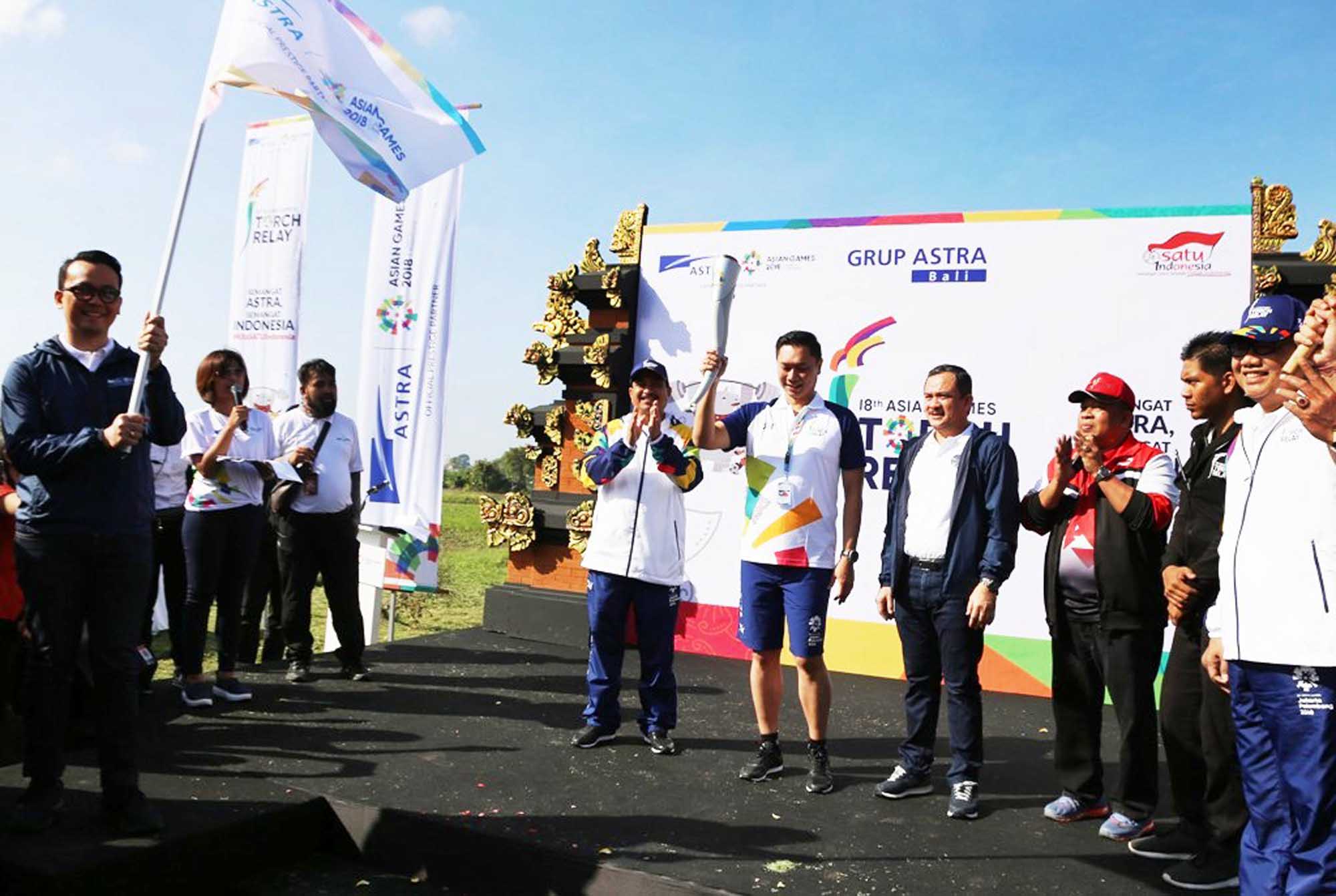 Menteri Pariwisata RI Arief Yahya (keempat kiri), Menteri Koperasi & UMKM RI A.A.G.N Puspayoga (kanan) dan Head of Environment & Social Responsibility PT Astra International Tbk Riza Deliansyah (keempat kanan) menyaksikan Head of Corporate Communications PT Astra International Tbk Boy Kelana Soebroto (kiri) melakukan pelepasan Ketua Koordinator Wilayah Grup Astra Bali Haris Prasetya (memegang obor) sebagai torch bearer di Banjar Berseri Astra, Pulugambang, Denpasar, Bali, Selasa (24/7). AKTUAL/Astra Internasional