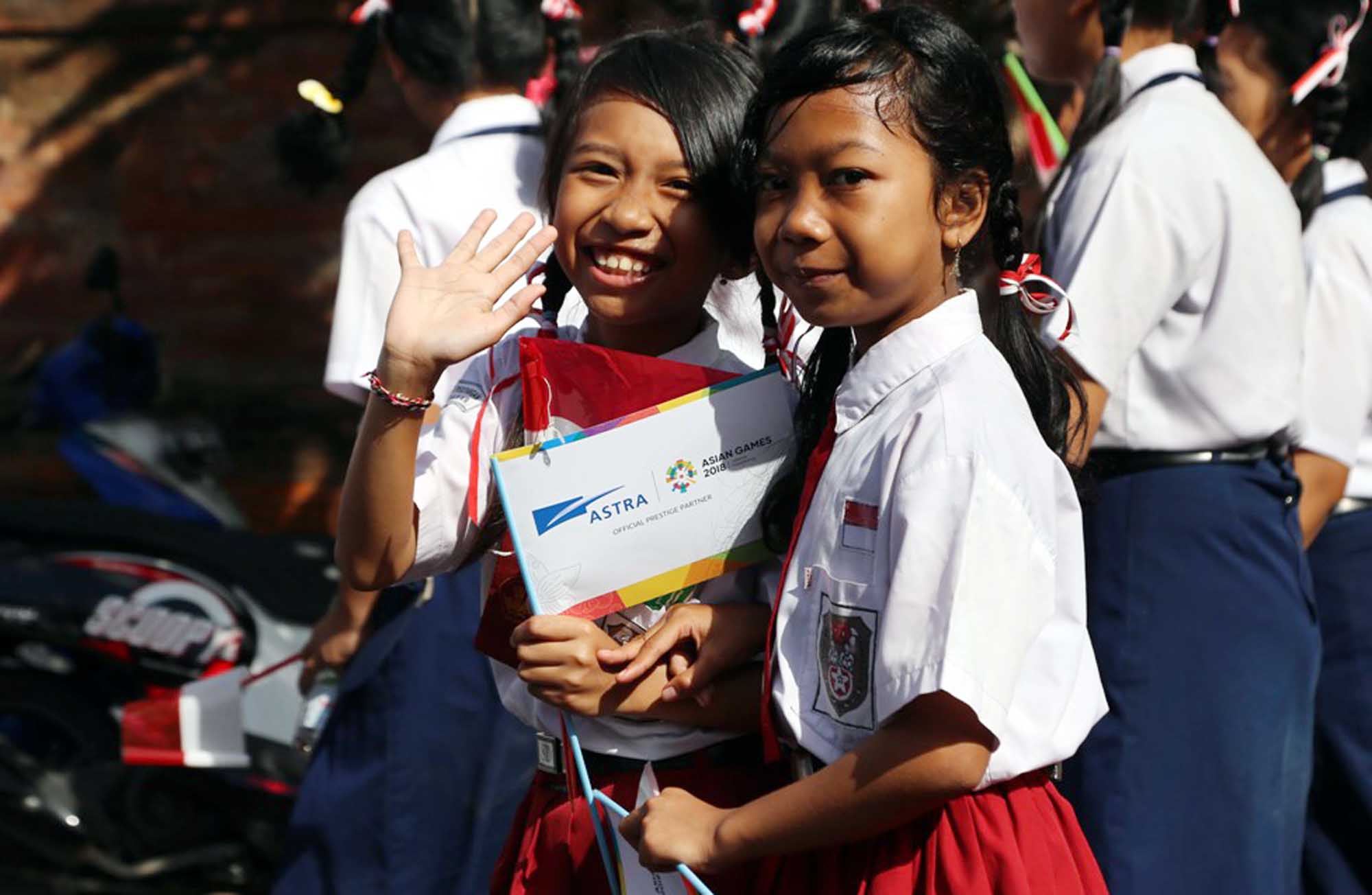 Siswa-siswi sekolah di Denpasar, Bali turut meramaikan pawai obor Asian Games 2018 di Banjar Berseri Astra, Pulugambang, Denpasar, Bali, Selasa (24/7). AKTUAL/Astra Internasional