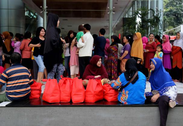 Warga antre untuk mengambil sembako gratis yang dibagikan Bank OCBC NISP di Jakarta, Selasa (21/6). Pada Ramadan tahun ini, Bank OCBC NISP kembali menunjukkan kepeduliannya dengan menyalurkan 2.500 paket sembako untuk anak yatim, janda, dan petugas masjid serta paket sembako murah.AKTUAL/TINO OKTAVIANO