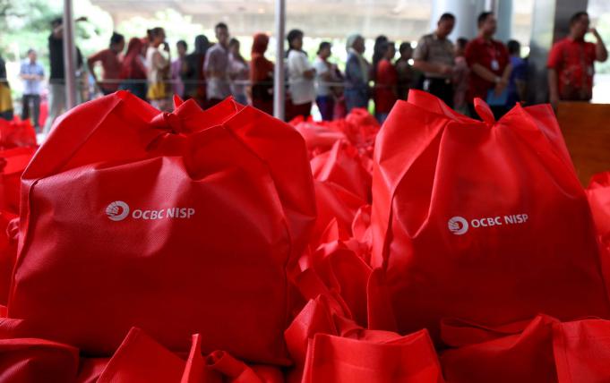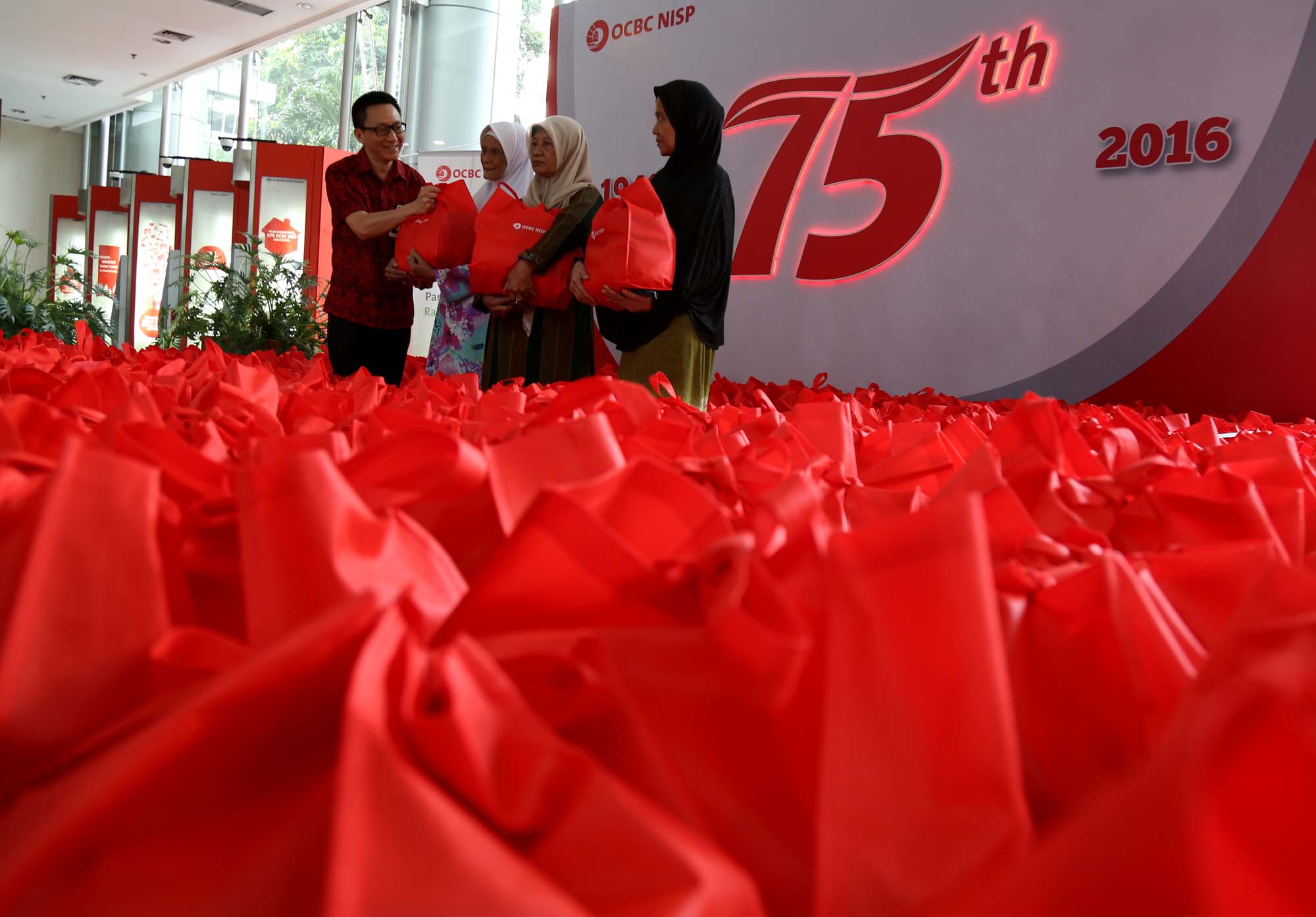 Direktur Bank OCBC NISP Rama P Kusumaputra (kiri) memberikan paket sembako gratis kepada warga di loby Bank OCBC NISP di Jakarta, Selasa (21/6). Pada Ramadan tahun ini, Bank OCBC NISP kembali menunjukkan kepeduliannya dengan berbagi dengan menyalurkan 2.500 paket sembako untuk anak yatim, janda dan petugas masjid serta paket sembako murah. AKTUAL/TINO OKTAVIANO