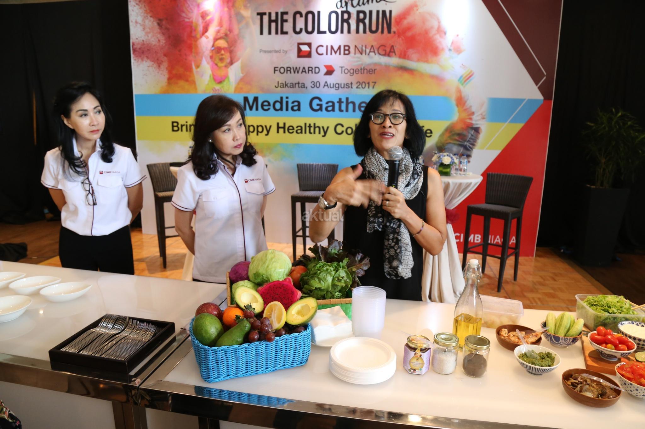 Direktur Consumer Banking CIMB Niaga Lani Darmawan tengah) bersama Direktur Compliance, Corporate Secretary & Legal CIMB Niaga Fransiska Oey (kiri) melihat Founder of Welldressed Sutji Sosrowardojo menyajikan makana sehat saat media gathering dan sosialisasi “The Color Run 2017 Dream World Tour” di Glass House, Ritz Carlton, Jakarta, Rabu (30/8). PT Bank CIMB Niaga Tbk mengajak semua pelari warna untuk menerapkan gaya hidup sehat serta membawa kebahagiaan, kesehatan, dan penuh warna dalam kehidupan sehari-hari untuk keempat kalinya menggelar The Color Run pada awal Oktober mendatang di kawasan Gelora Bung Karno Jakarta. Peserta The Color Run yang akan menempuh trek sepanjang 5 km ini selain dimanjakan dengan hadirnya food trucks, fun zone, dan photobooth juga diajak untuk berbagi kebahagiaan dengan para penyandang khusus dari Yayasan Pembinaan Anak Cacat (YPAC) Nasional. AKTUAL/Tino Oktaviano