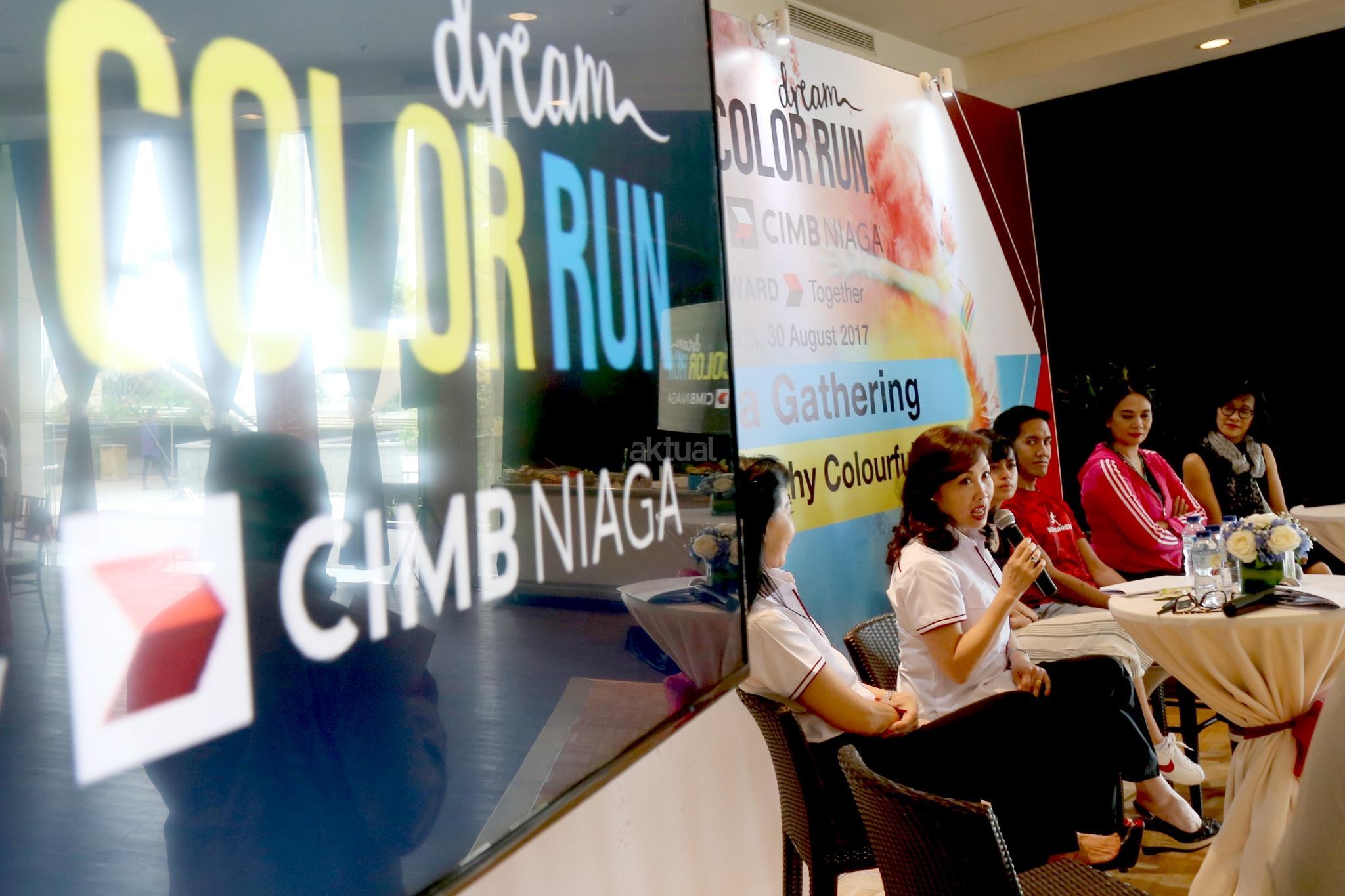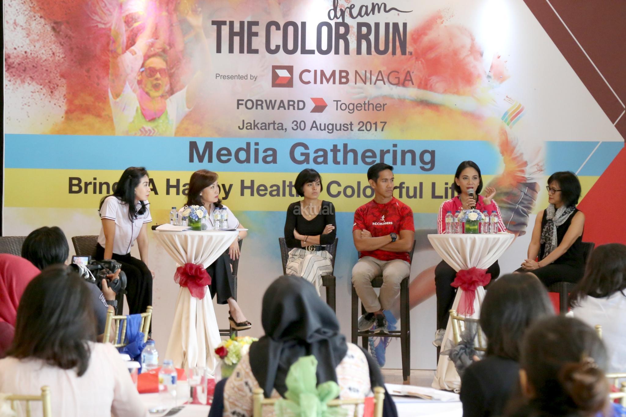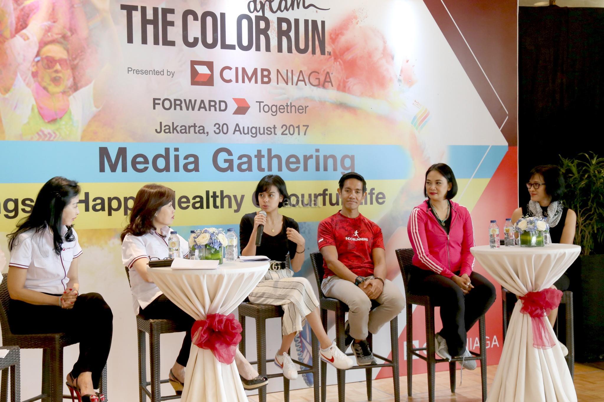Direktur Consumer Banking CIMB Niaga Lani Darmawan (kedua kiri) bersama Direktur Compliance, Corporate Secretary & Legal CIMB Niaga Fransiska Oey (kiri) dan Artis Eva Celia (ketiga kiri), Founder of Indorunner Reza Puspo (ketiga kanan), Artis Dian Nitami (kedua kanan) dan Founder of Welldressed Sutji Sosrowardojo saat media gathering dan sosialisasi "The Color Run 2017 Dream World Tour" di Glass House, Ritz Carlton, Jakarta, Rabu (30/8). PT Bank CIMB Niaga Tbk mengajak semua pelari warna untuk menerapkan gaya hidup sehat serta membawa kebahagiaan, kesehatan, dan penuh warna dalam kehidupan sehari-hari untuk keempat kalinya menggelar The Color Run pada awal Oktober mendatang di kawasan Gelora Bung Karno Jakarta. Peserta The Color Run yang akan menempuh trek sepanjang 5 km ini selain dimanjakan dengan hadirnya food trucks, fun zone, dan photobooth juga diajak untuk berbagi kebahagiaan dengan para penyandang khusus dari Yayasan Pembinaan Anak Cacat (YPAC) Nasional. AKTUAL/Tino Oktaviano